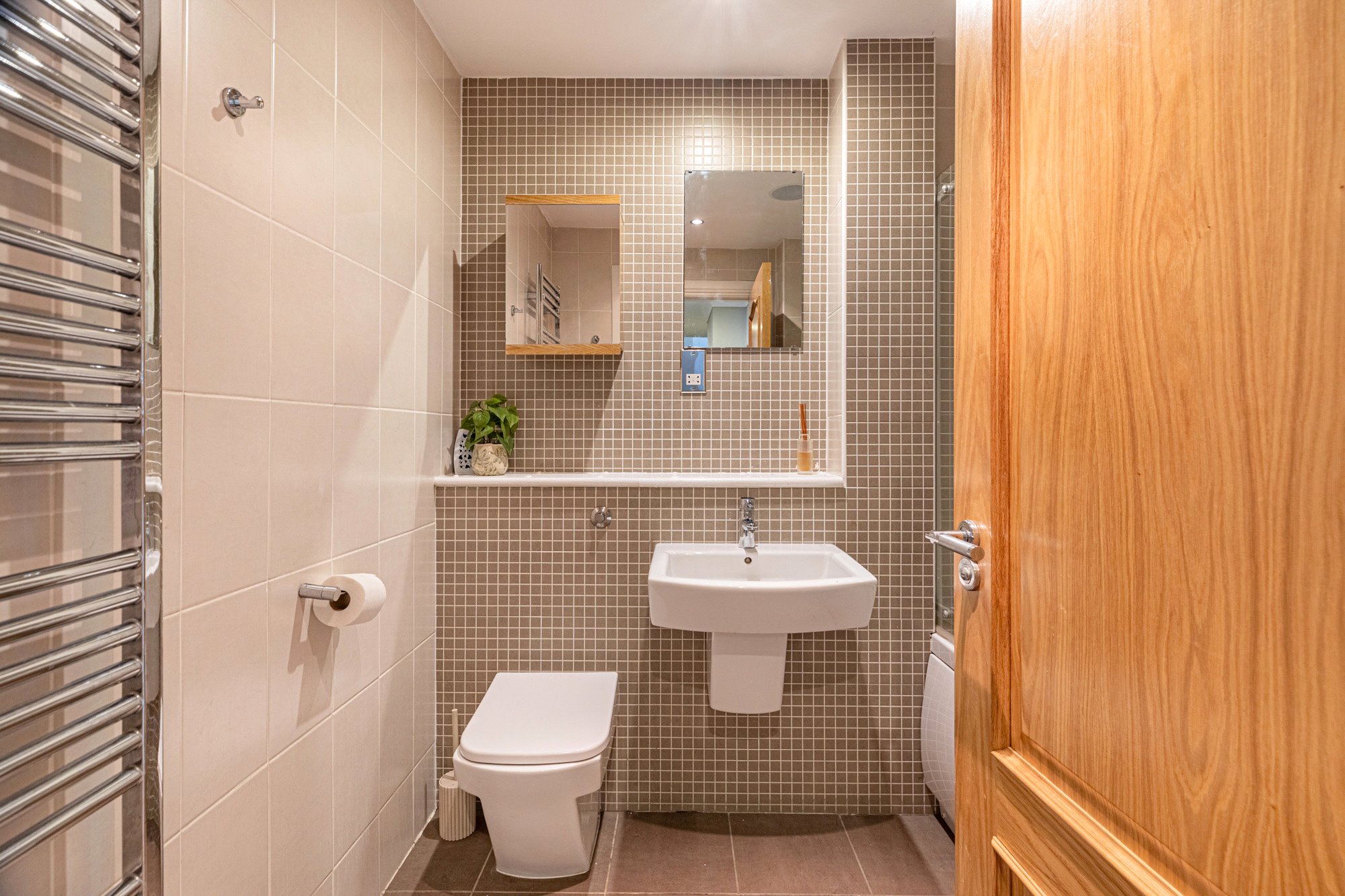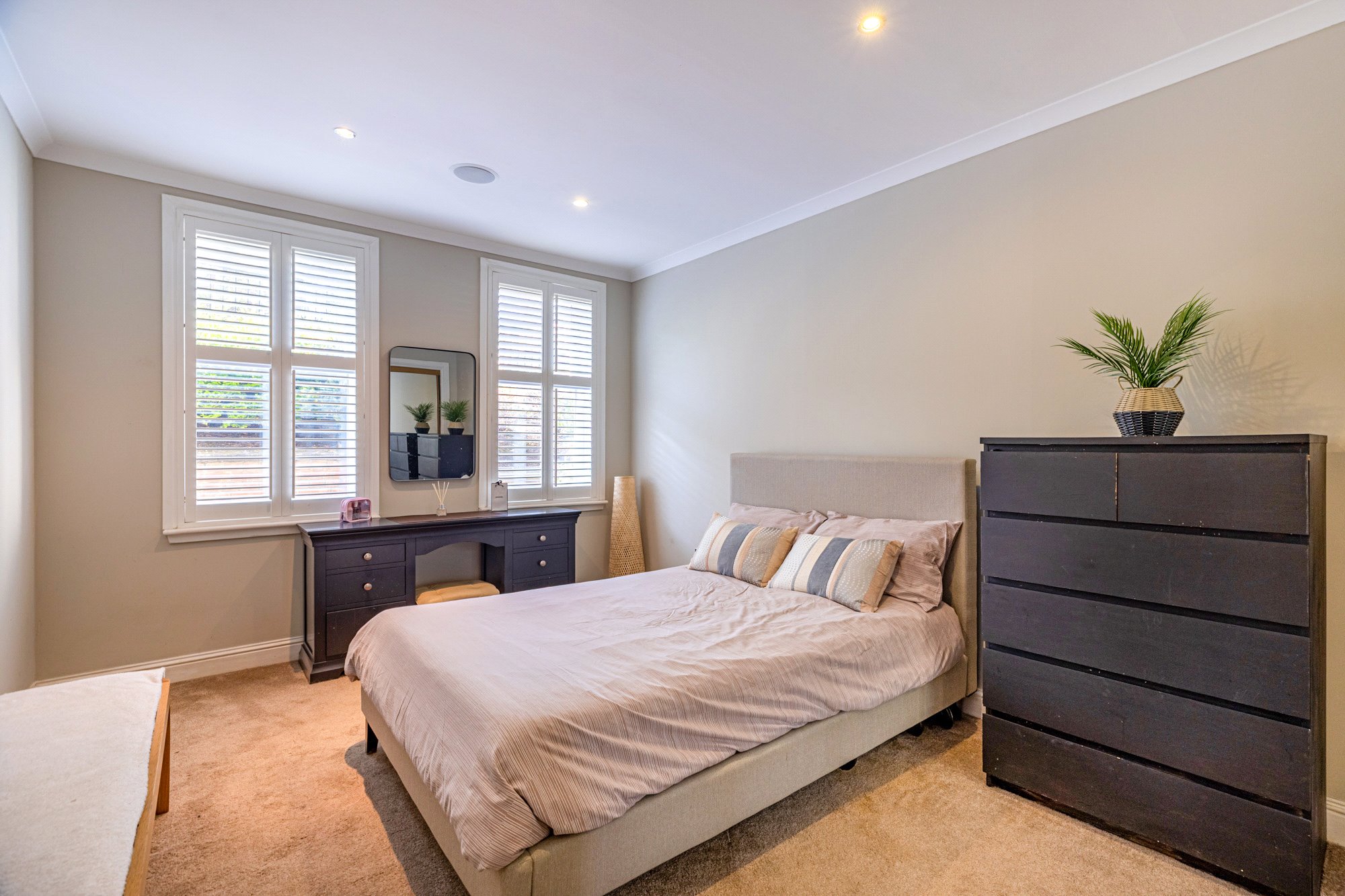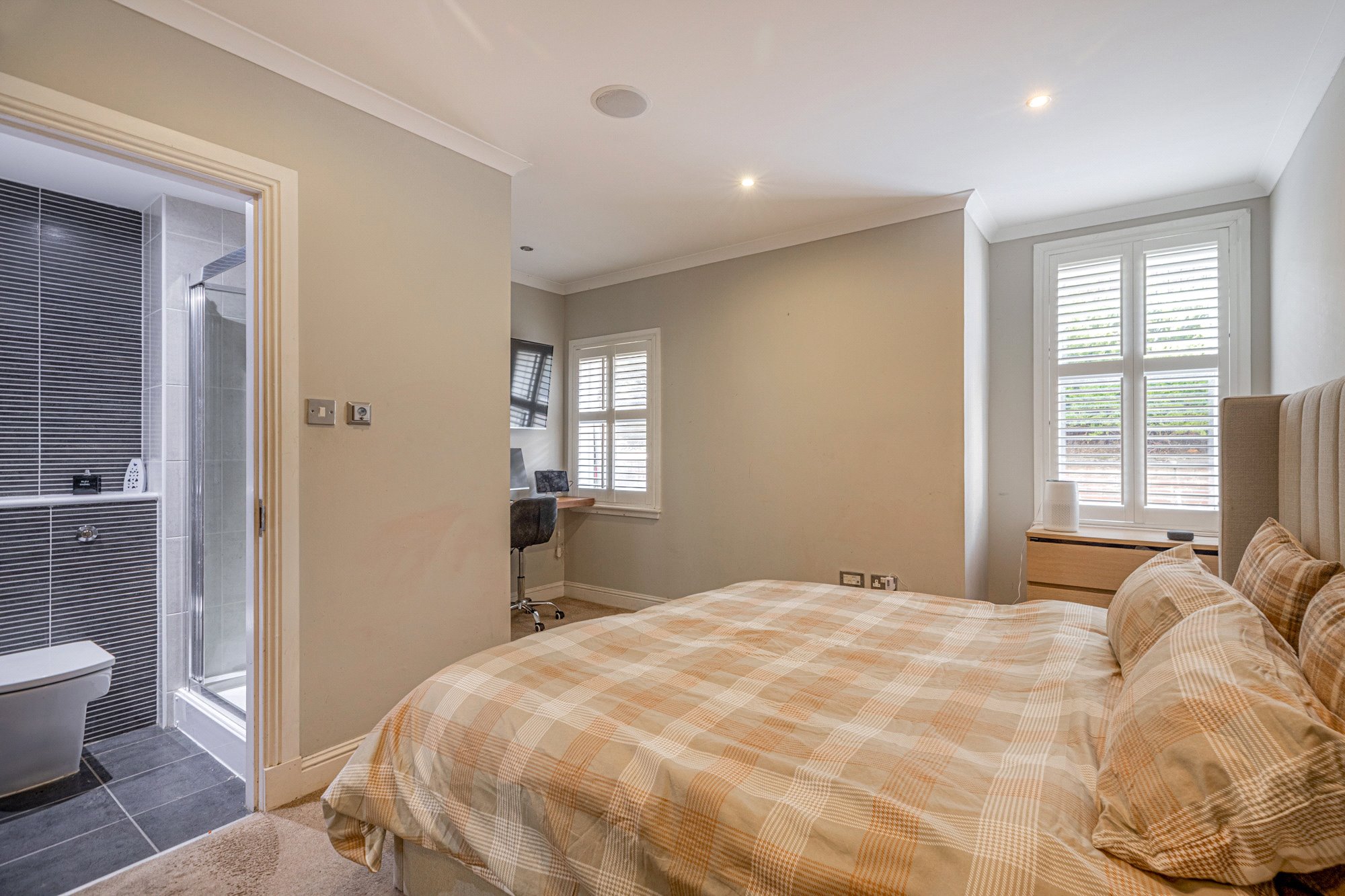 A staircase leads down to the garden level, where both bedrooms are located. Each bedroom is generously proportioned, fitted with built-in wardrobes, and provides a peaceful setting, ideal for rest and relaxation. The principal bedroom features an en-suite shower room with modern fittings, while a well-appointed guest bathroom completes the accommodation, offering a white three-piece suite with over-bath shower.