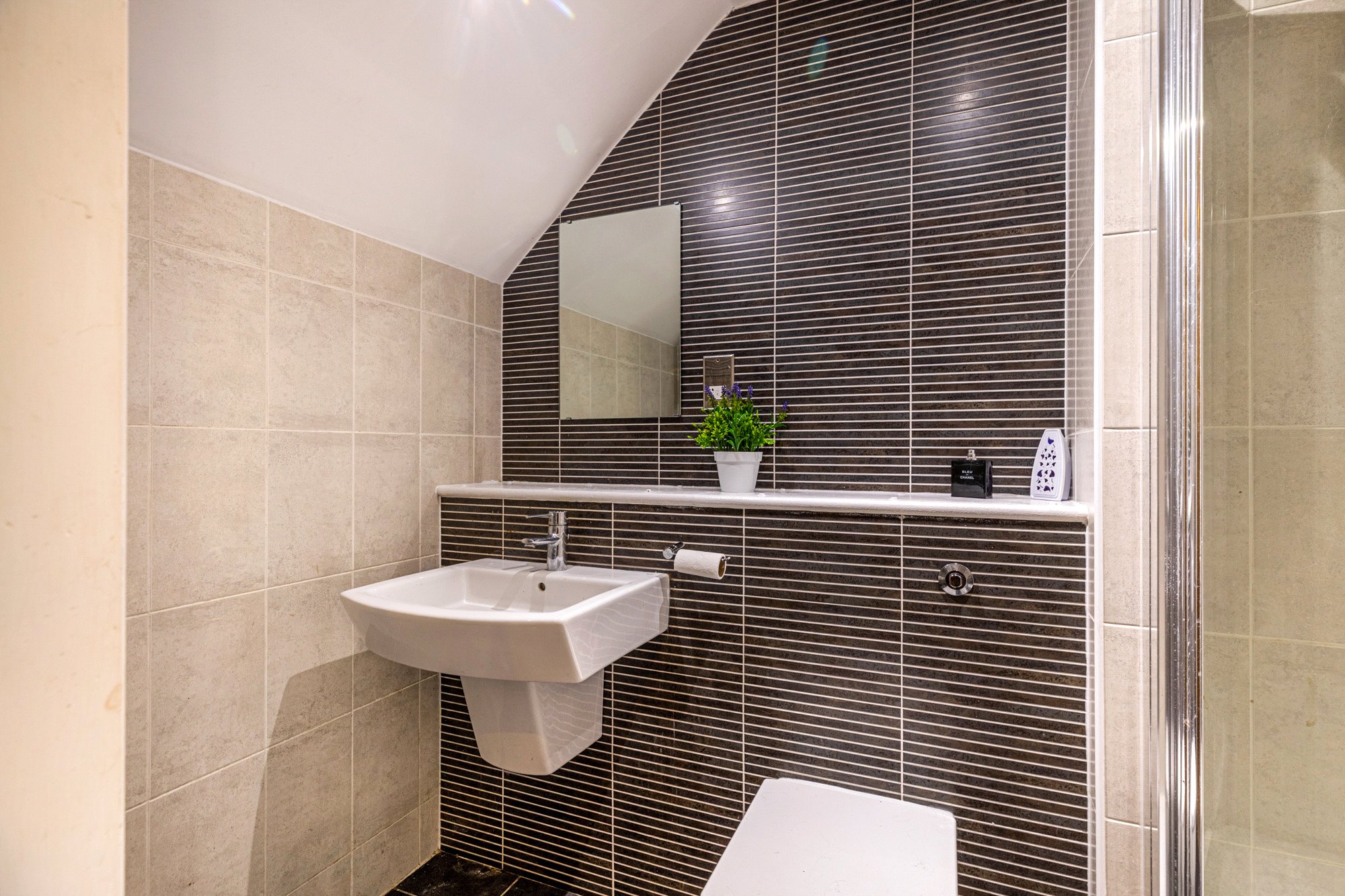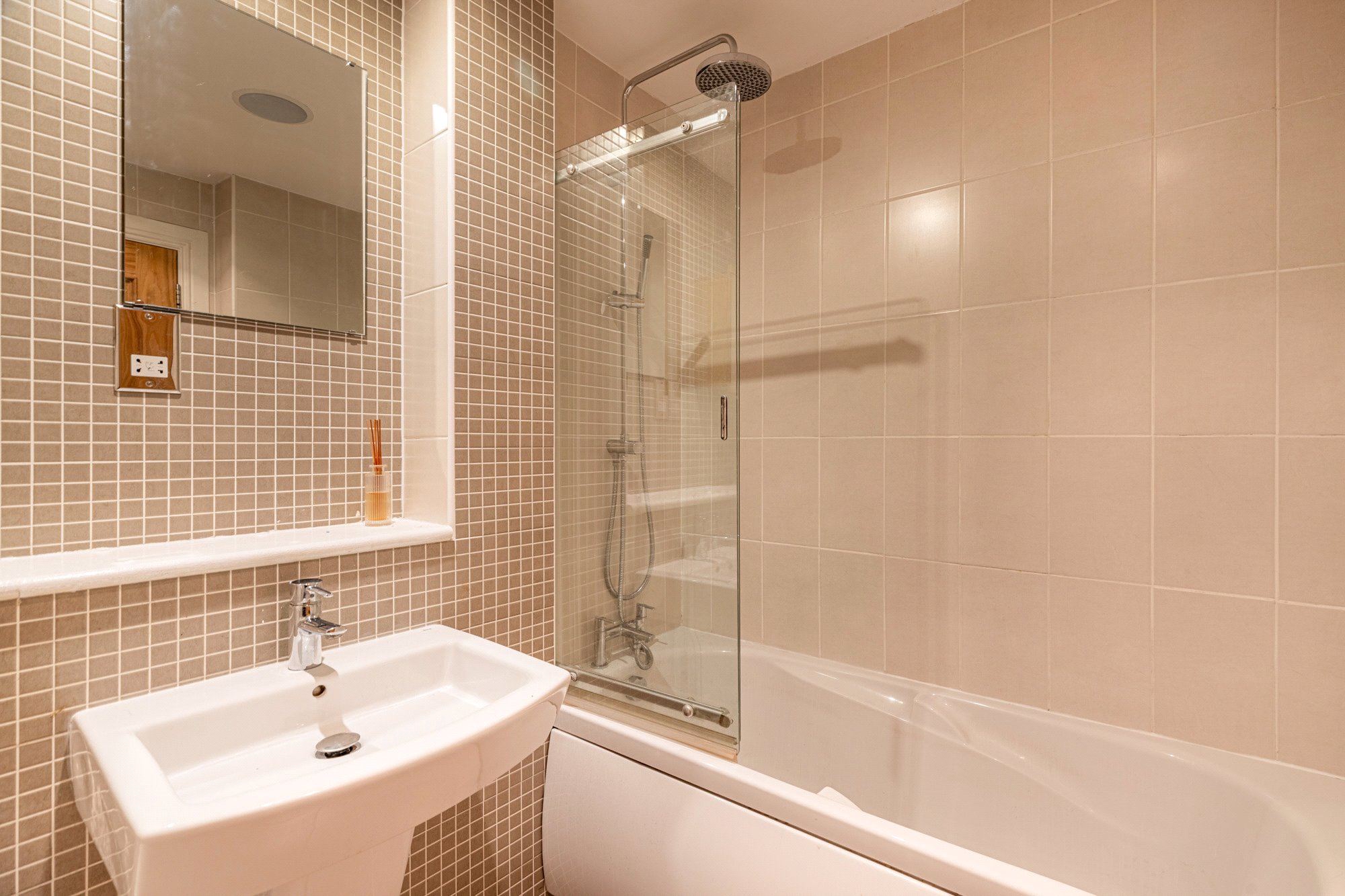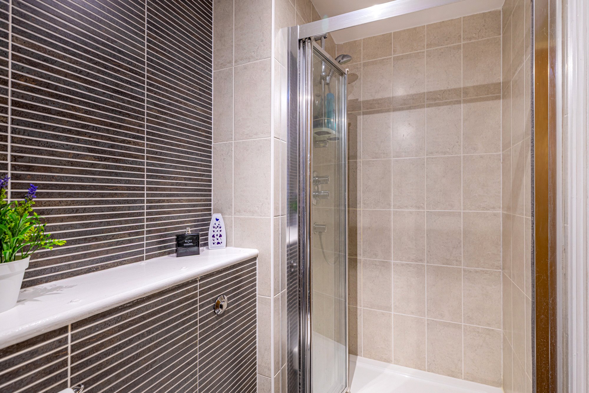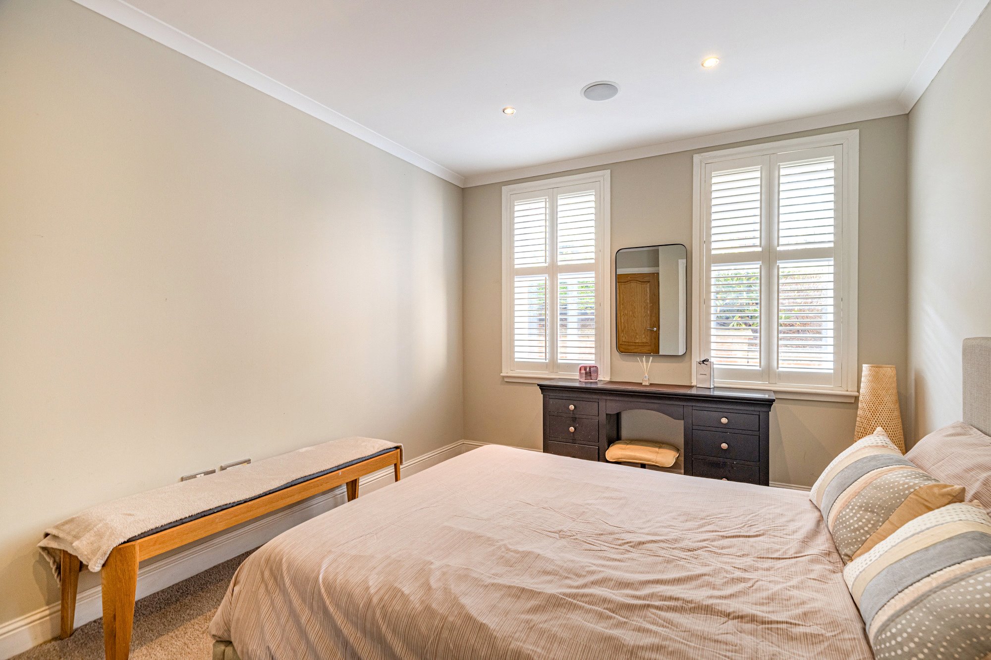 A staircase leads down to the garden level, where both bedrooms are located. Each bedroom is generously proportioned, fitted with built-in wardrobes, and provides a peaceful setting, ideal for rest and relaxation. The principal bedroom features an en-suite shower room with modern fittings, while a well-appointed guest bathroom completes the accommodation, offering a white three-piece suite with over-bath shower.