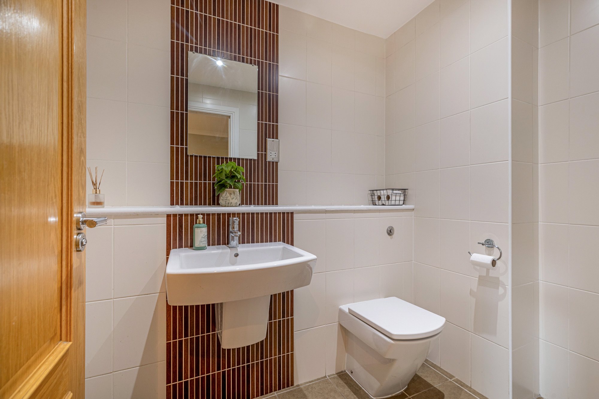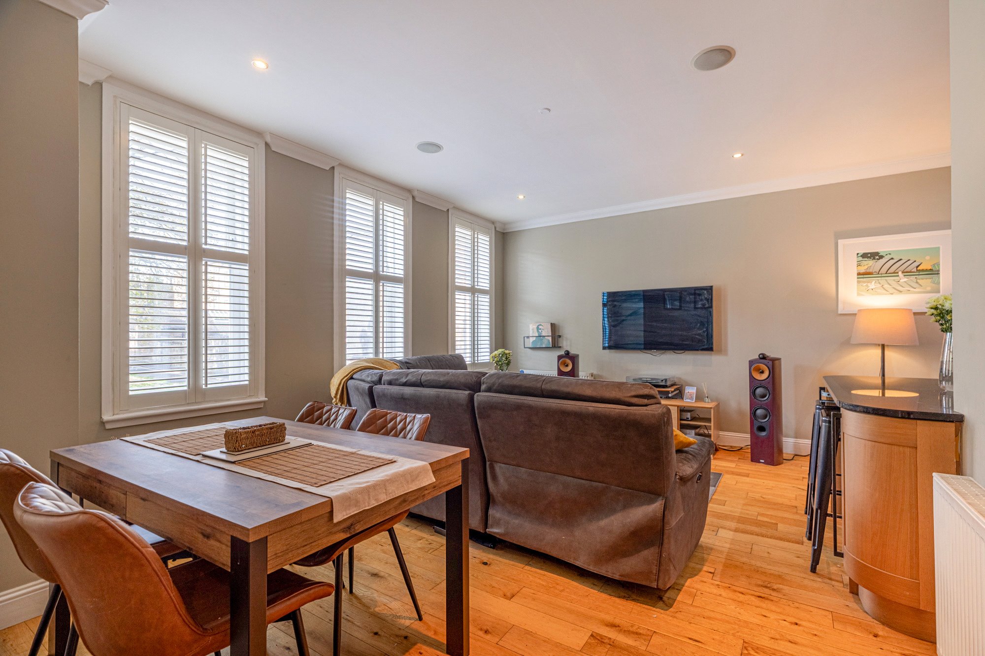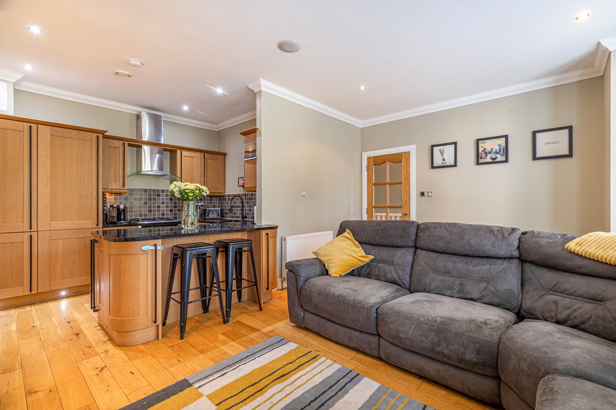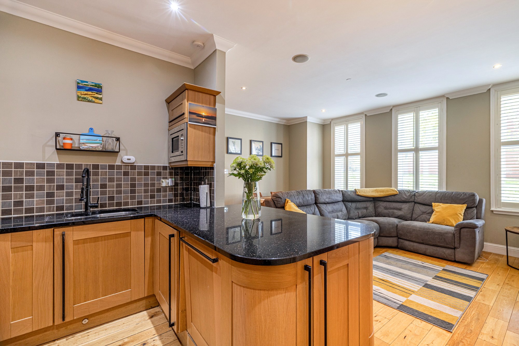 Accessed via its own private front door, the property offers a bright, open-plan layout across two well-designed levels. On the entrance level, you are welcomed by a reception hallway that leads to a stunning main living space with a generous sitting area and a stylish, contemporary kitchen. The kitchen has been fitted with quality wall and floor-mounted units, integrated appliances, and a sleek breakfast bar for casual dining. Large front-facing windows draw natural light into the space, creating a welcoming and airy environment. A cloakroom/WC with a modern two-piece suite is also located on this level, ideal for guests.