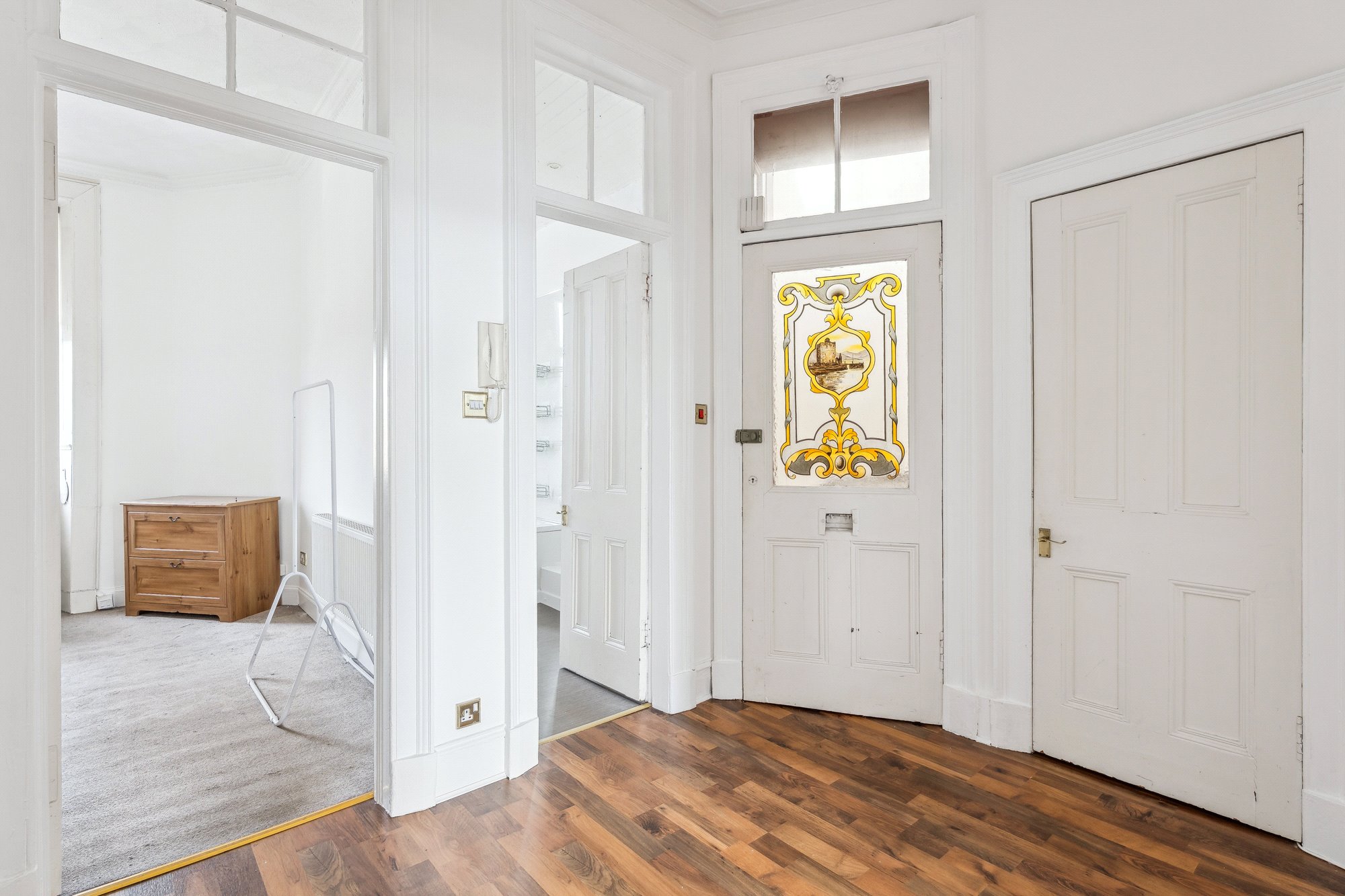- Storm door entrance vestibule leading into broad and welcoming reception hall with useful storage cupboard off
