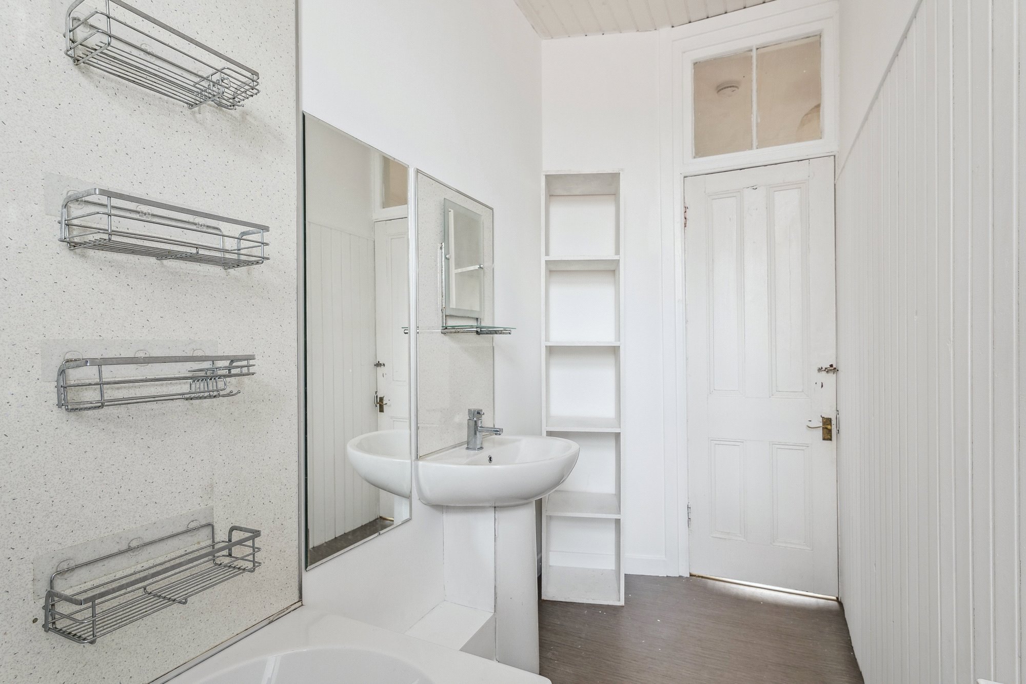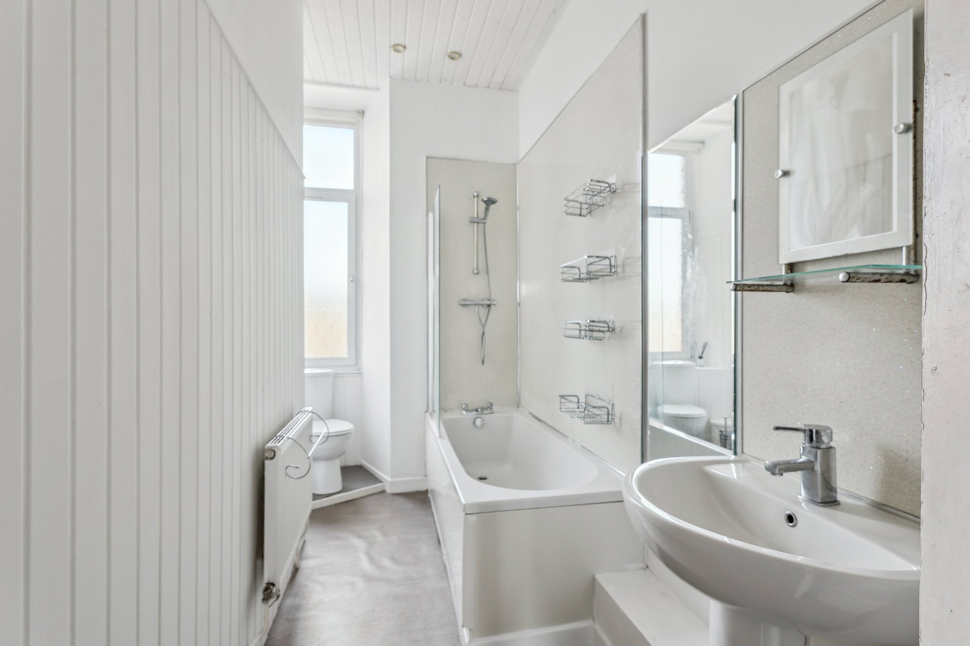 - Three-piece bathroom comprising bath, over bath shower, toilet and wash hand basin. Window to the rear