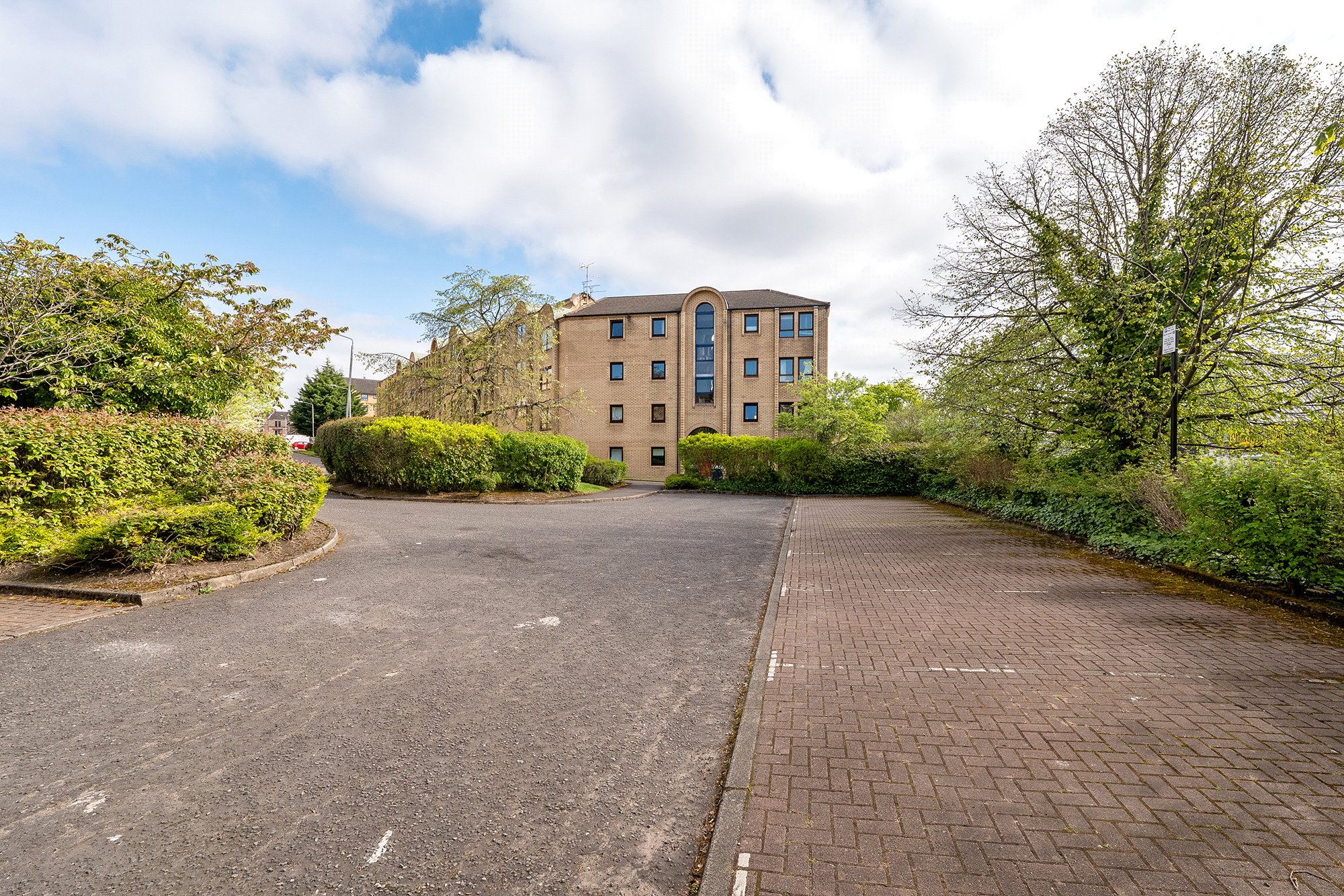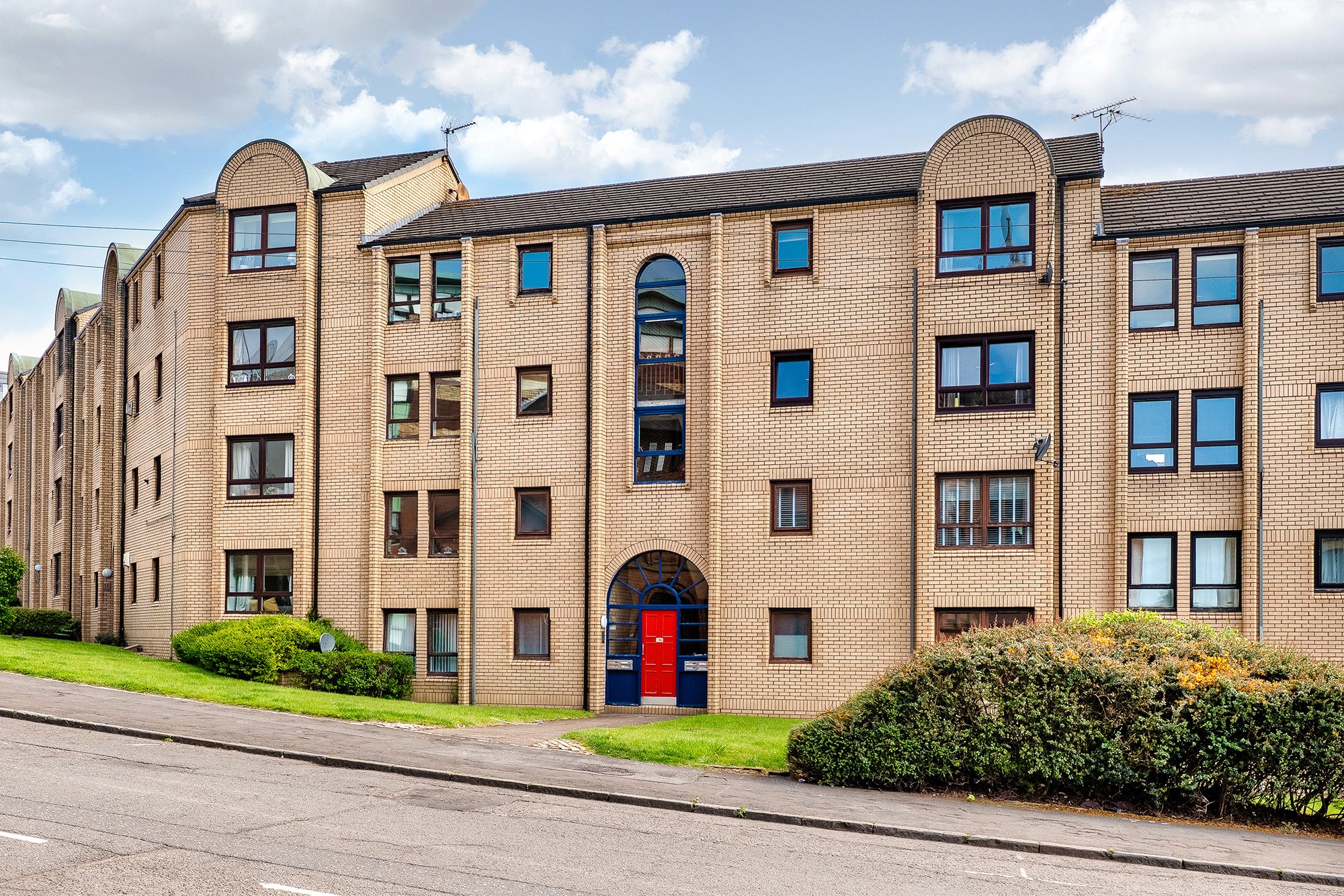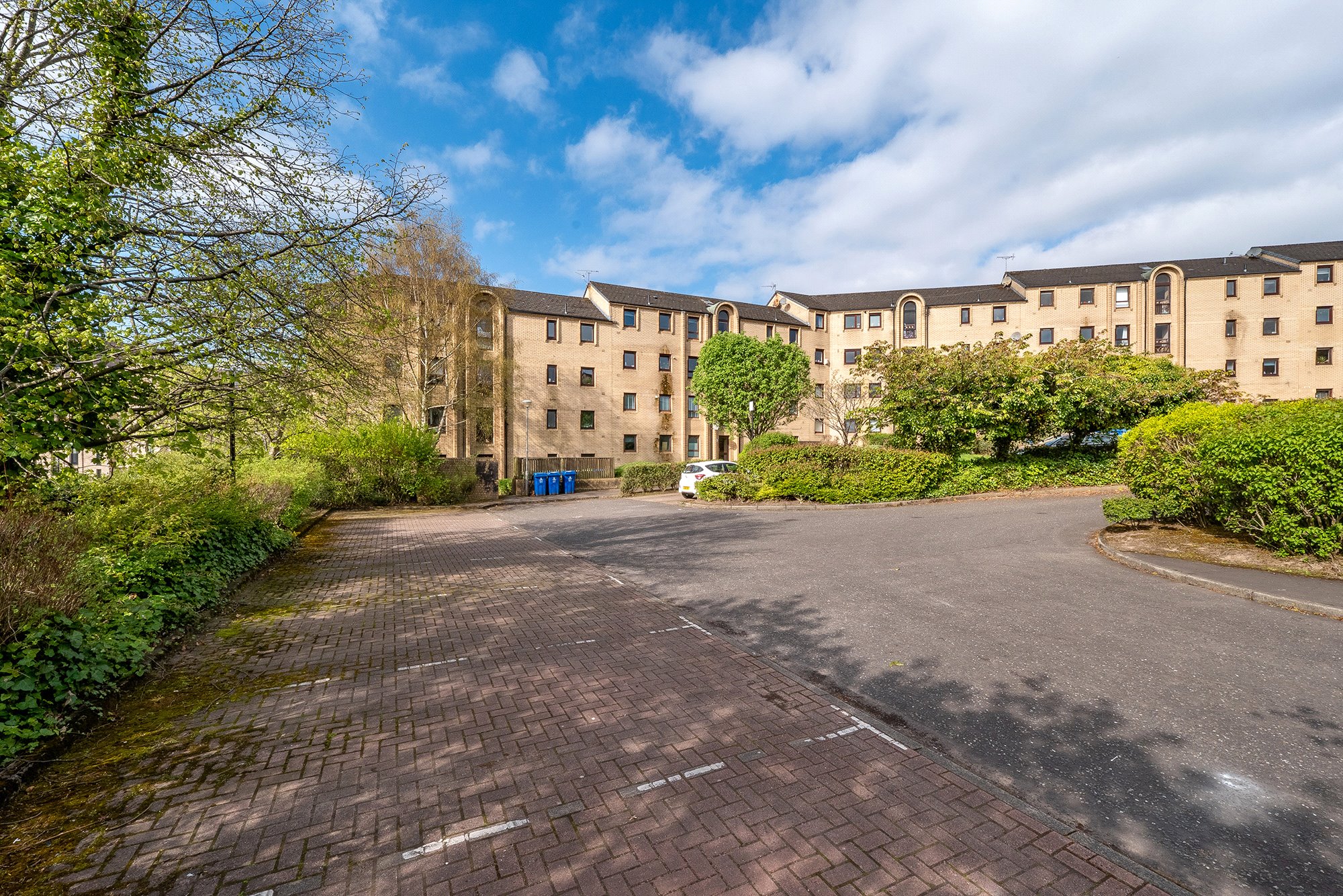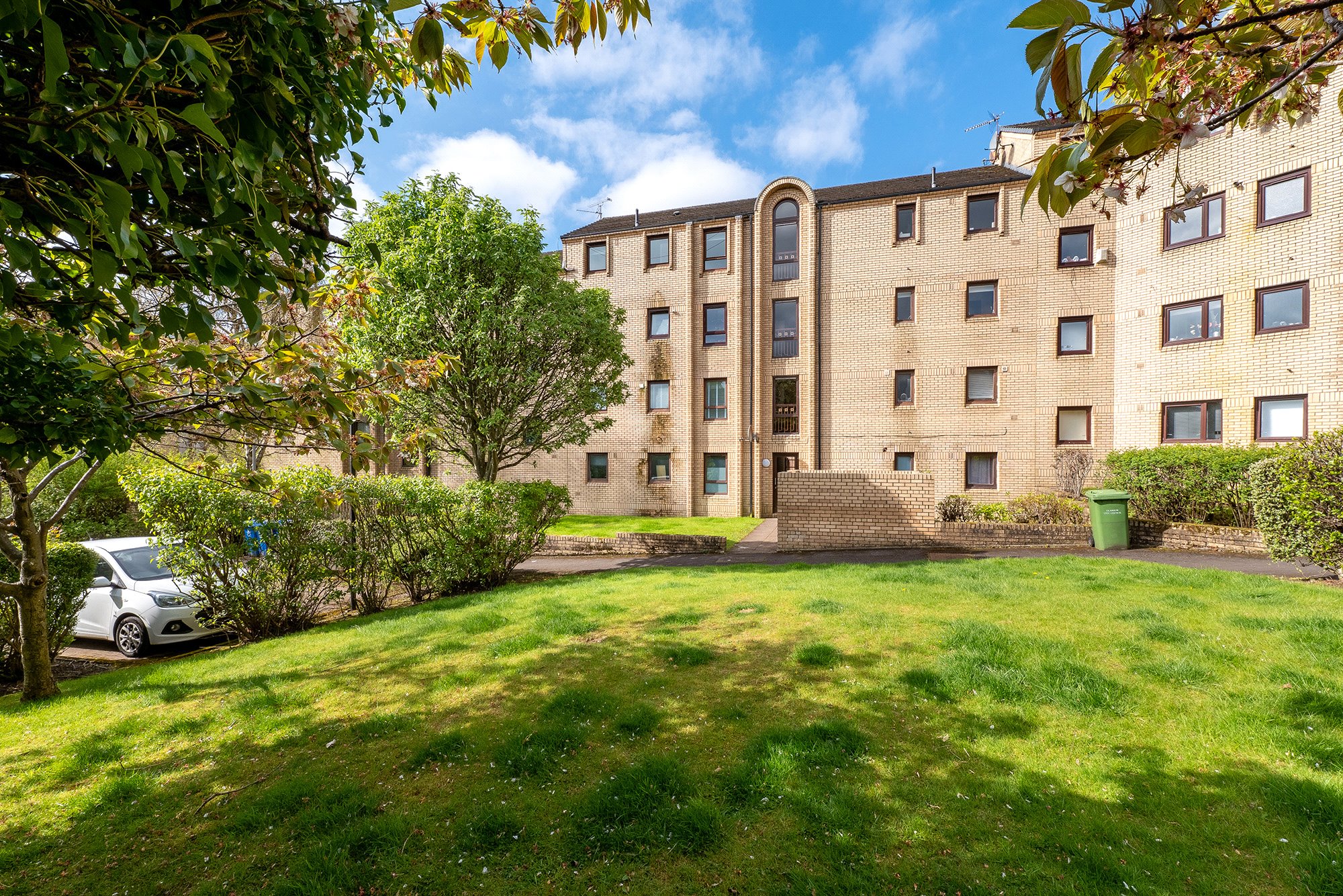 The property is set within a low-rise modern apartment block with a pitched roof and a neat blonde brick exterior. Lawned grounds surround the building, and on-street permit parking is available via Glasgow City Council. A secure entrance door provides access to well-kept communal halls and stairways, and the apartment for sale is located on the third floor, benefiting from excellent levels of natural light throughout the day.