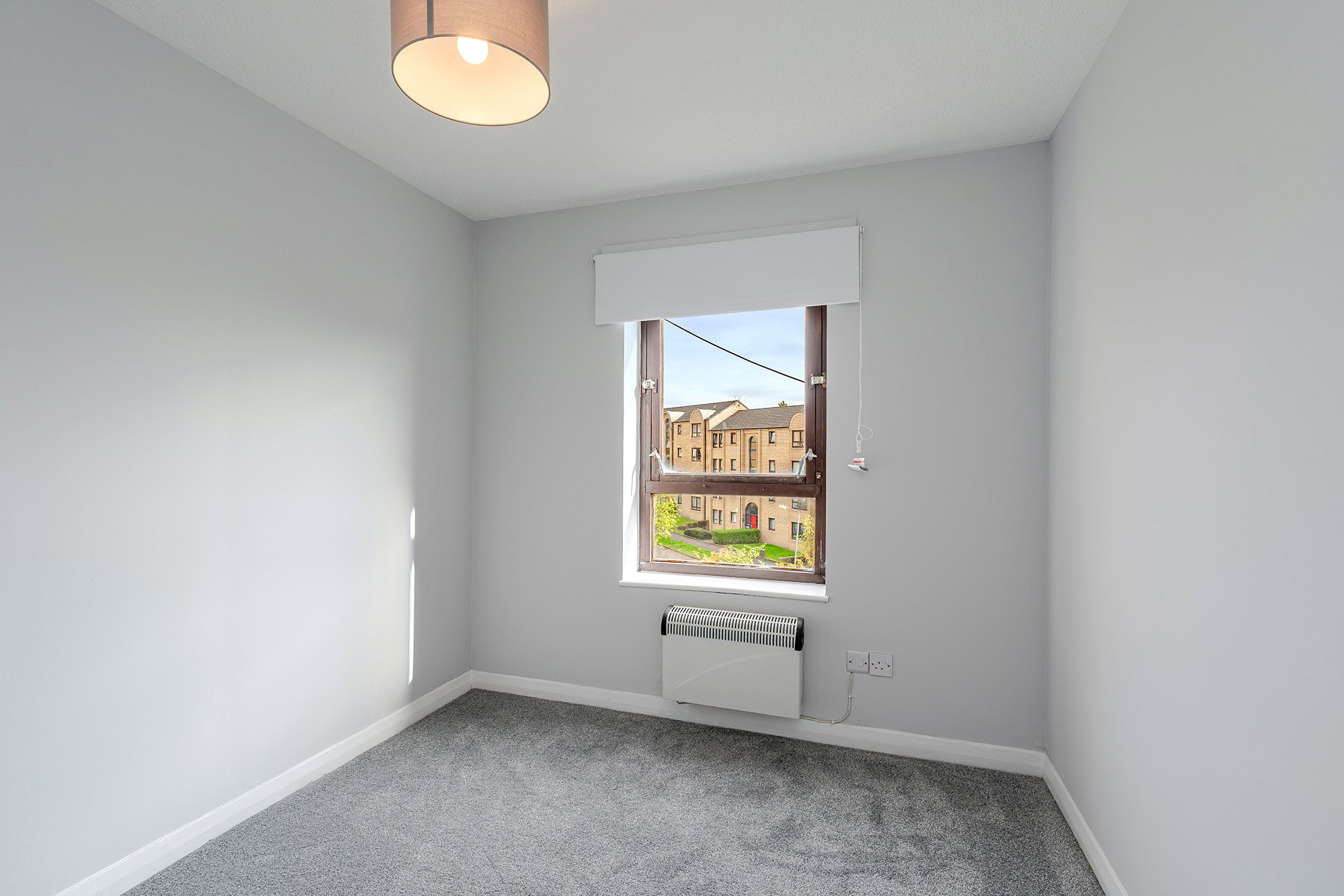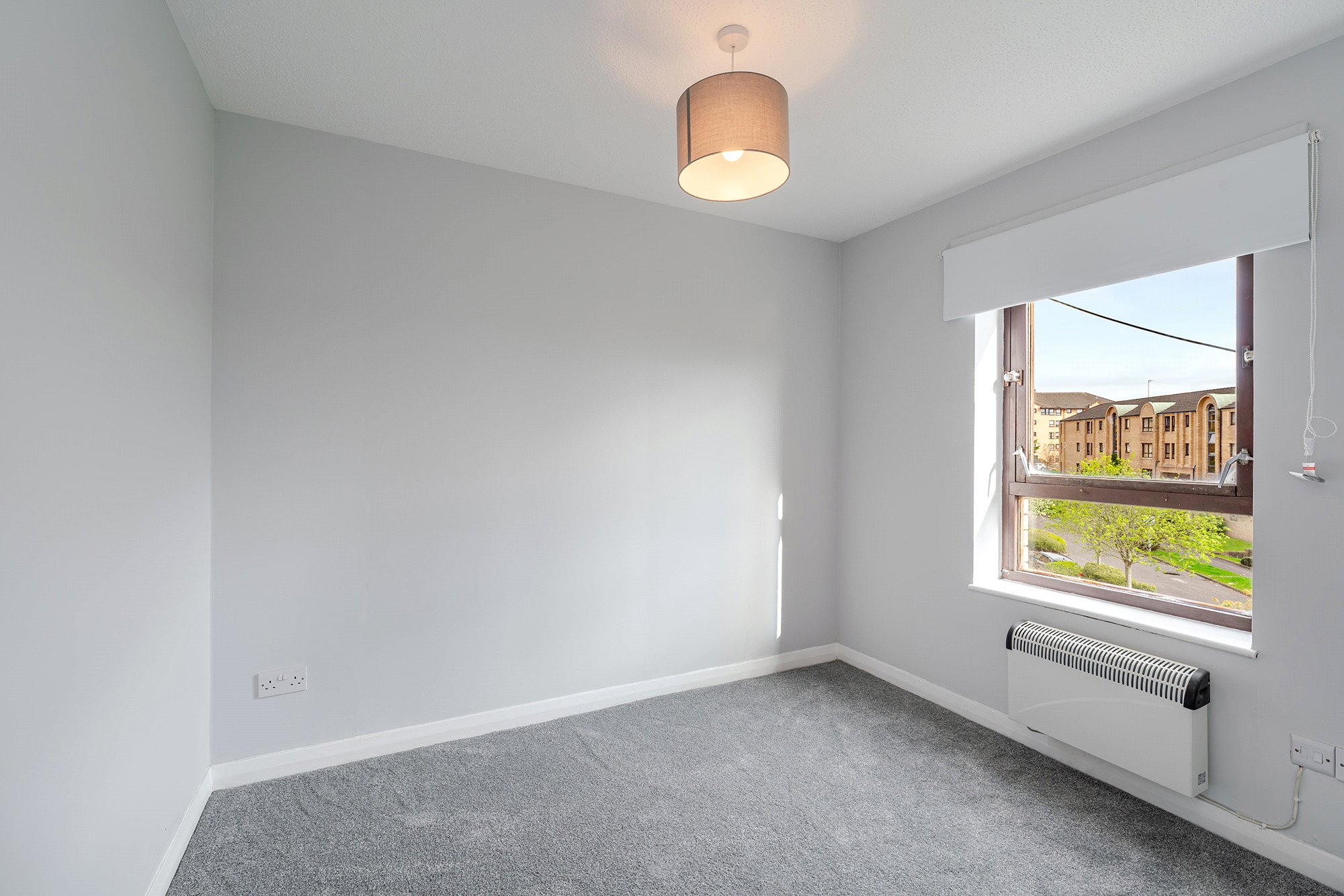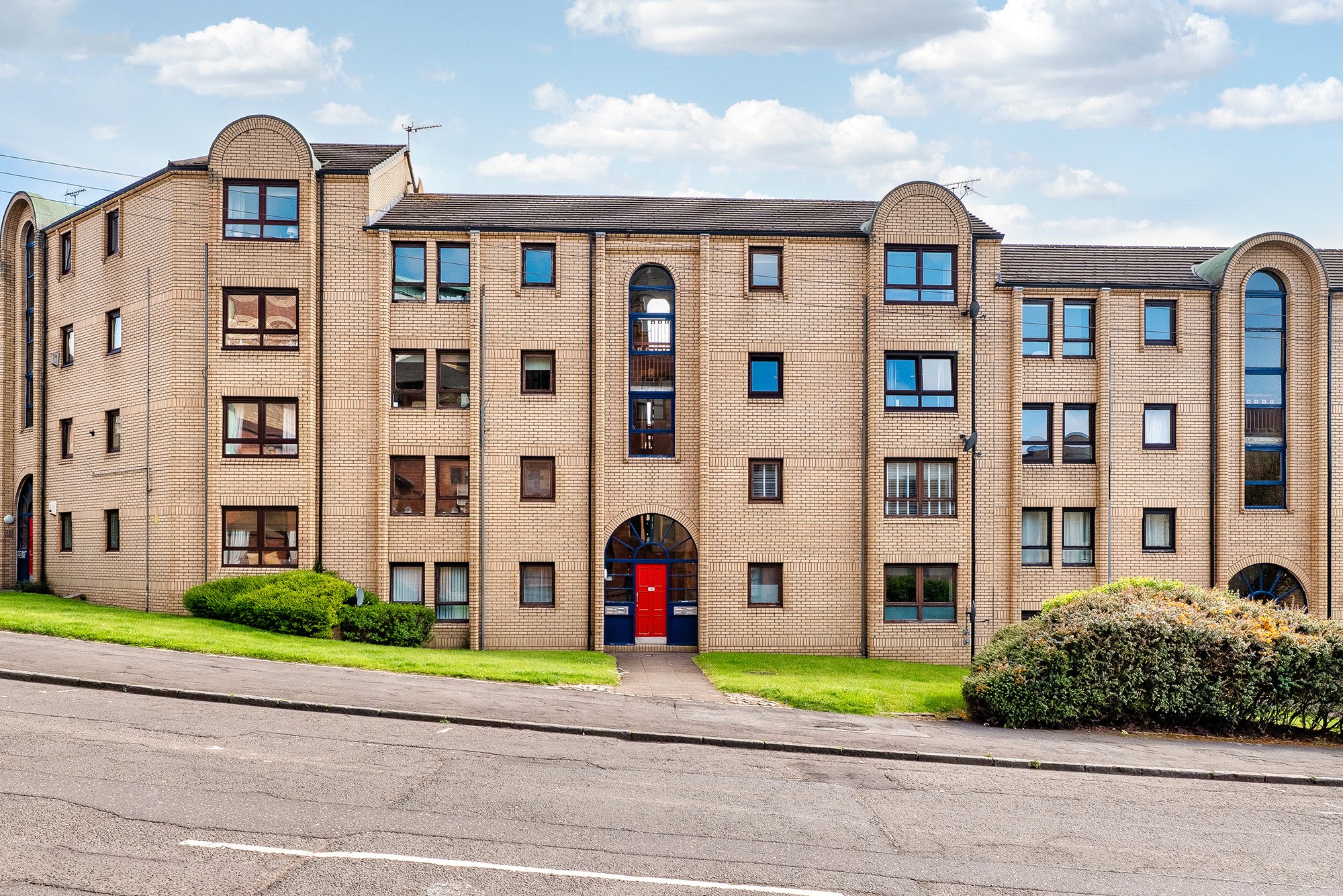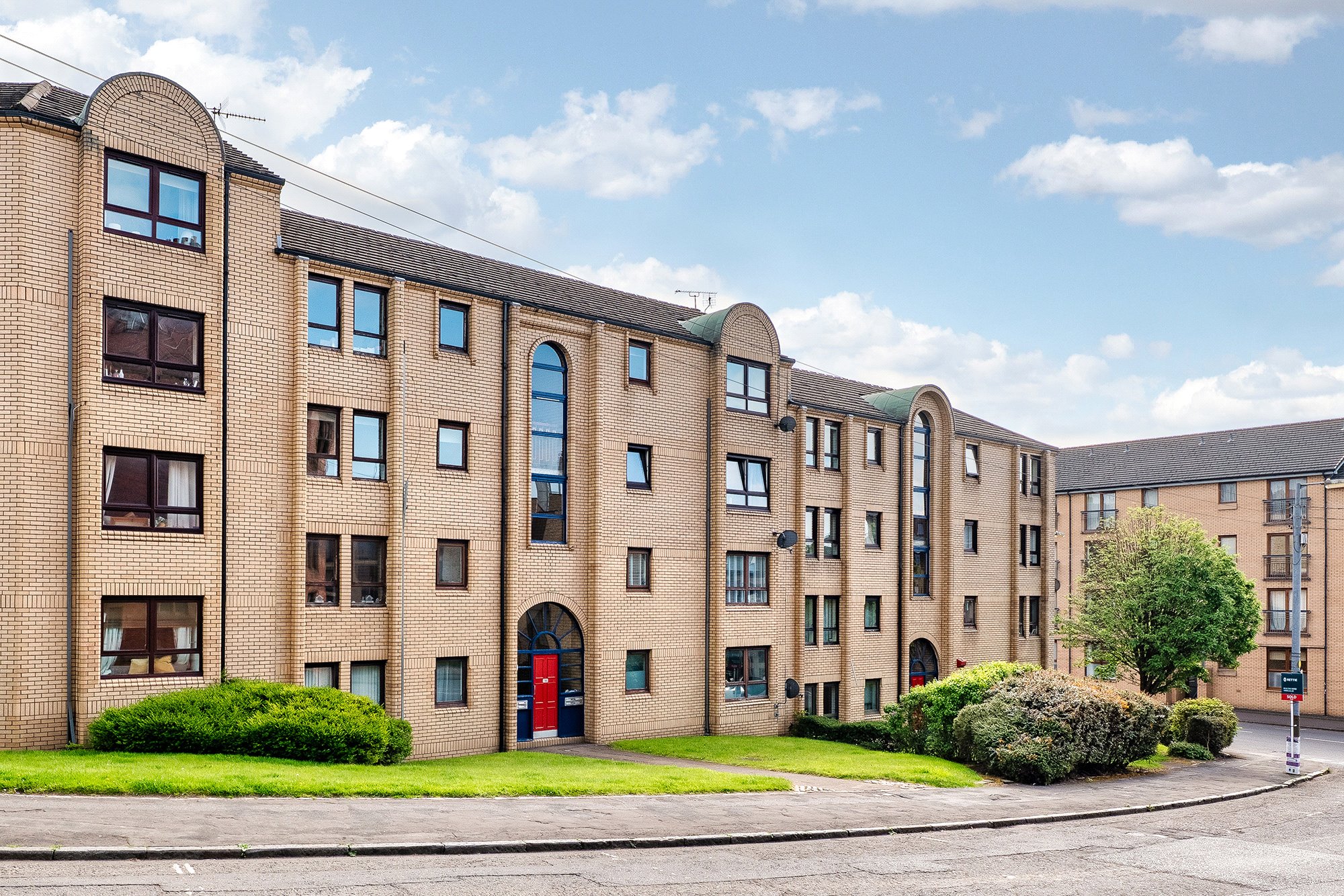 The property is set within a low-rise modern apartment block with a pitched roof and a neat blonde brick exterior. Lawned grounds surround the building, and on-street permit parking is available via Glasgow City Council. A secure entrance door provides access to well-kept communal halls and stairways, and the apartment for sale is located on the third floor, benefiting from excellent levels of natural light throughout the day.