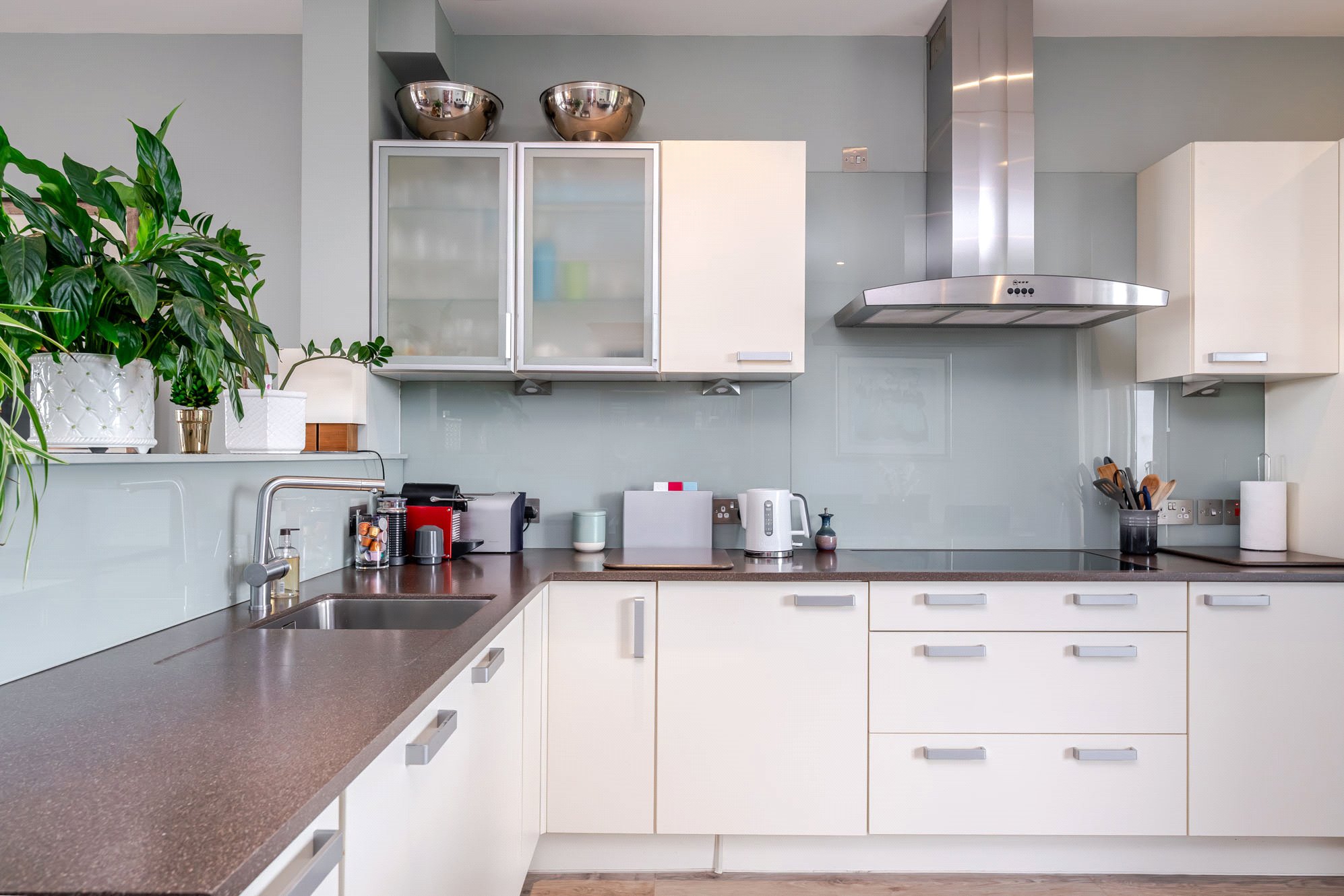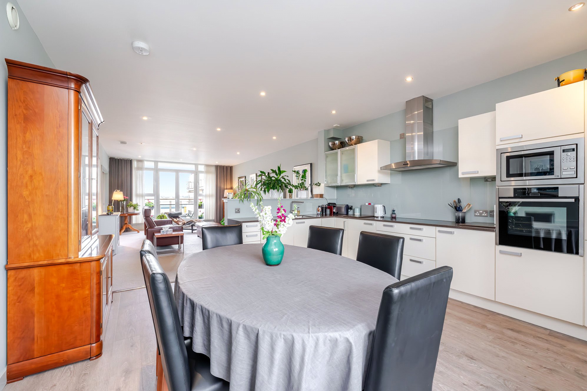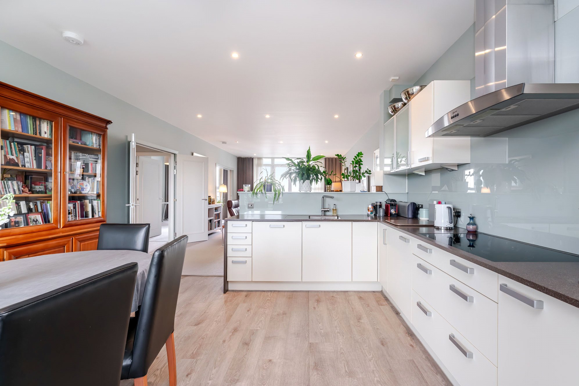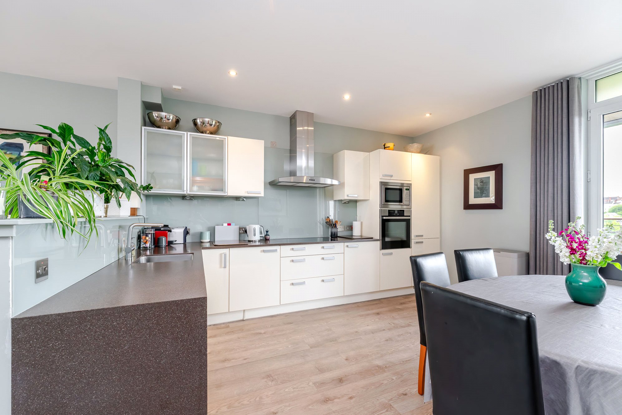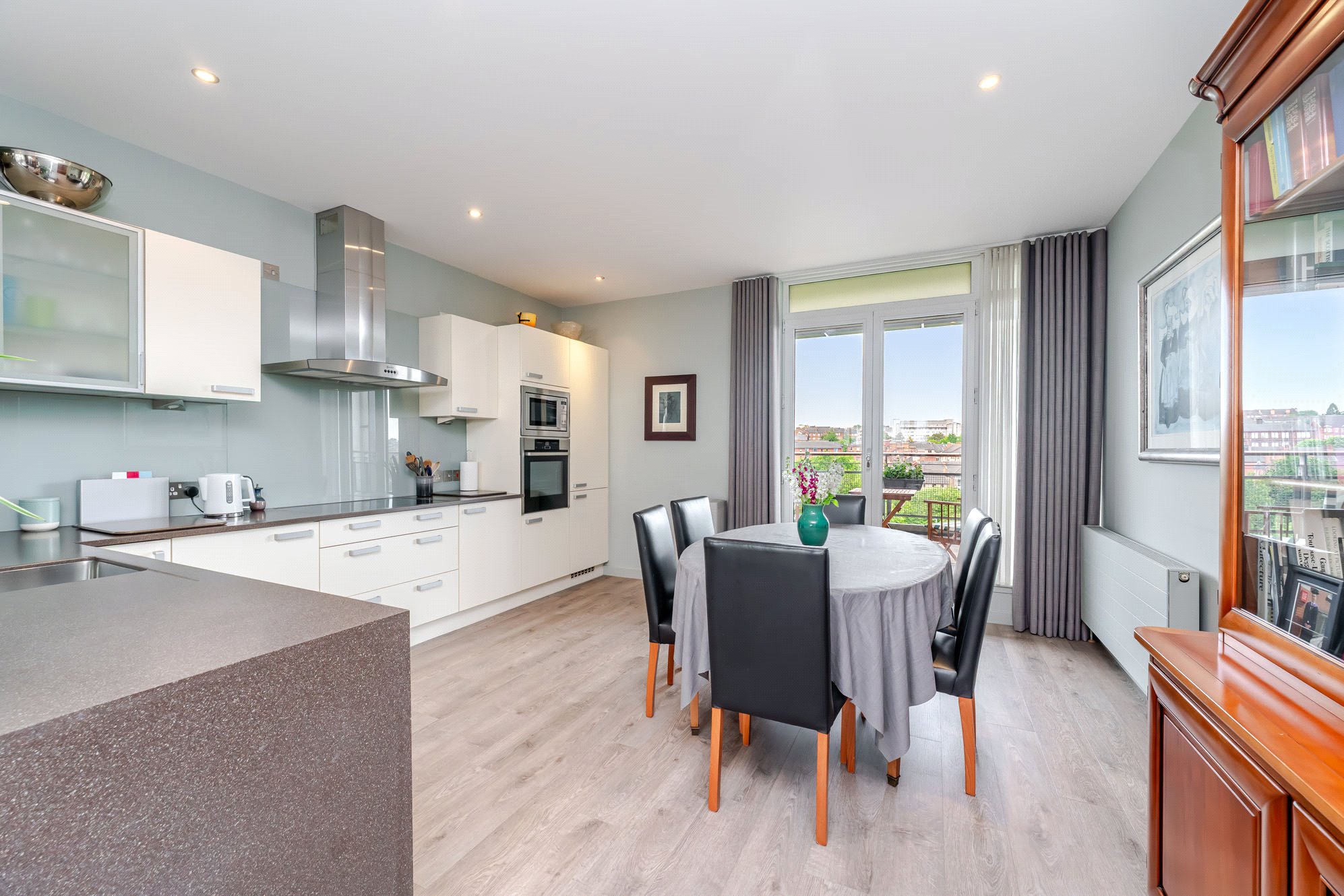 - Impressive open plan dining kitchen complete with a range of base and wall units, kitchen peninsula, integrated appliances and double doors to substantial private balcony/terrace