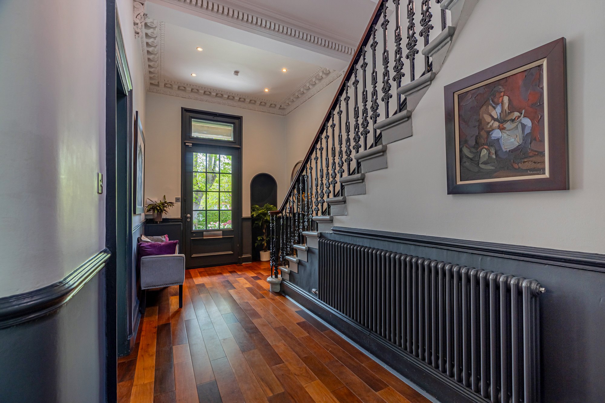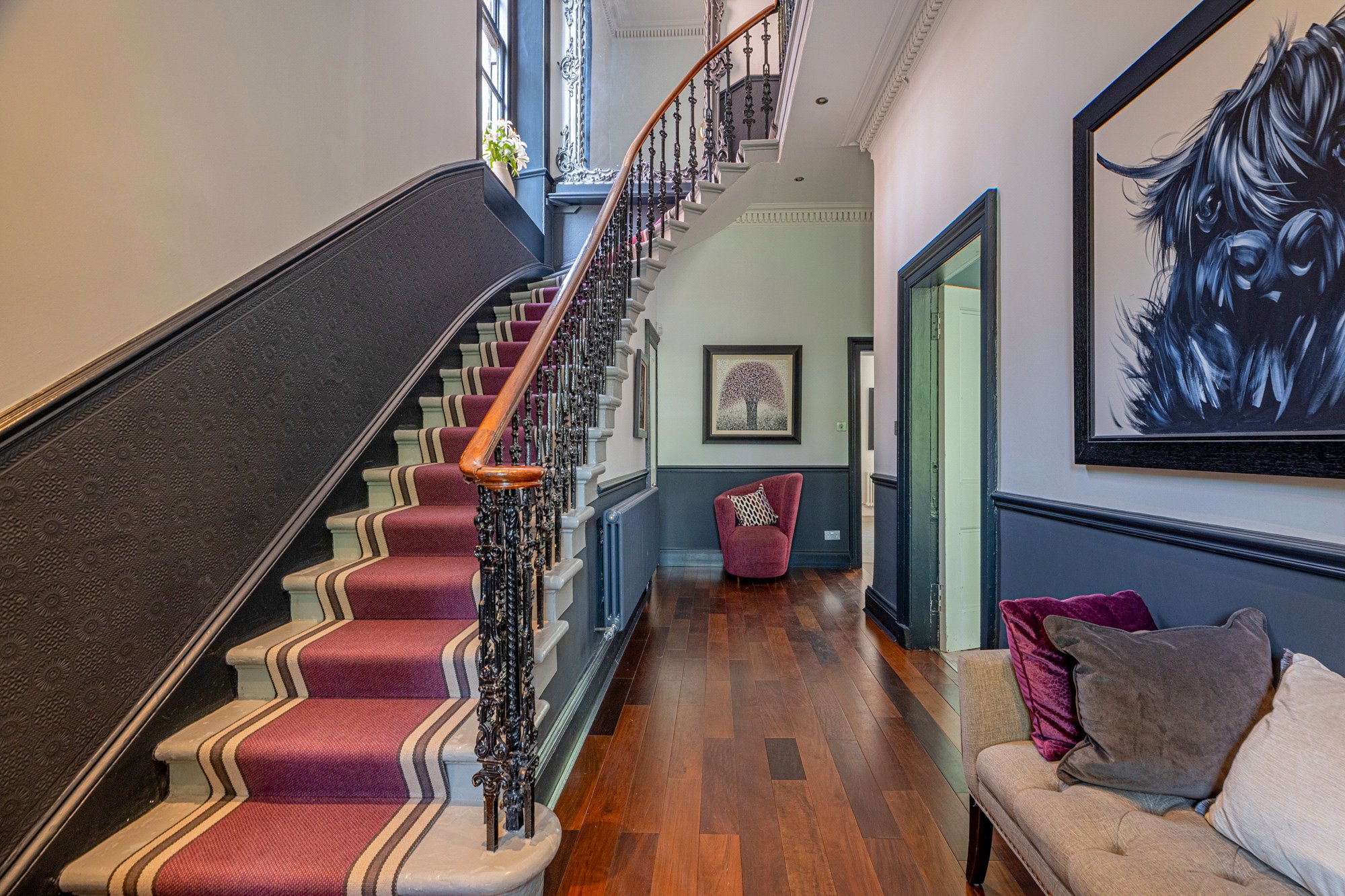 • Lovely, welcoming reception hall with panelled/glazed front door, quality hardwood flooring, focal point fire surround, ornate cornicing and a stunning original stairway with wooden/ornate wrought iron banister.