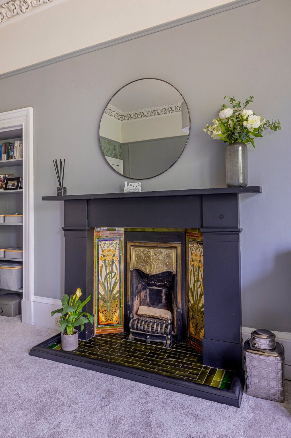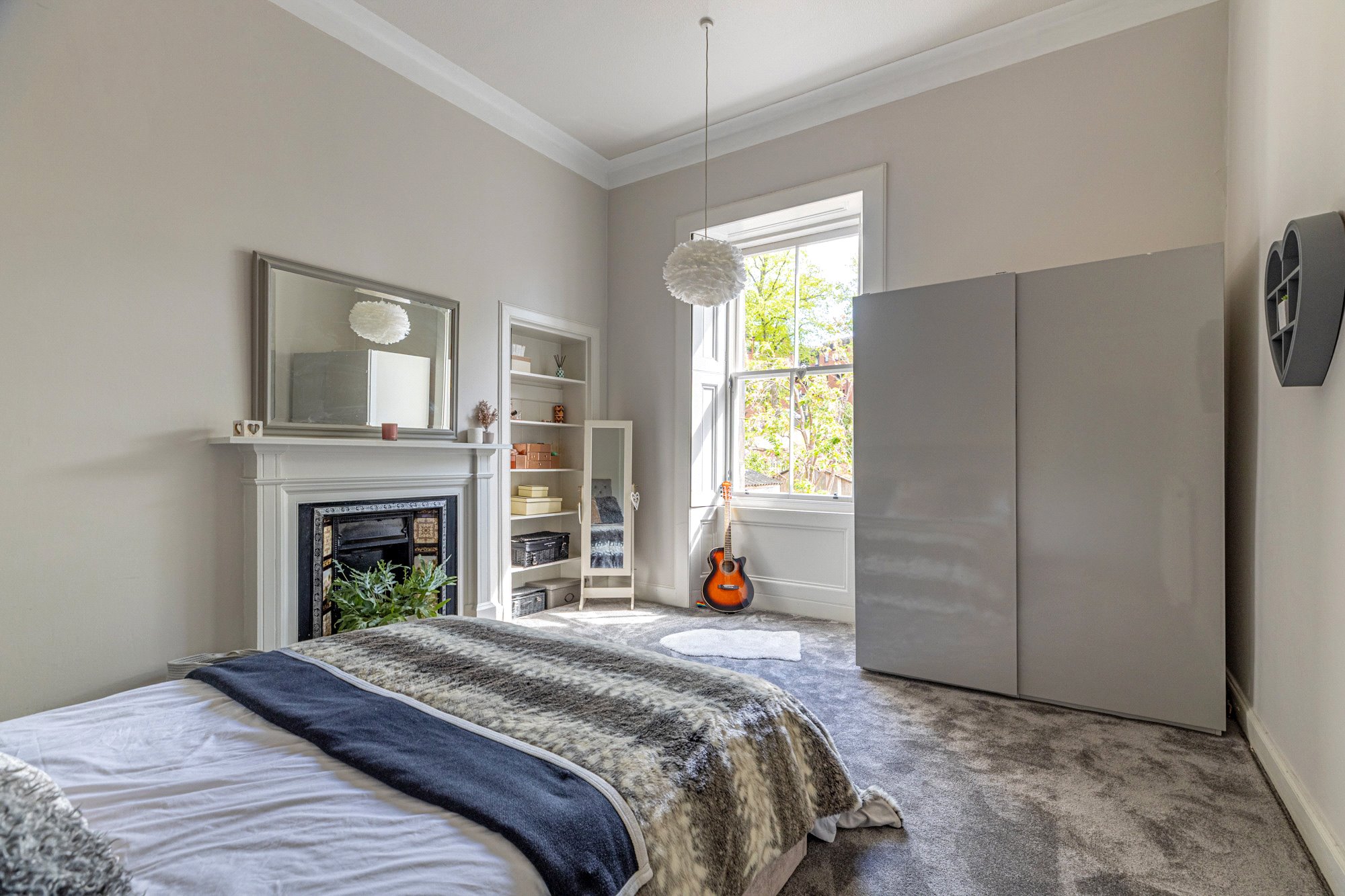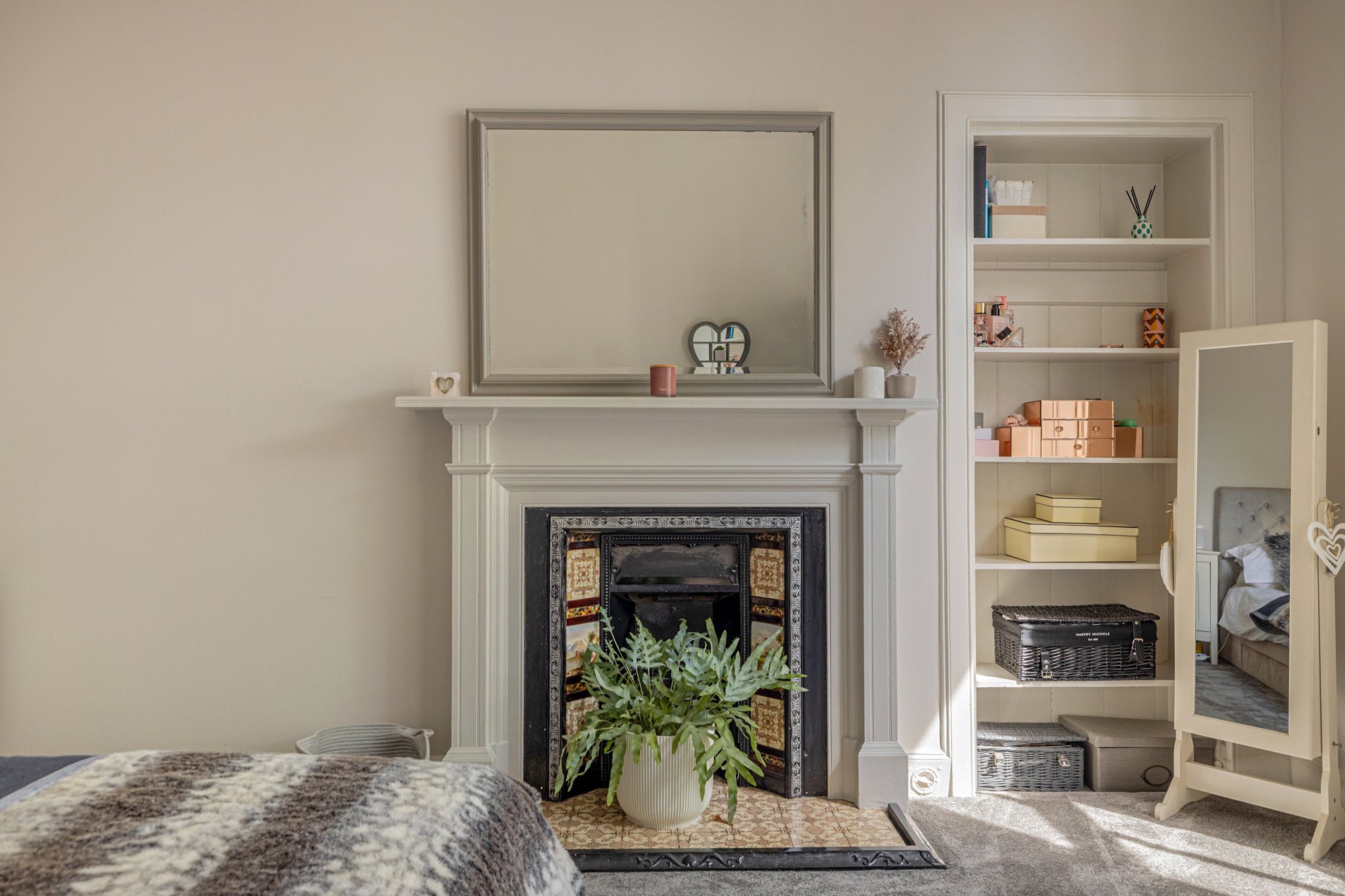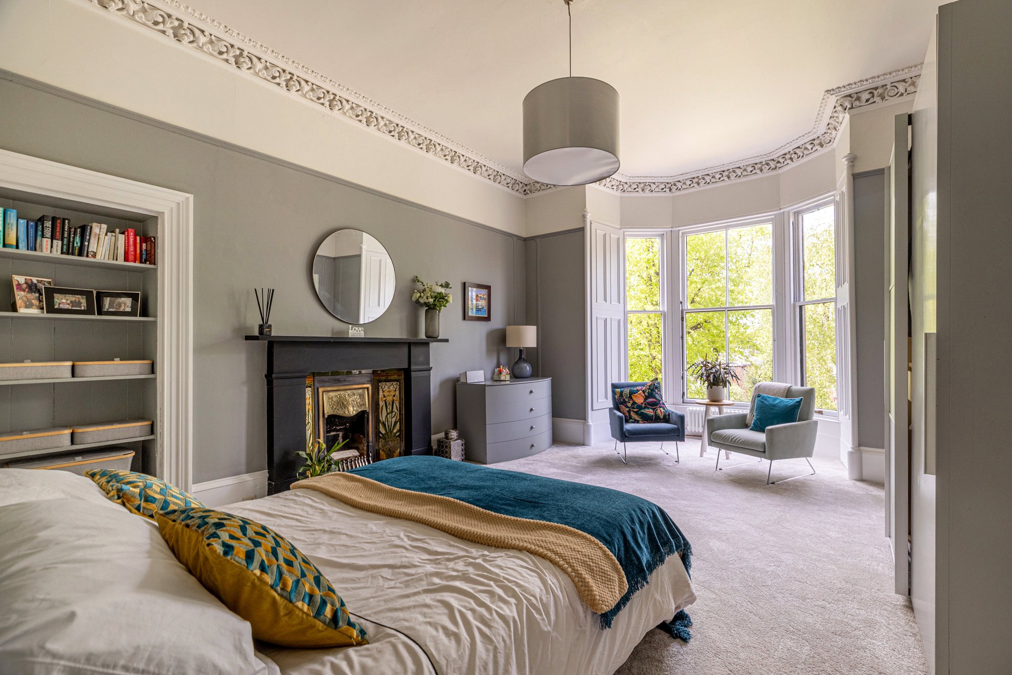 • Bright, spacious bedroom one (principal) with three section window to the front, focal point fireplace and ornate ceiling cornicing.