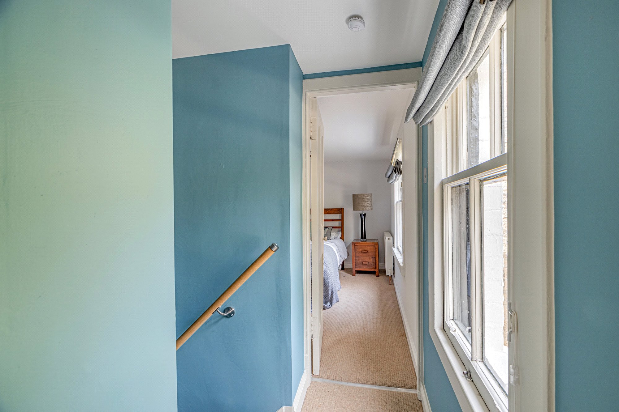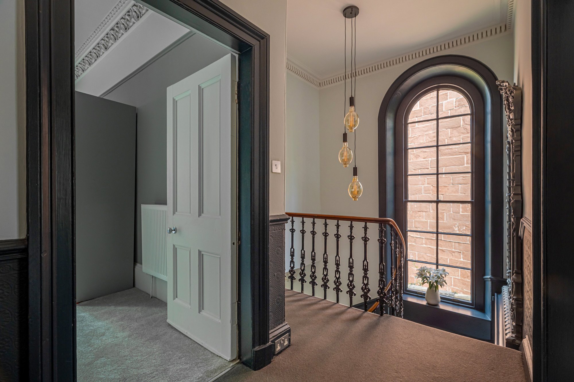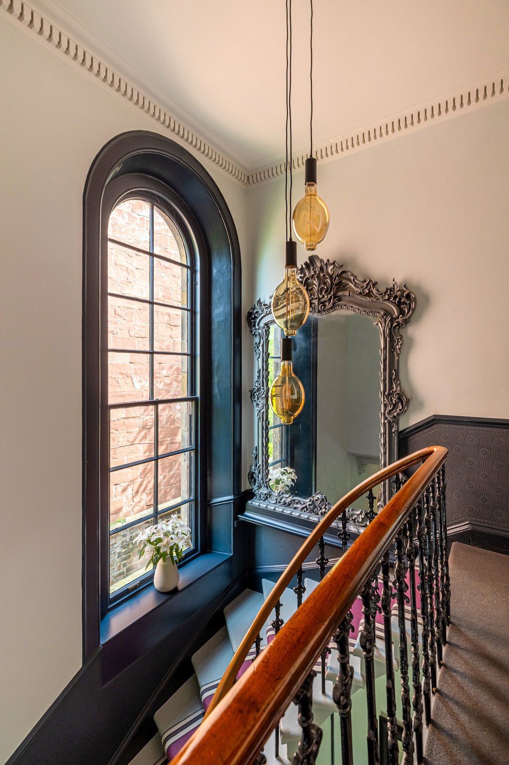• The original stairway leads up to the first floor landing with large arched window to the side.