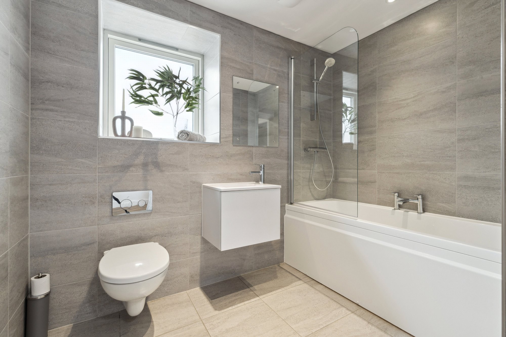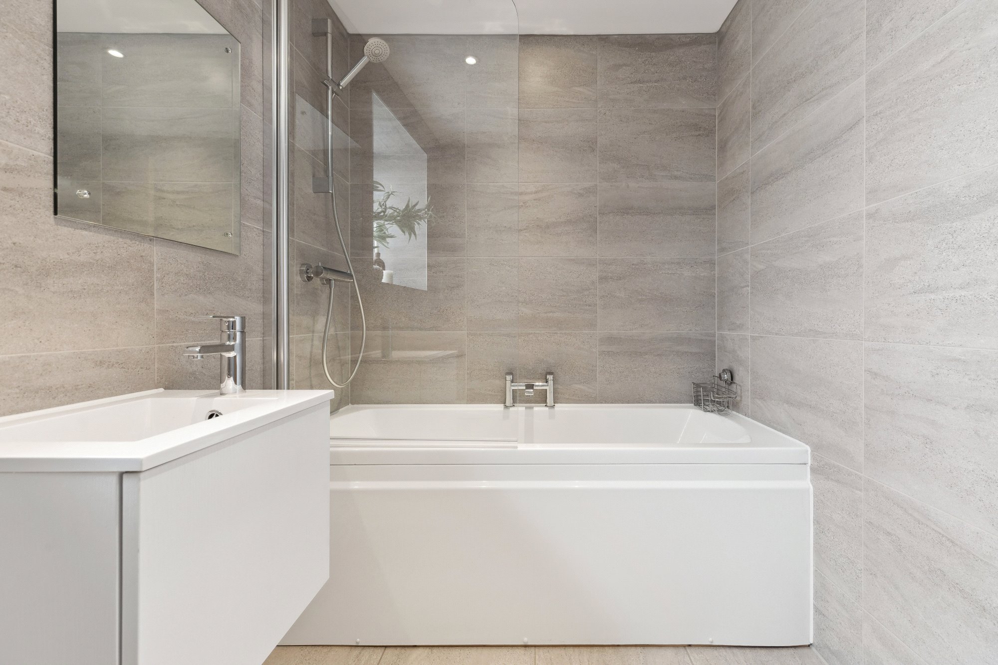 - Main bathroom with window, a three piece white suite and a shower over the bath.