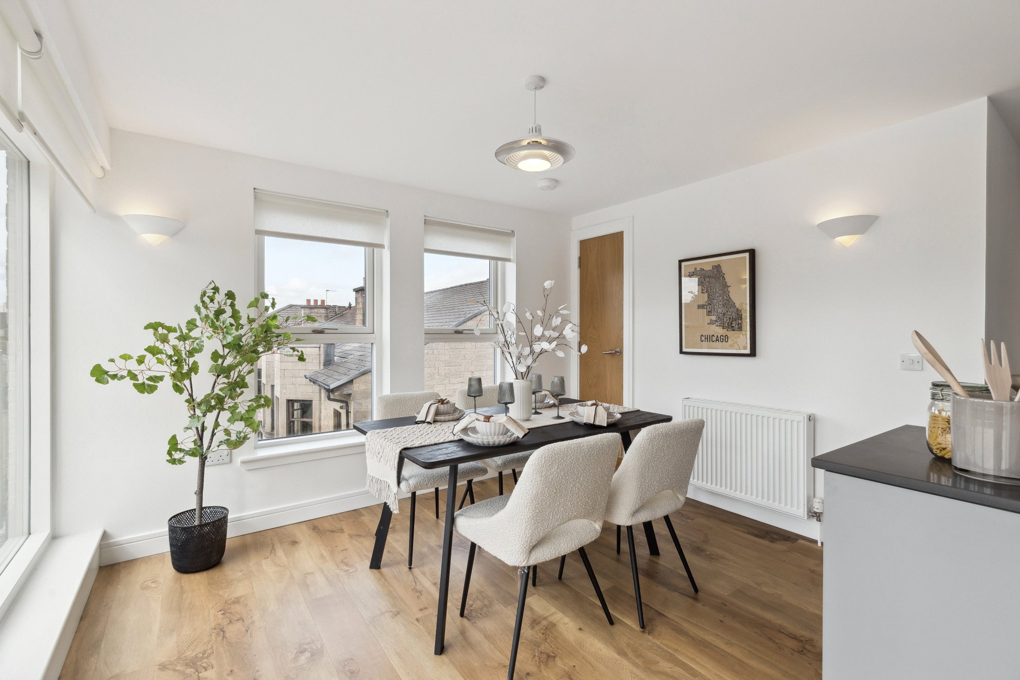 - Dining area adjacent to the kitchen with a further two windows, a corner storage cupboard and wooden flooring.