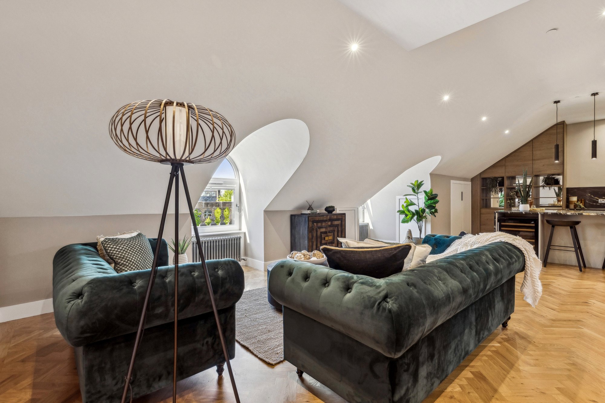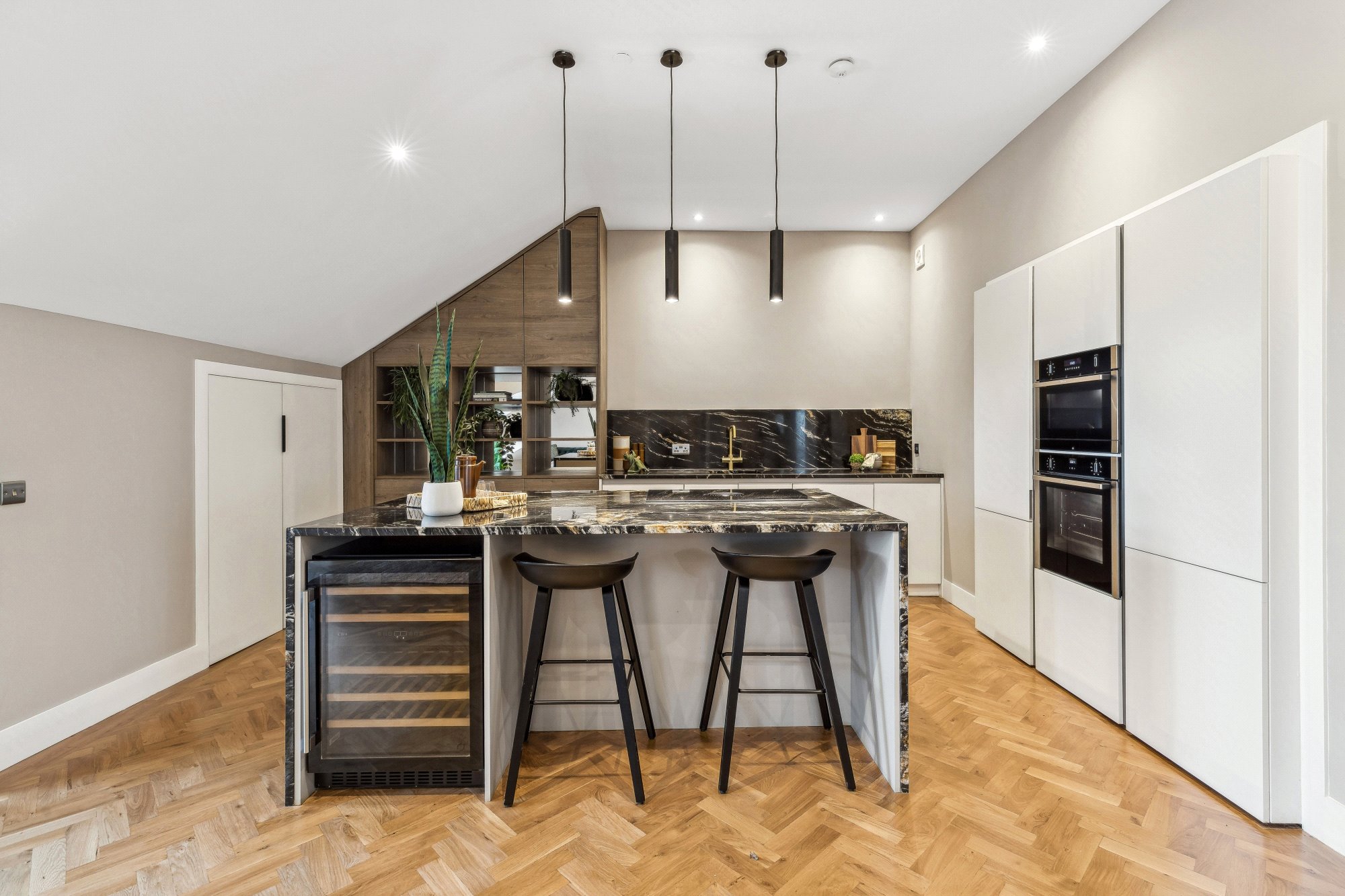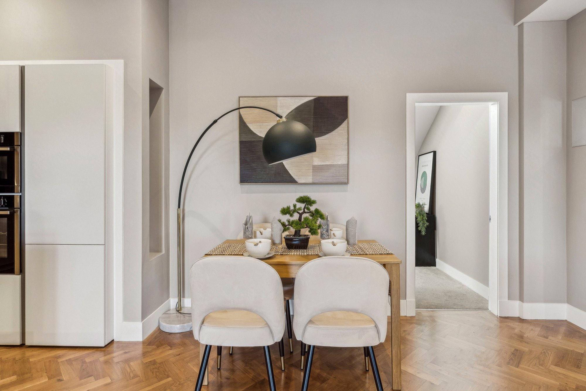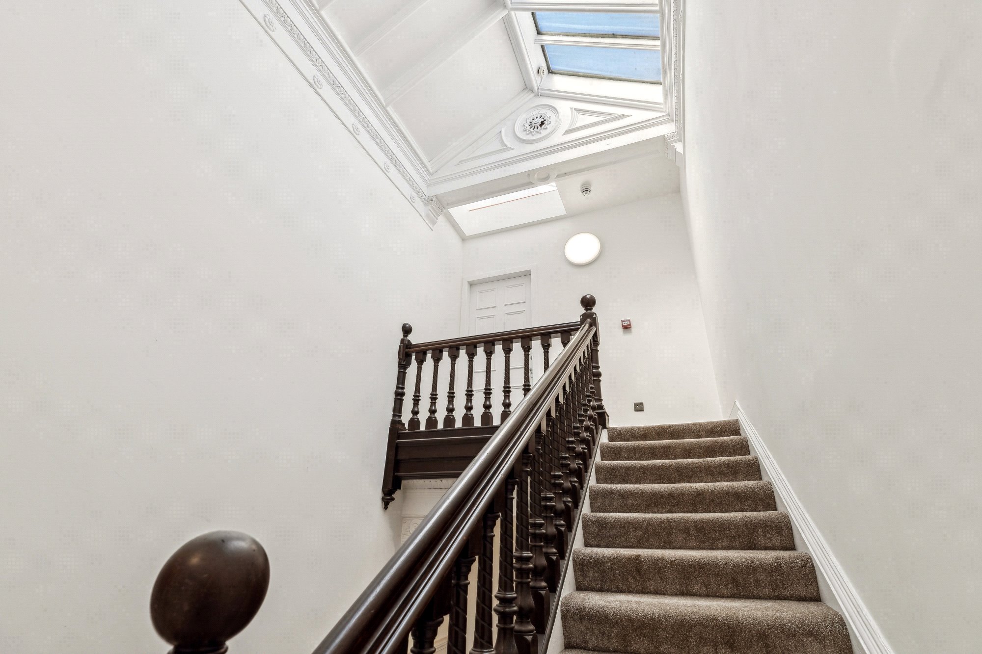 Completed in 2022 to an impeccable standard, the property occupies a prominent position within this distinguished West End terrace and seamlessly blends classic architectural charm with sophisticated contemporary design. Accessed via a grand communal entrance with marble-style flooring and a restored original staircase, the second-floor landing is flooded with natural light from a stunning cupola.