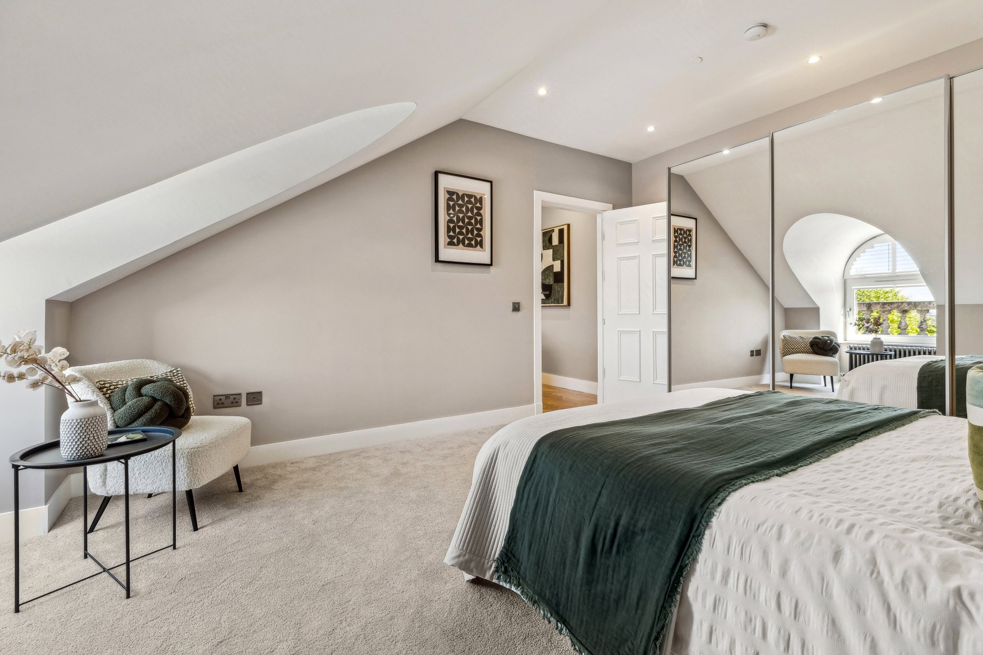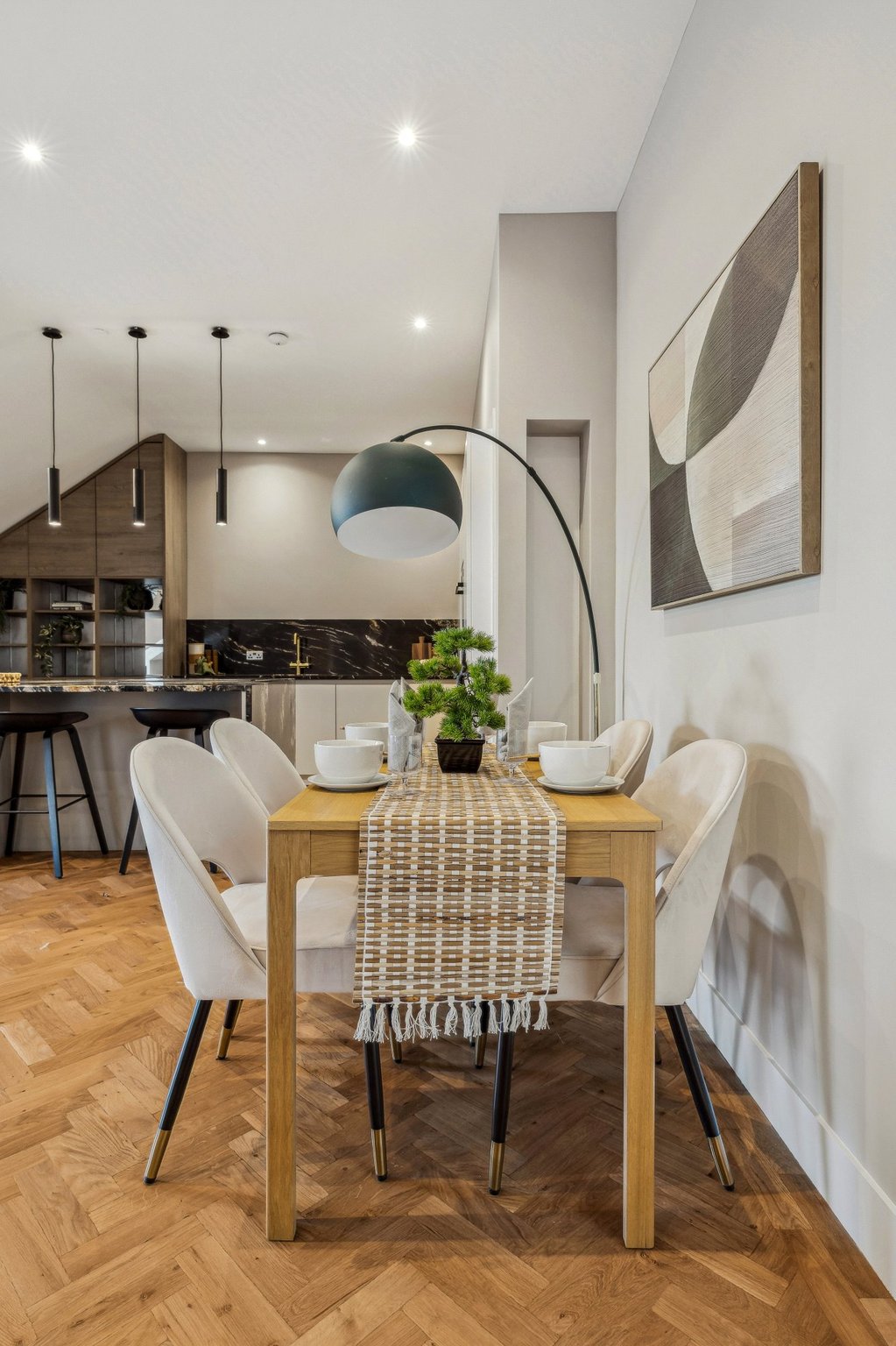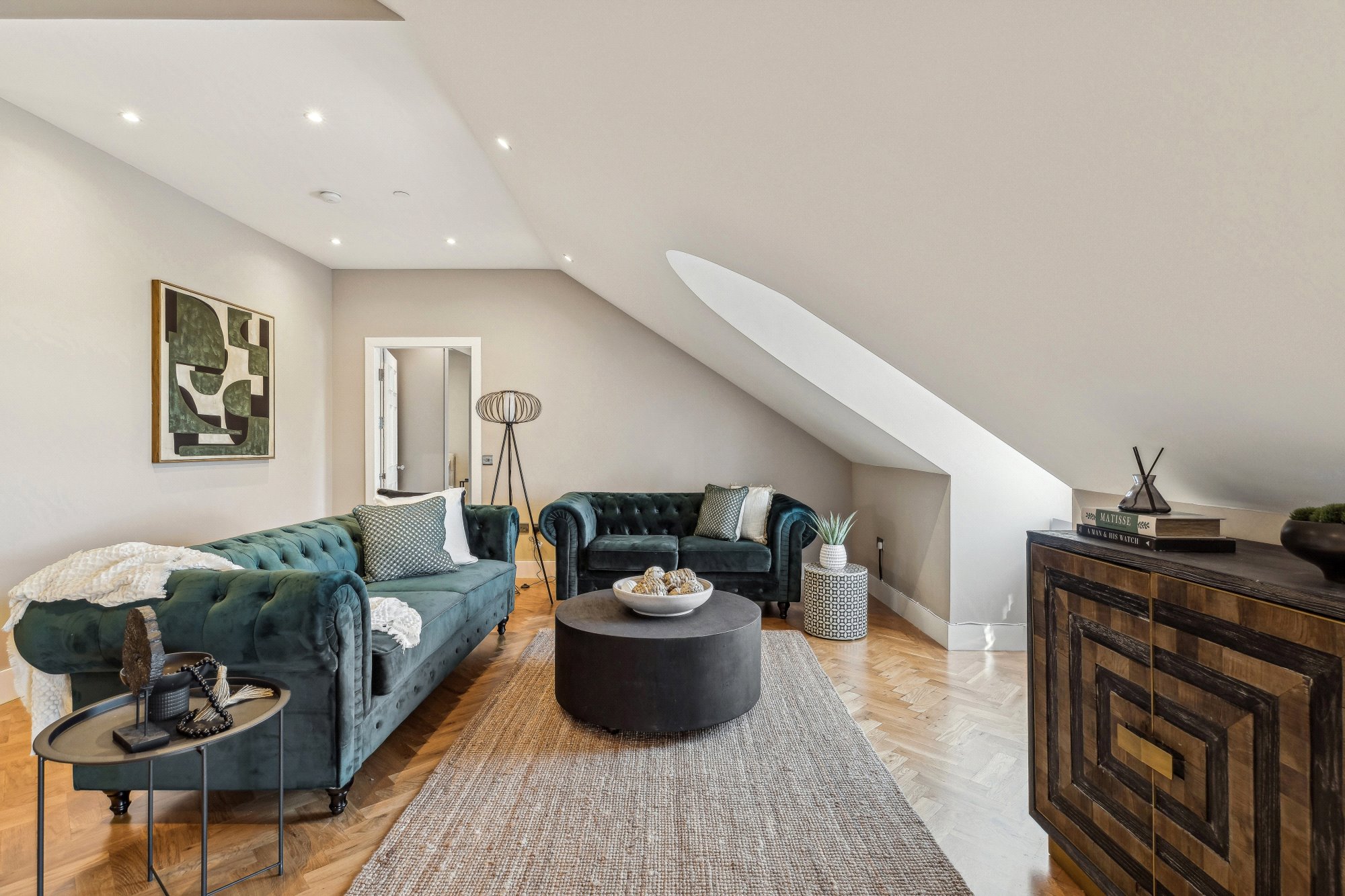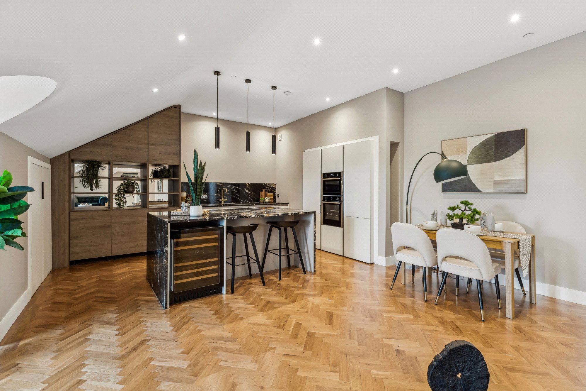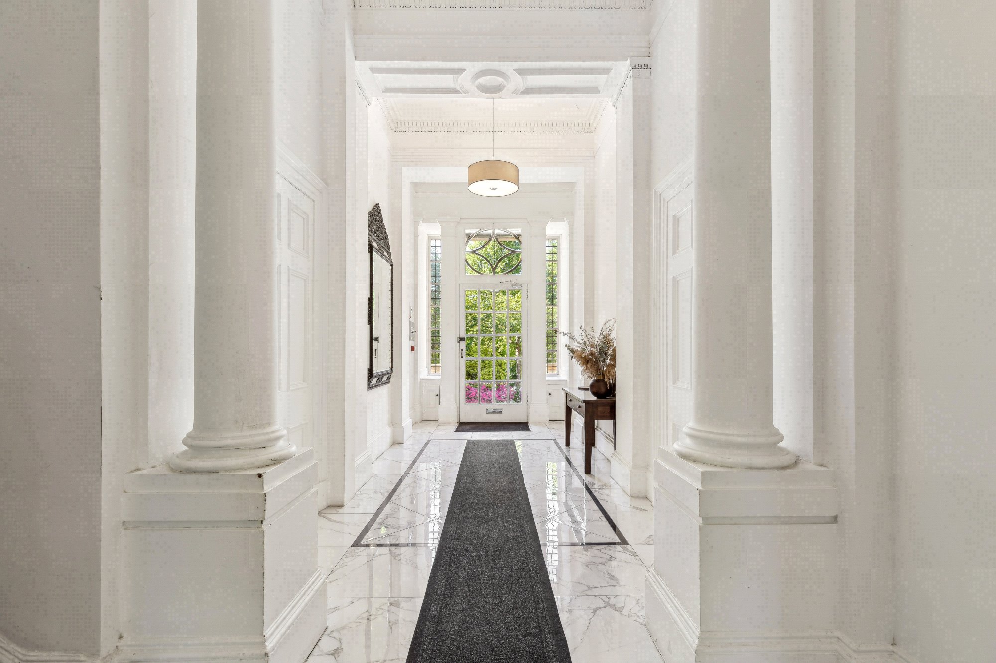Completed in 2022 to an impeccable standard, the property occupies a prominent position within this distinguished West End terrace and seamlessly blends classic architectural charm with sophisticated contemporary design. Accessed via a grand communal entrance with marble-style flooring and a restored original staircase, the second-floor landing is flooded with natural light from a stunning cupola.