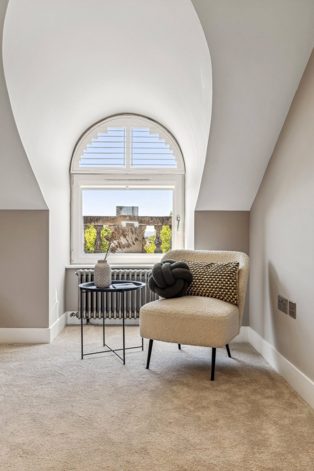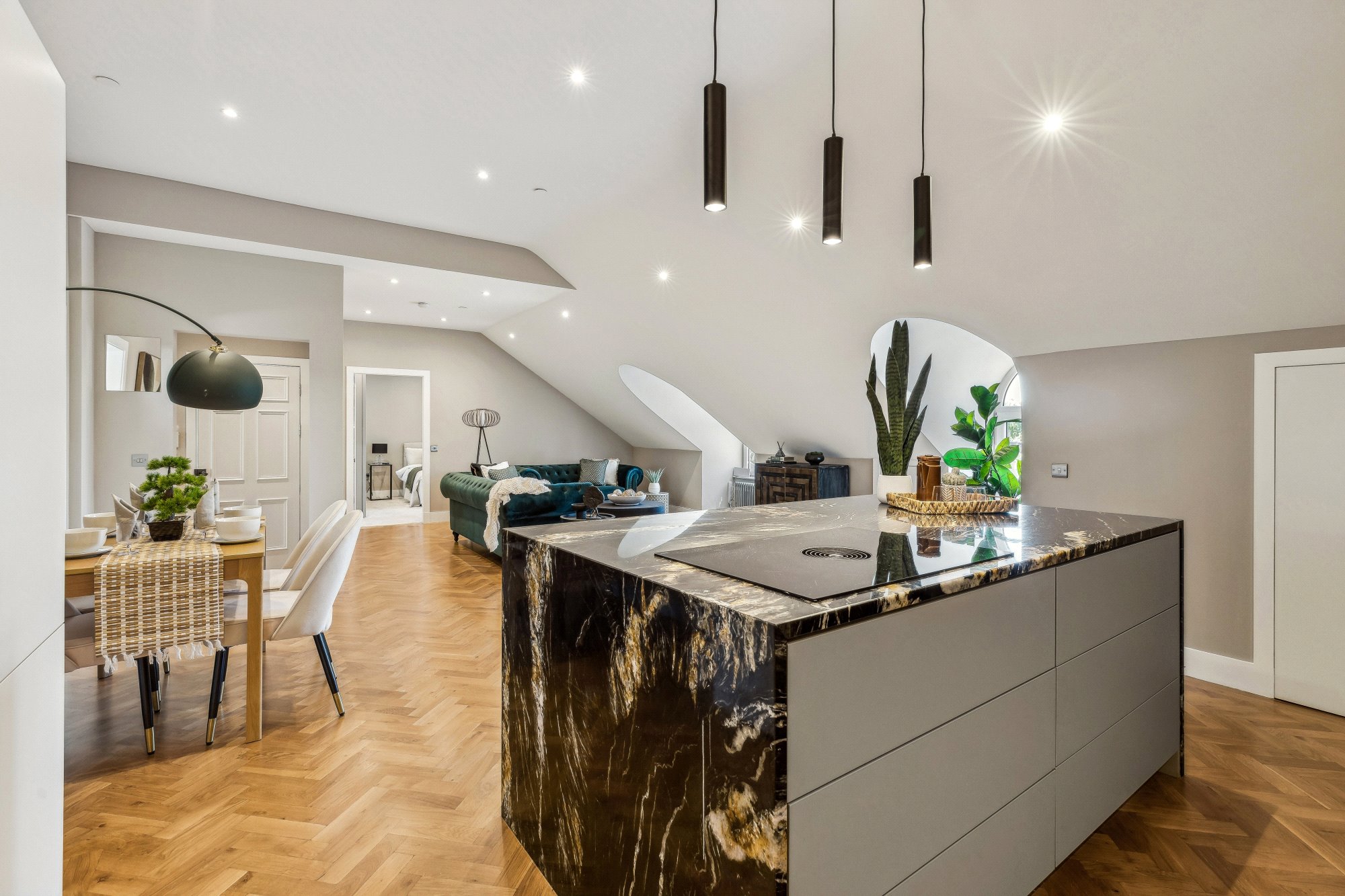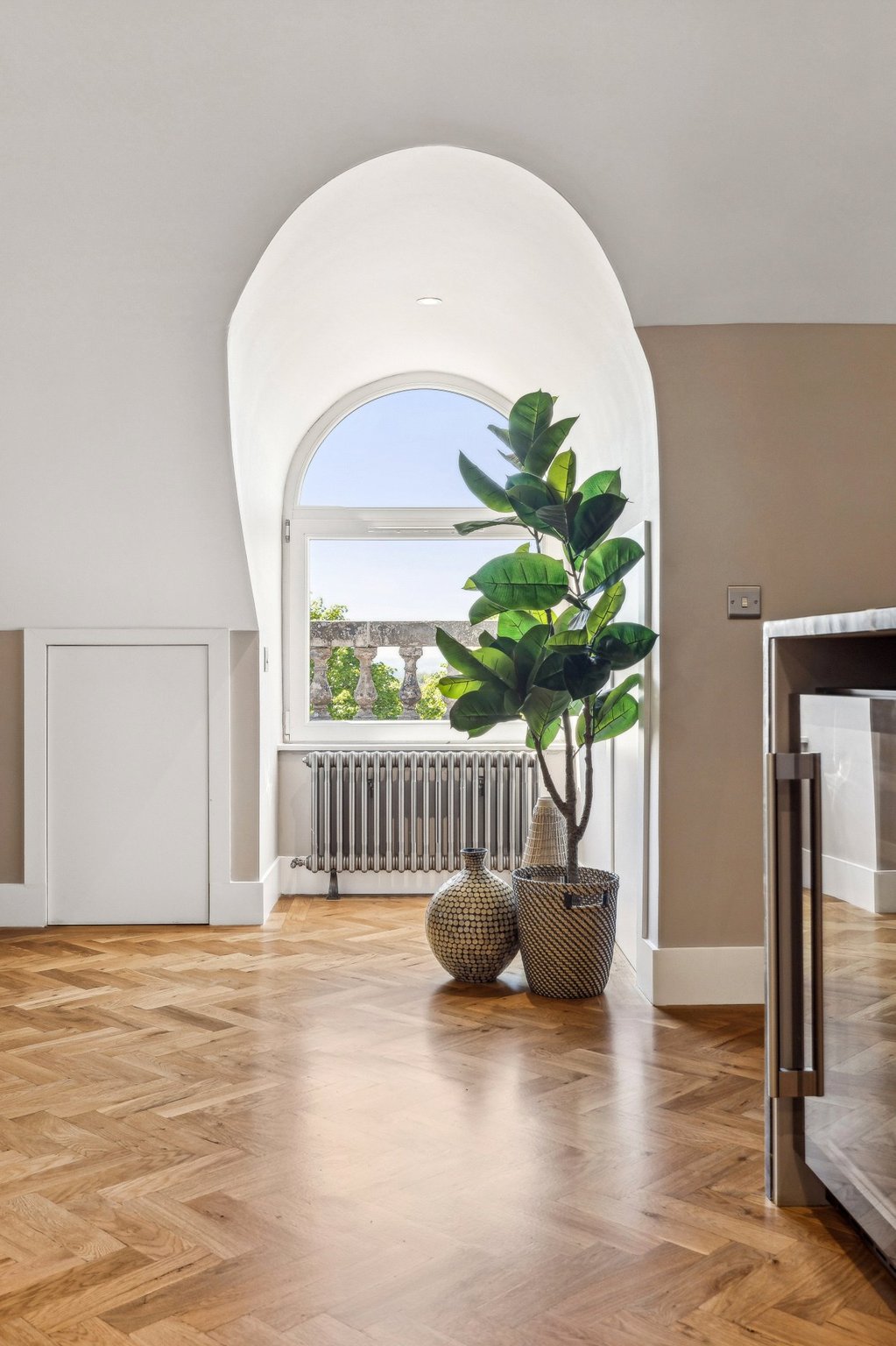 Internally, the flat offers a luxurious specification throughout. The generous reception hallway, lounge/dining space and open-plan kitchen are united by oak herringbone flooring, while high ceilings, arched windows, and quality fixtures contribute to the sense of understated elegance. The principal living space is particularly impressive, offering far-reaching southerly views over Cleveden Gardens towards the hills beyond.