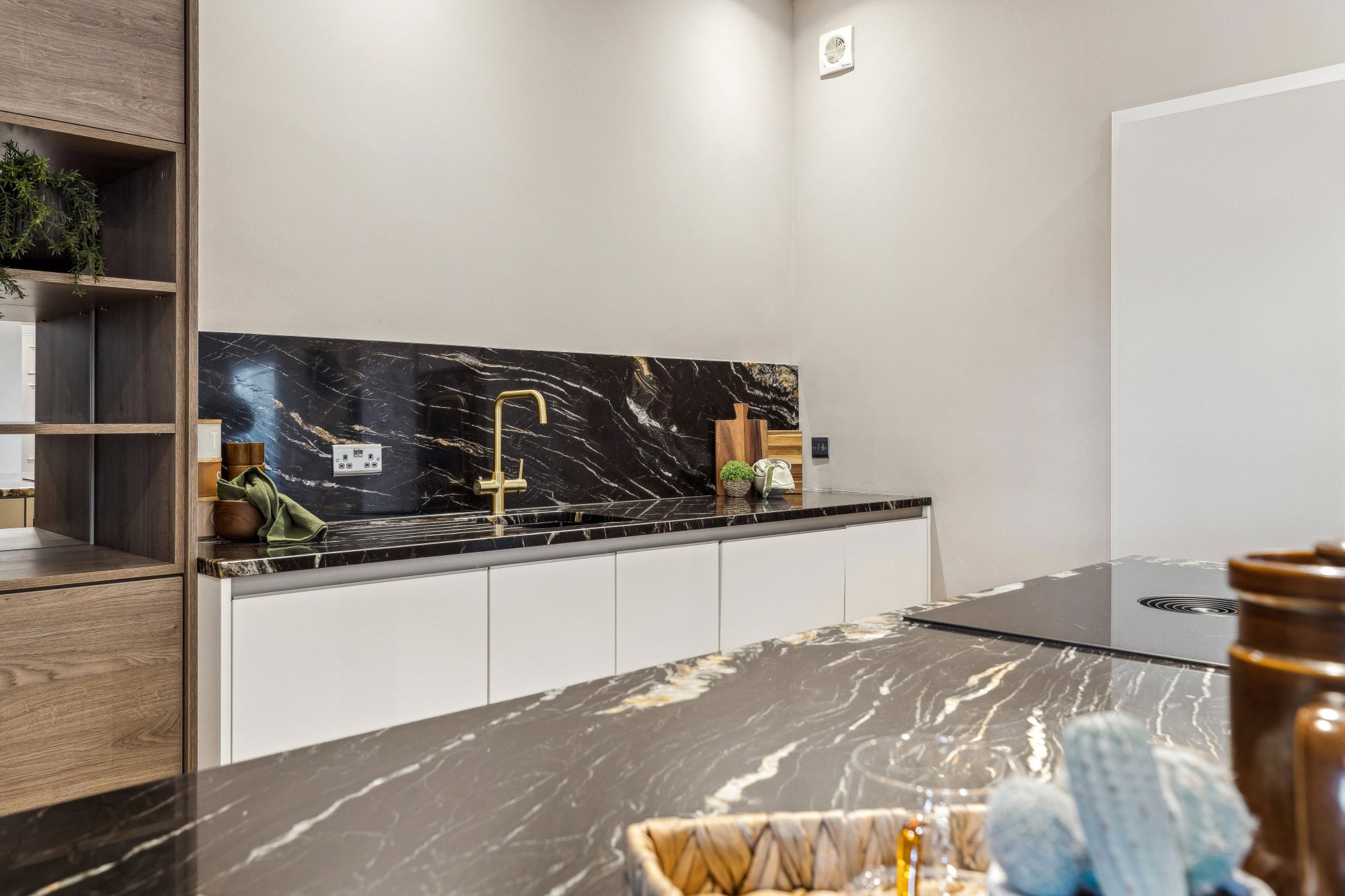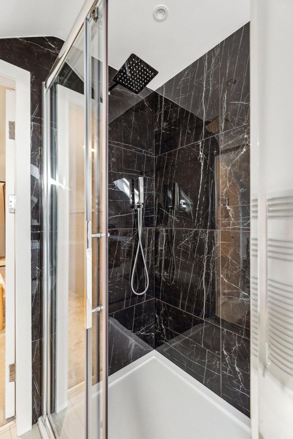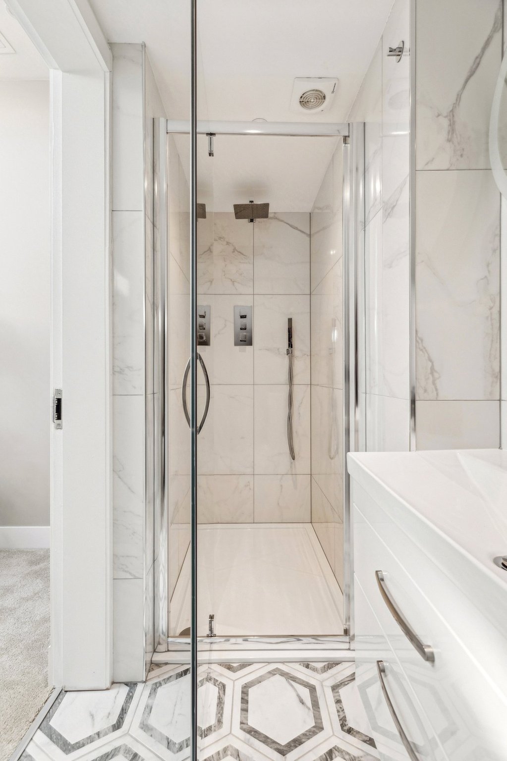 Internally, the flat offers a luxurious specification throughout. The generous reception hallway, lounge/dining space and open-plan kitchen are united by oak herringbone flooring, while high ceilings, arched windows, and quality fixtures contribute to the sense of understated elegance. The principal living space is particularly impressive, offering far-reaching southerly views over Cleveden Gardens towards the hills beyond.