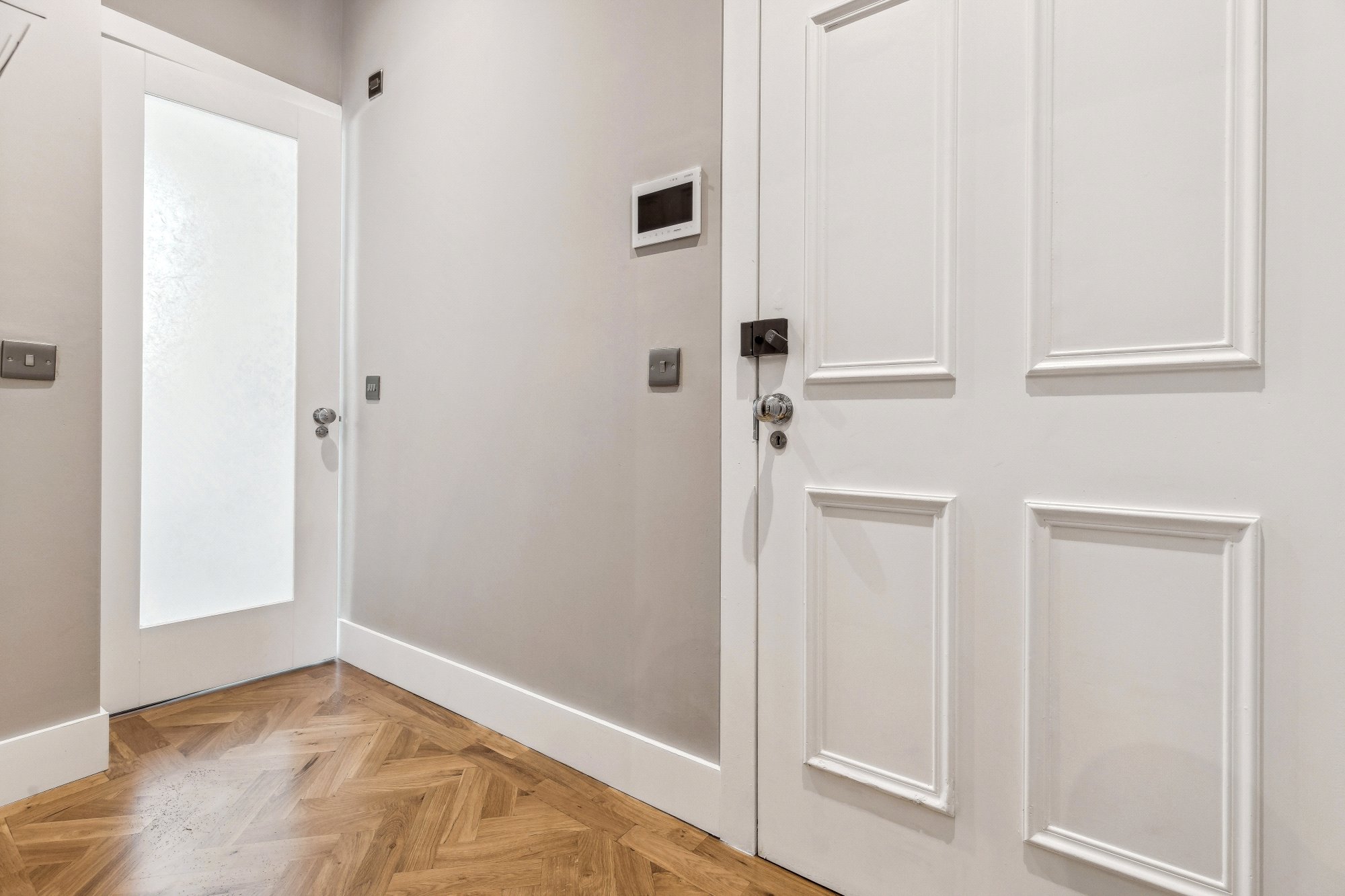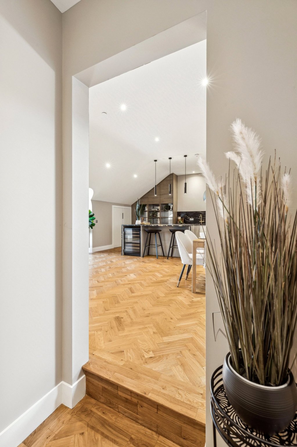 - Reception hall with herringbone flooring and utility cupboard housing Viessmann gas boiler