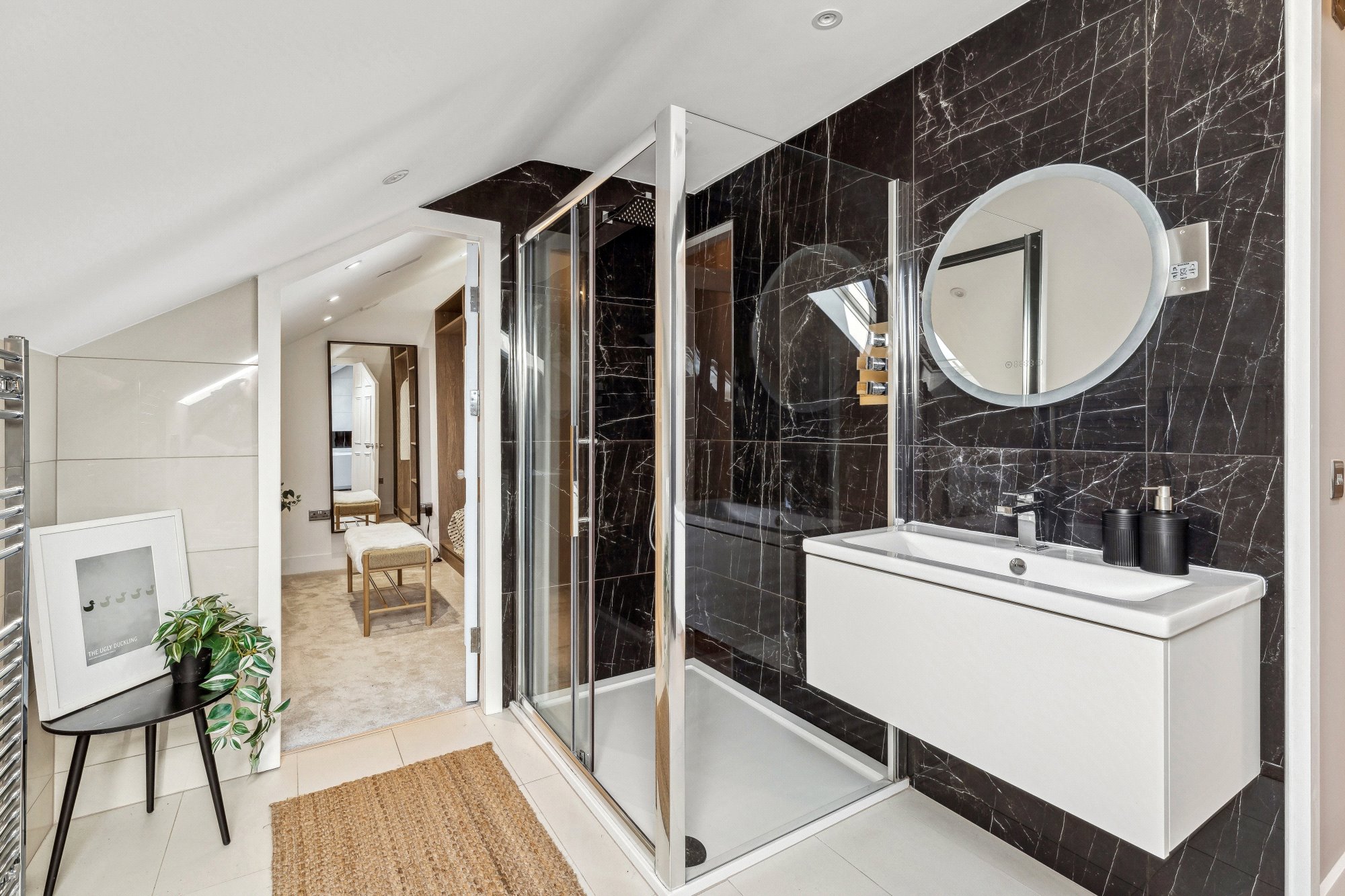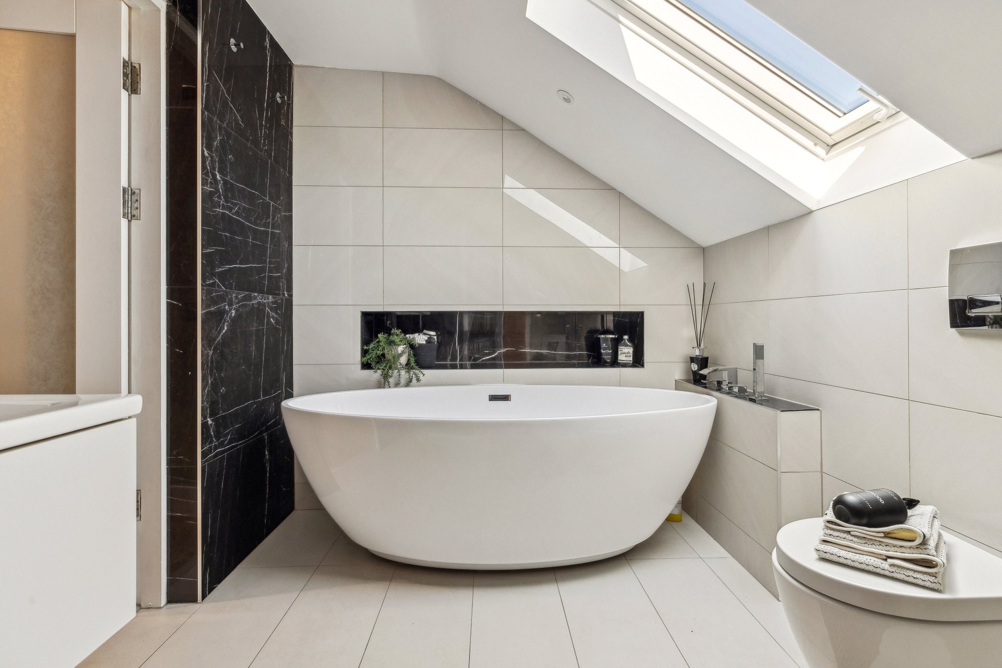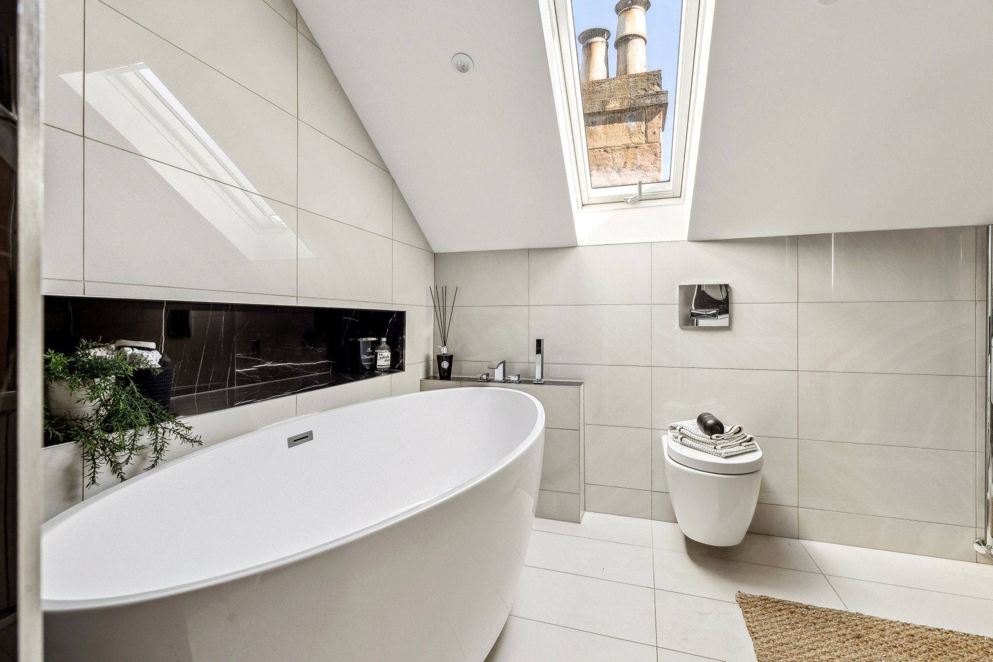 - Luxurious main bathroom by Bagno Design with four-piece suite including freestanding bath and separate shower; Velux window