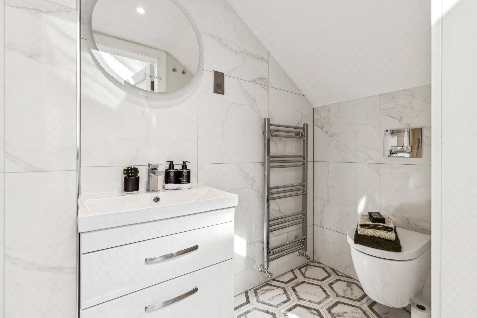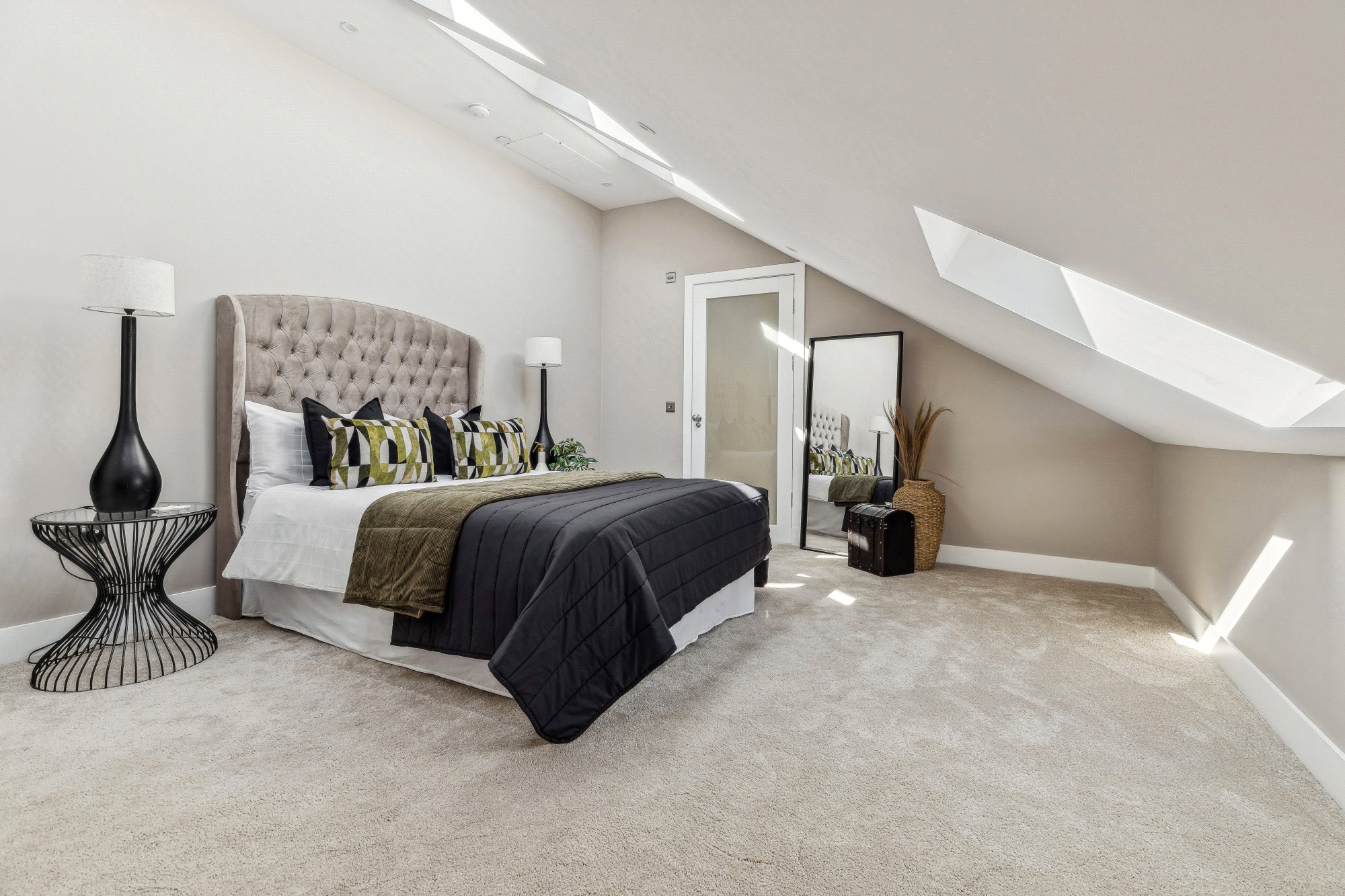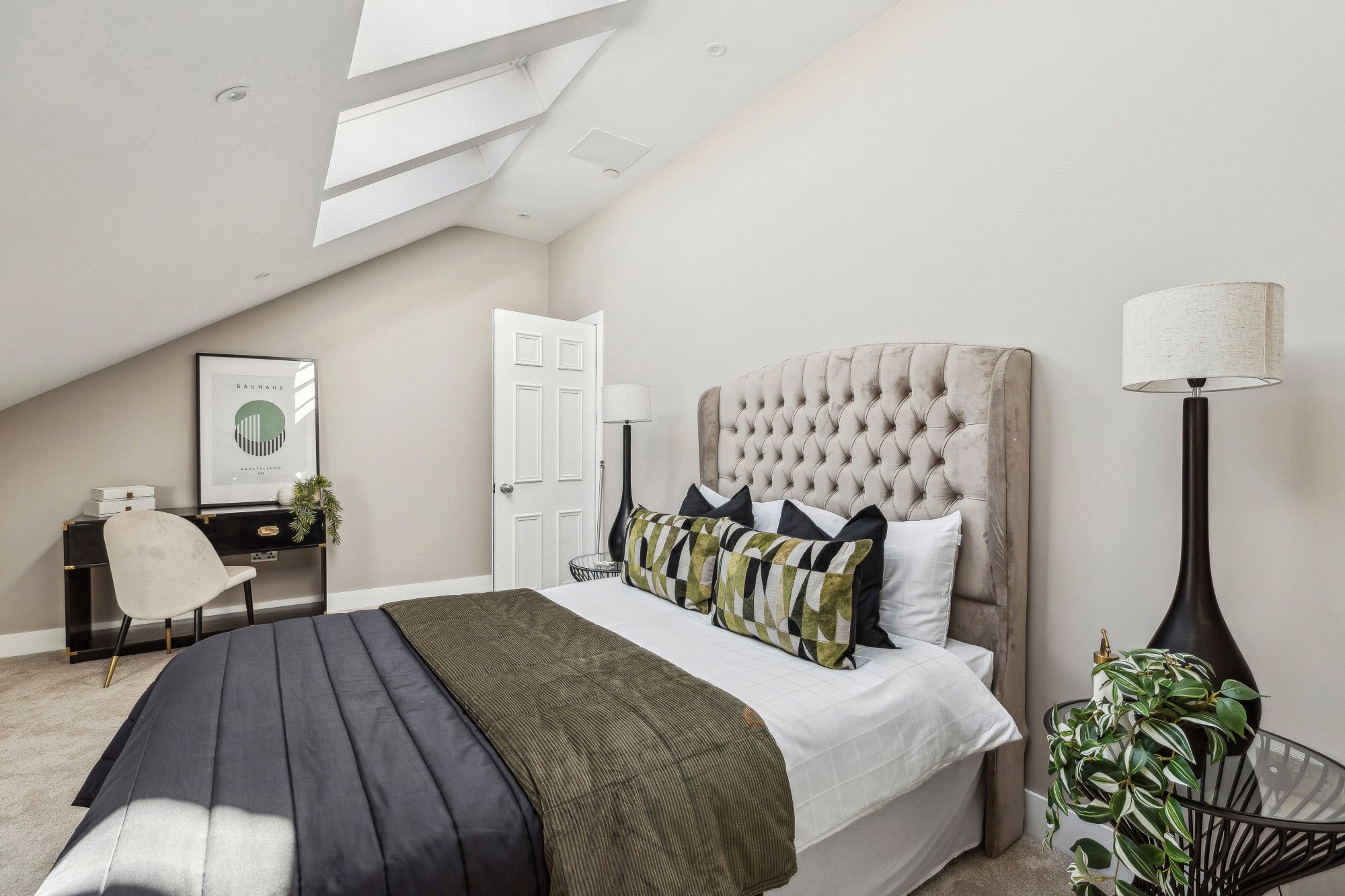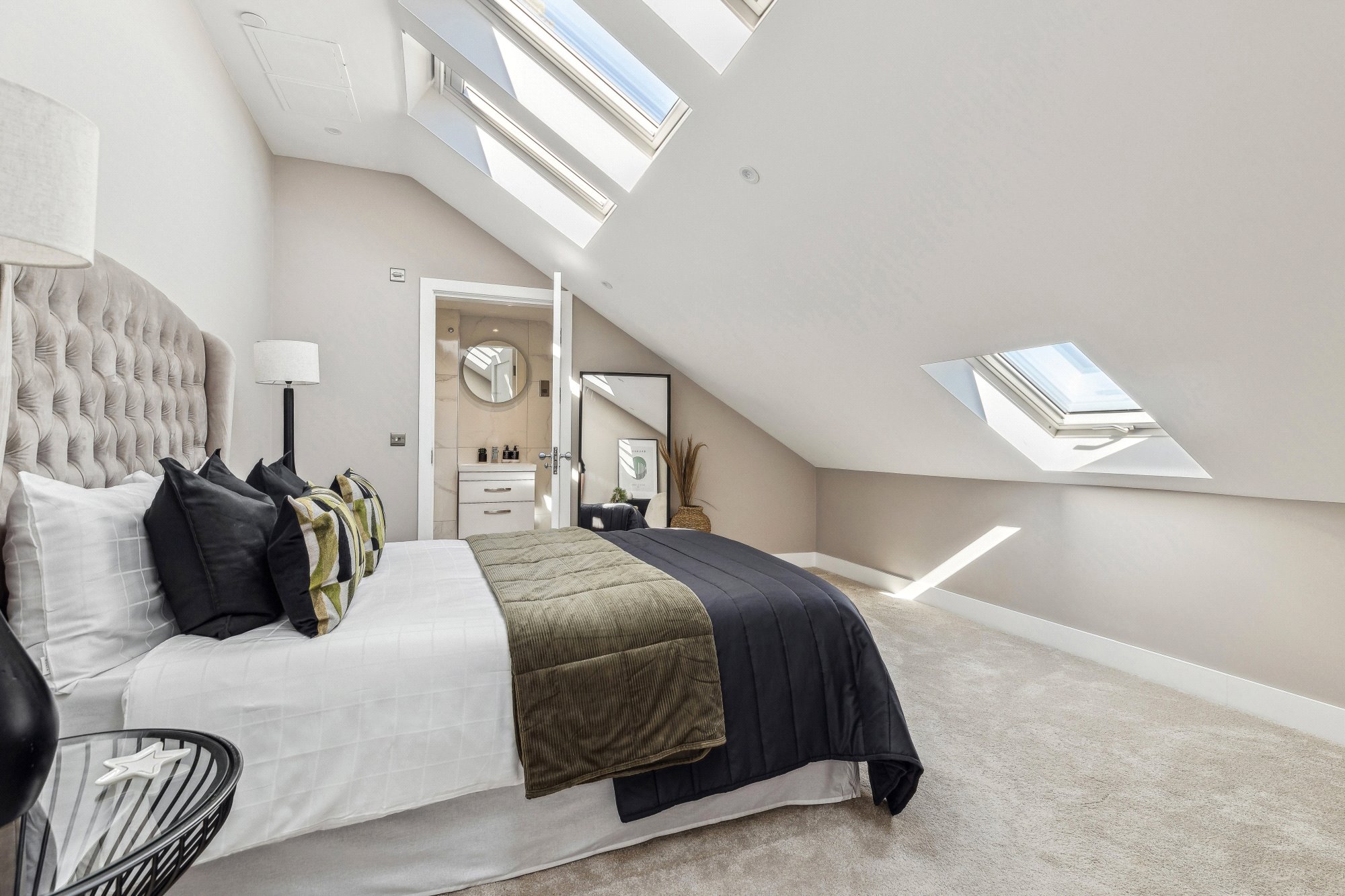 - Luxurious main bathroom by Bagno Design with four-piece suite including freestanding bath and separate shower; Velux window