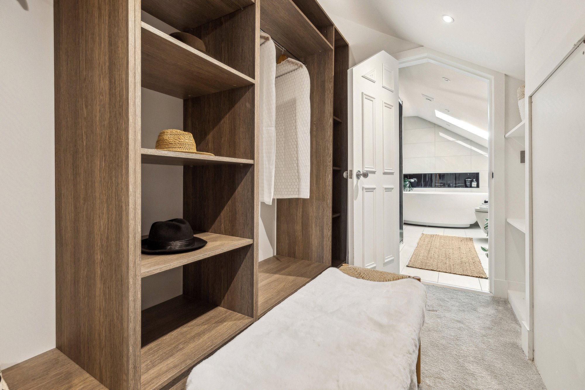 - Spacious lounge/dining area with two arched windows, open outlook, herringbone flooring, and eaves storage