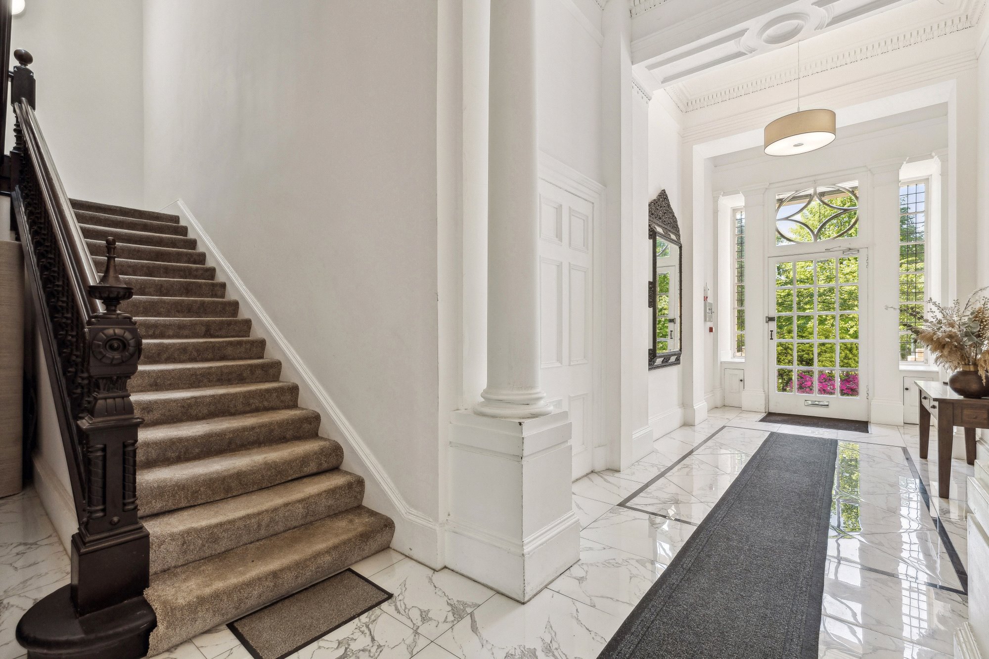 - Elegant communal hallway with original stair and ornate cupola above the second-floor landing