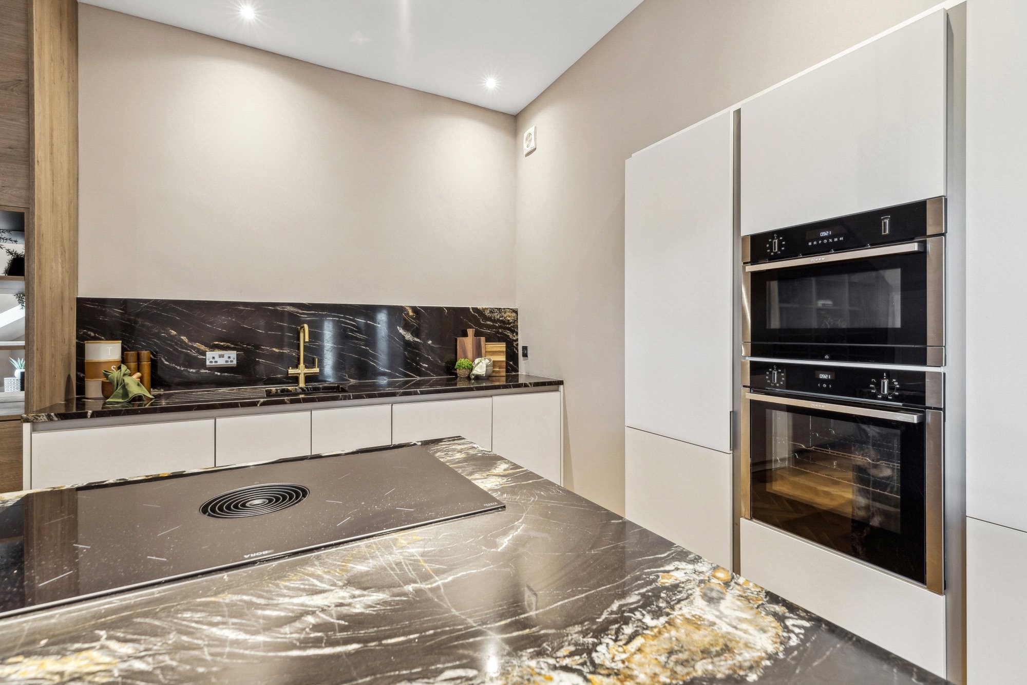 - Stunning open-plan kitchen by Bagno Design with large marble island, integrated Hotpoint and Neff appliances, Bora hob, wine fridge, hidden utility cupboard with washer/dryer, and generous cabinetry