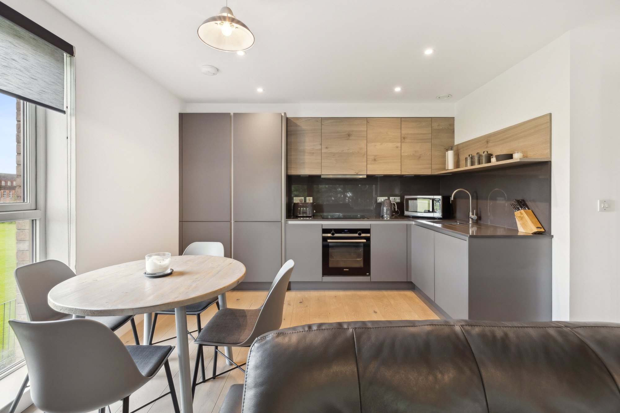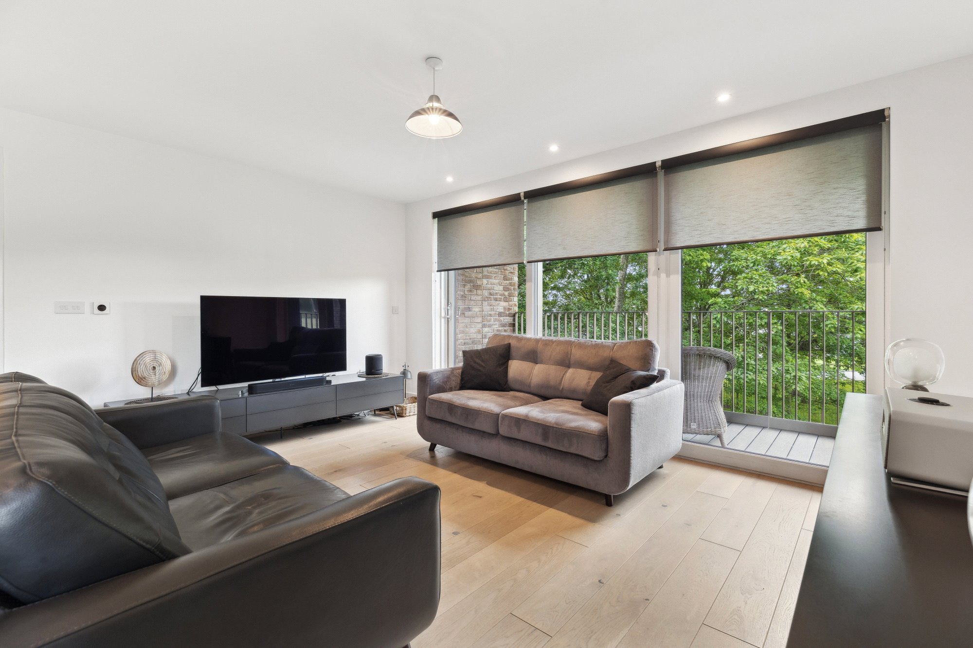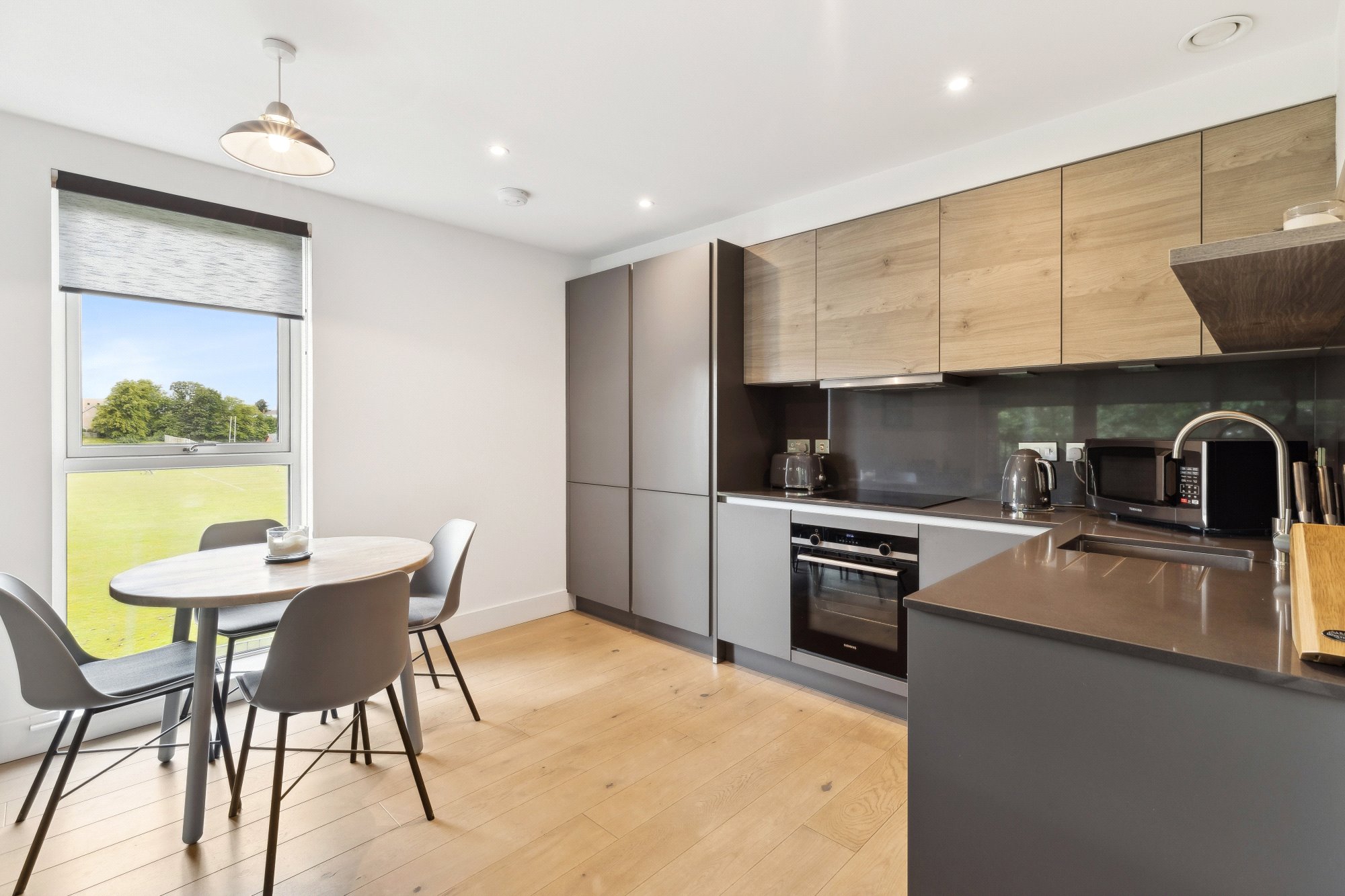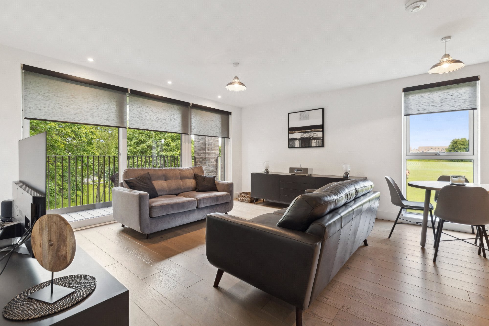 The accommodation extends to: welcoming entrance hall with utility cupboard, a stunning open-plan kitchen, dining, and living area with full-height windows and sliding doors that lead directly onto a private balcony. The contemporary kitchen includes sleek cabinetry and integrated Siemens appliances. The king-sized bedroom features in-built wardrobes, while the contemporary bathroom is finished with a white suite, contrasting grey tiling, and shower over bath.
