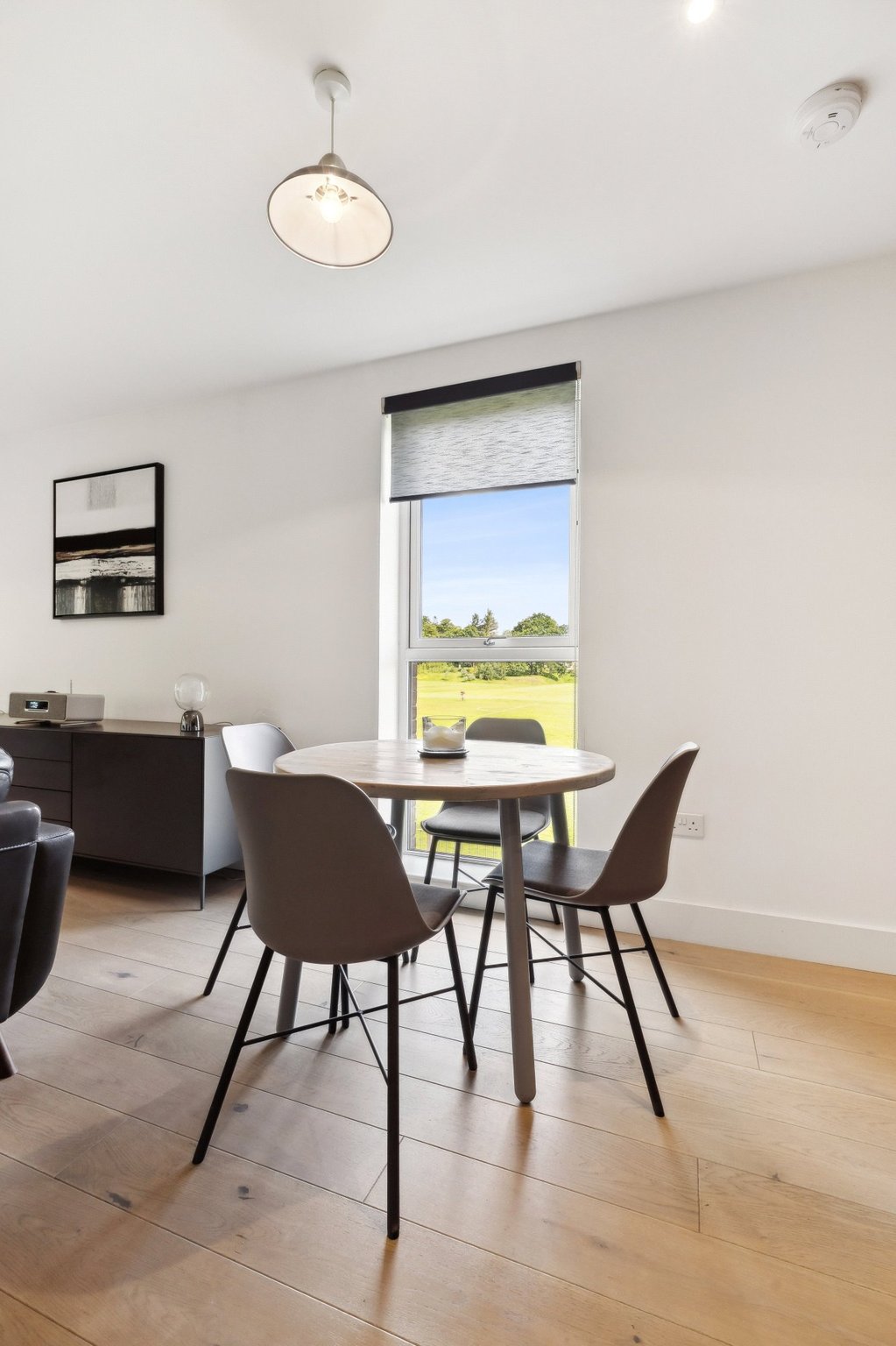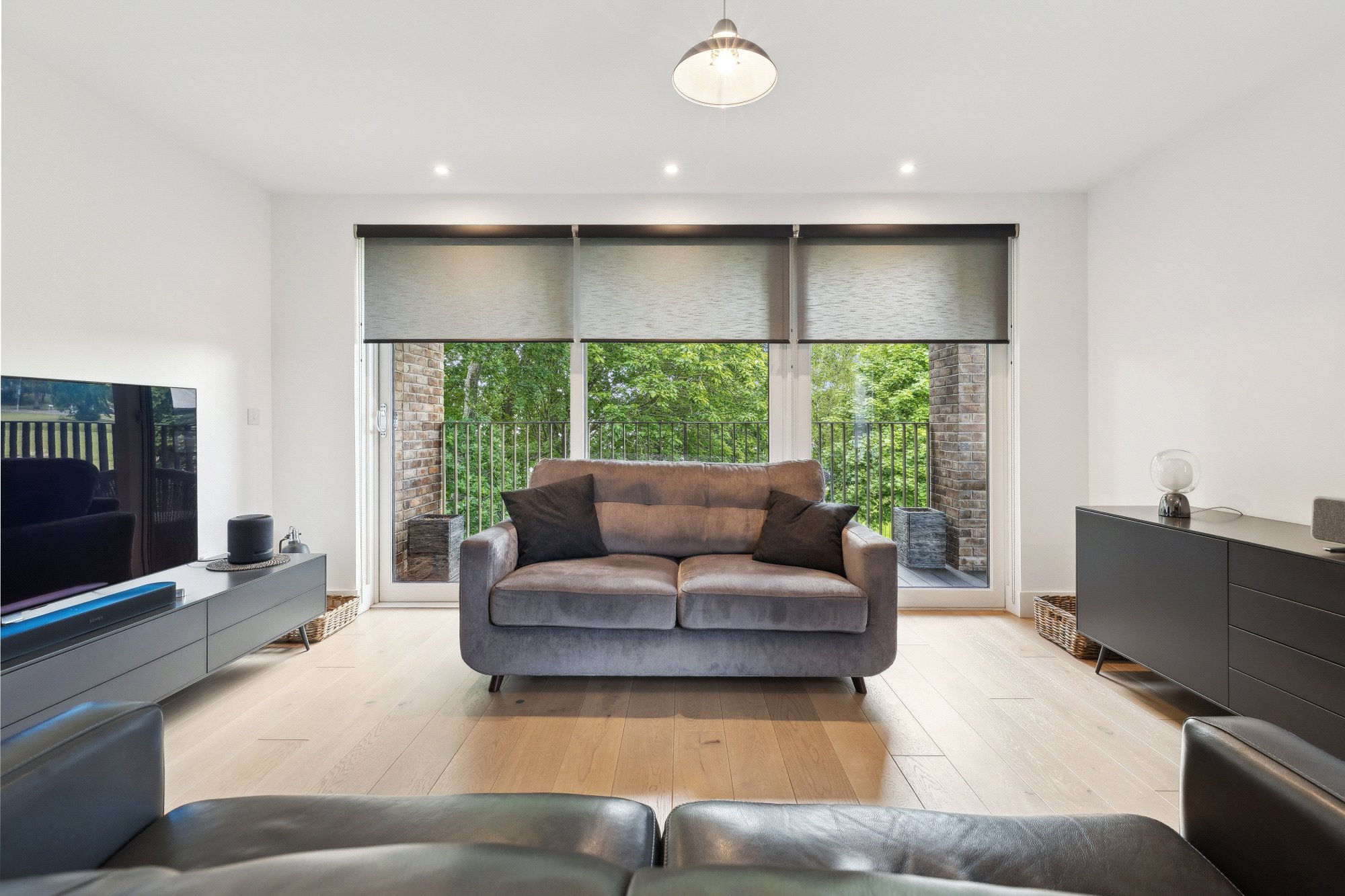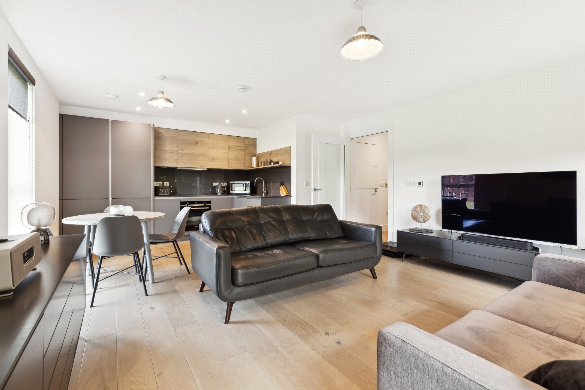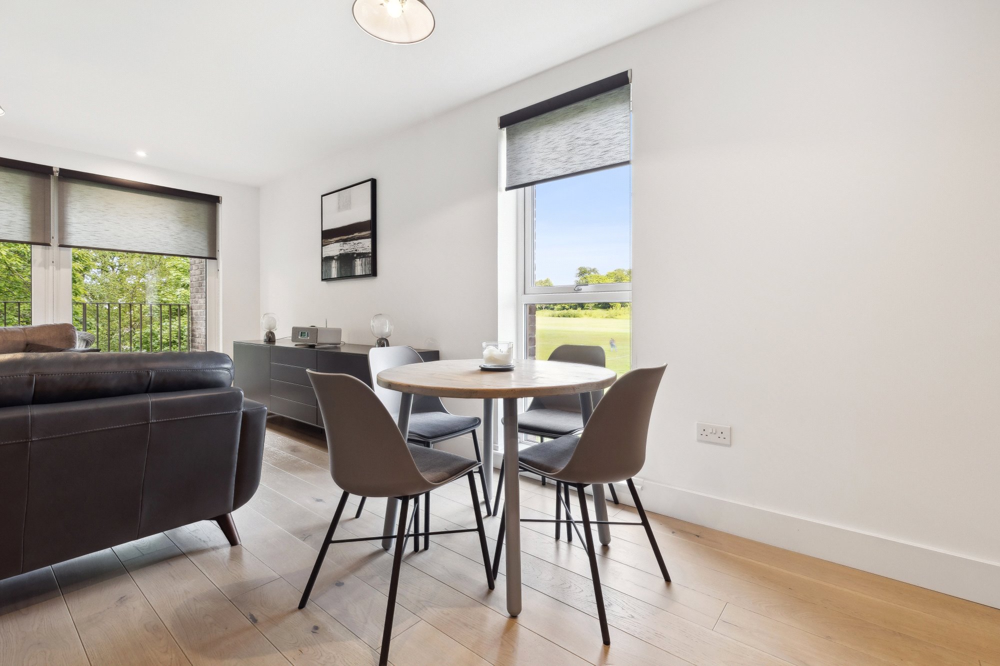 The accommodation extends to: welcoming entrance hall with utility cupboard, a stunning open-plan kitchen, dining, and living area with full-height windows and sliding doors that lead directly onto a private balcony. The contemporary kitchen includes sleek cabinetry and integrated Siemens appliances. The king-sized bedroom features in-built wardrobes, while the contemporary bathroom is finished with a white suite, contrasting grey tiling, and shower over bath.