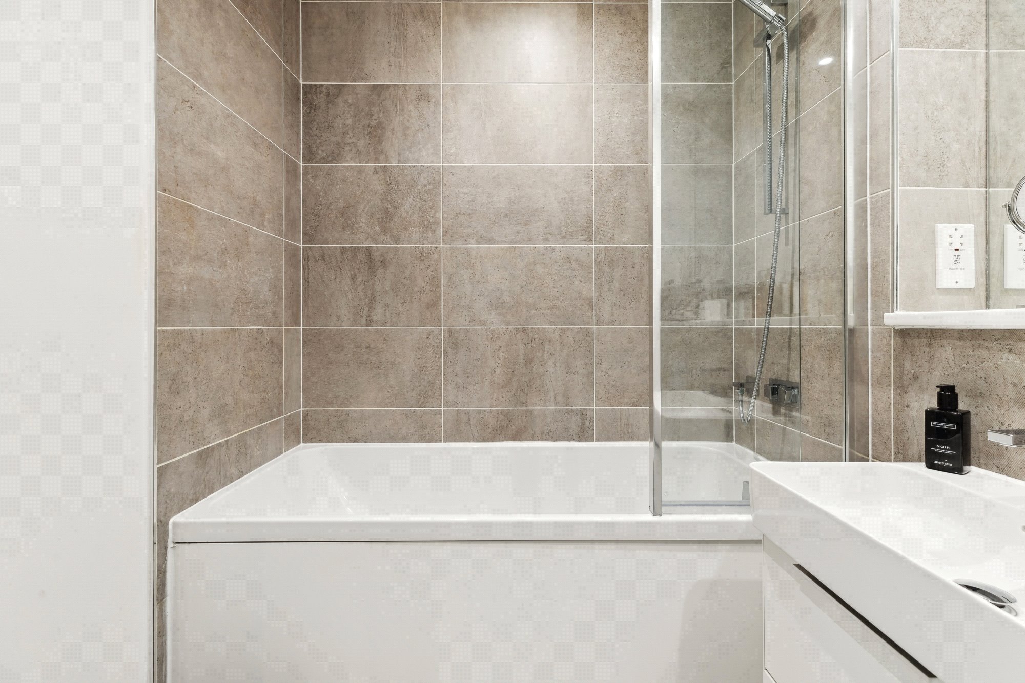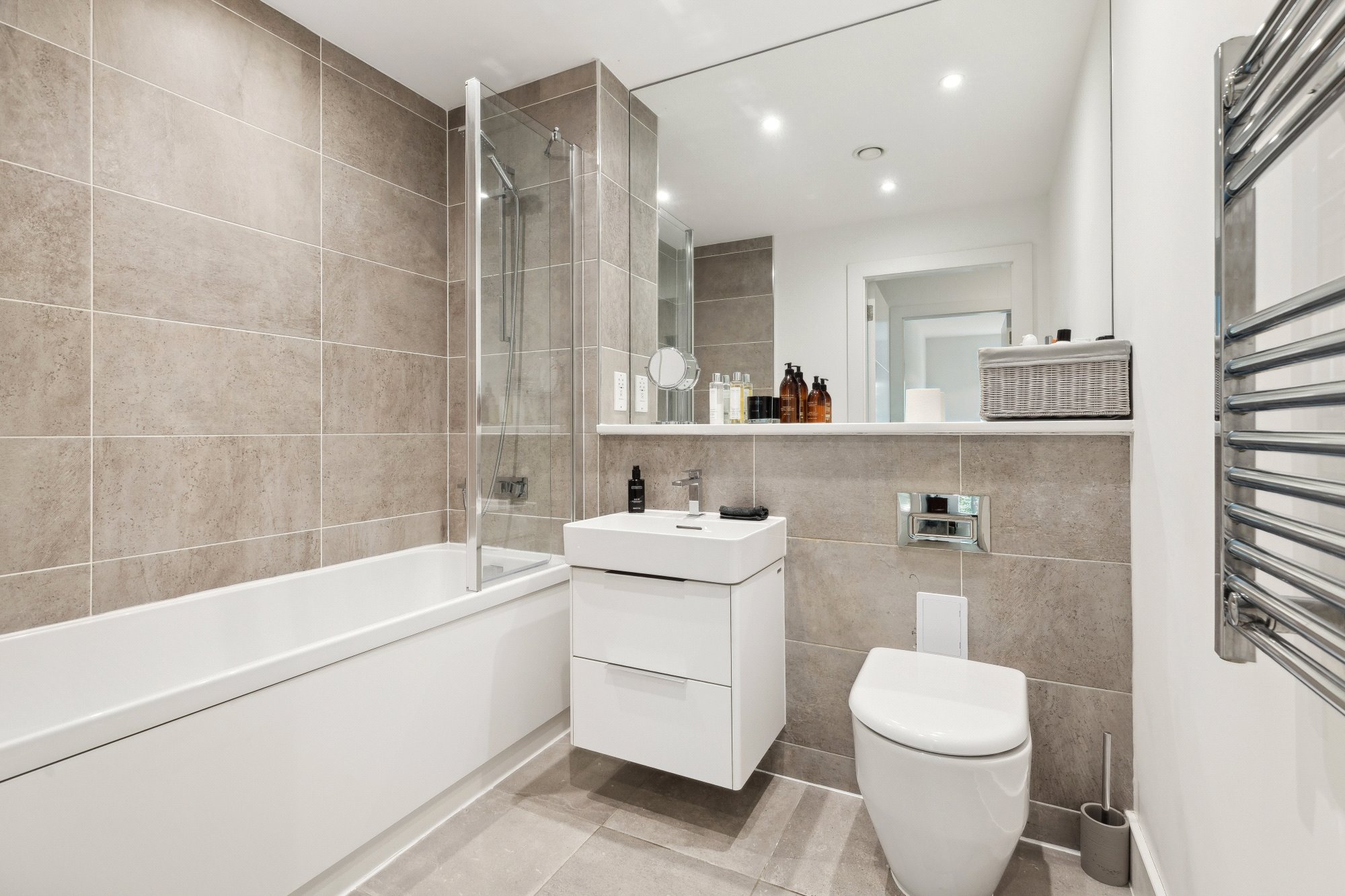 • Stylish bathroom with white suite and grey tiling