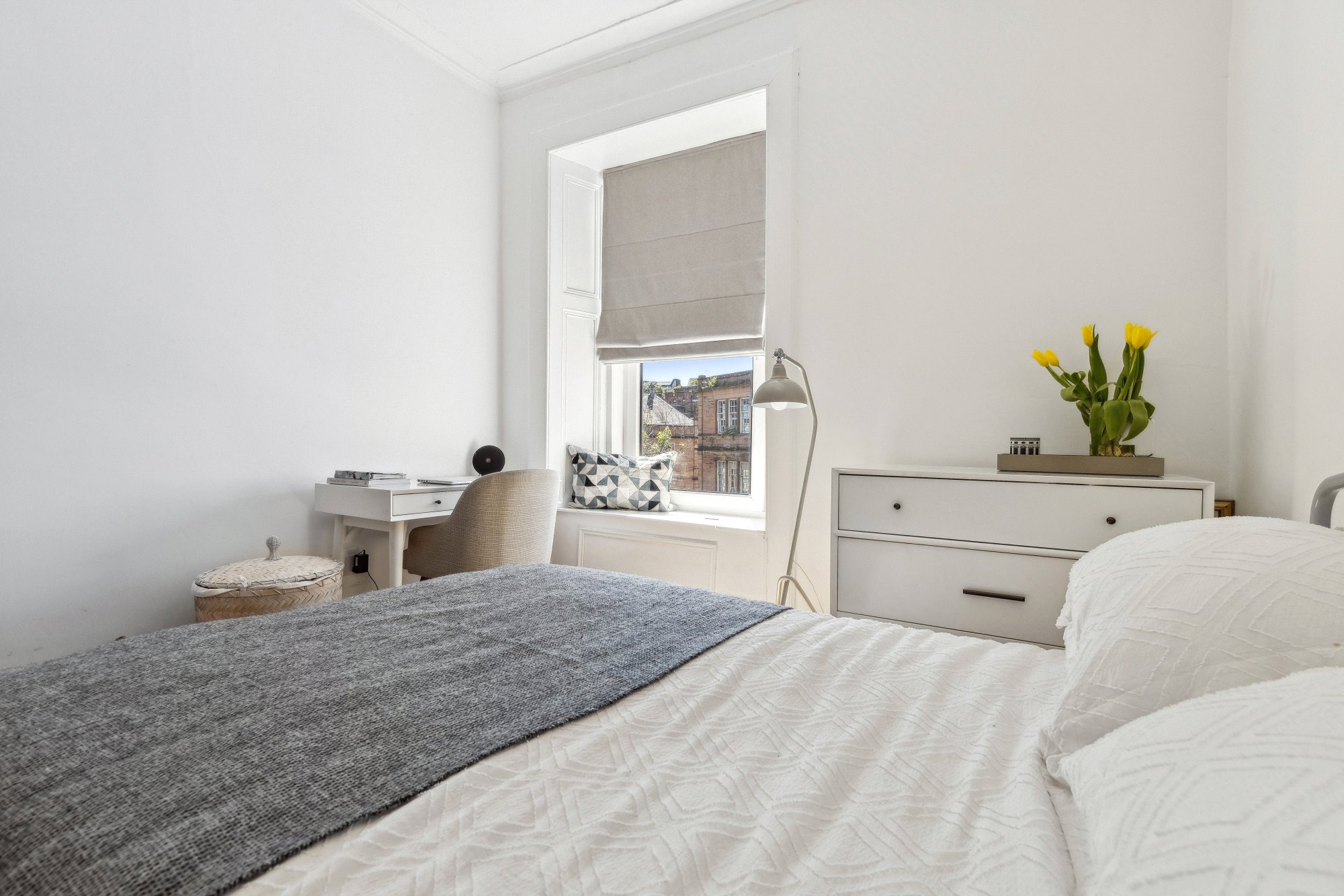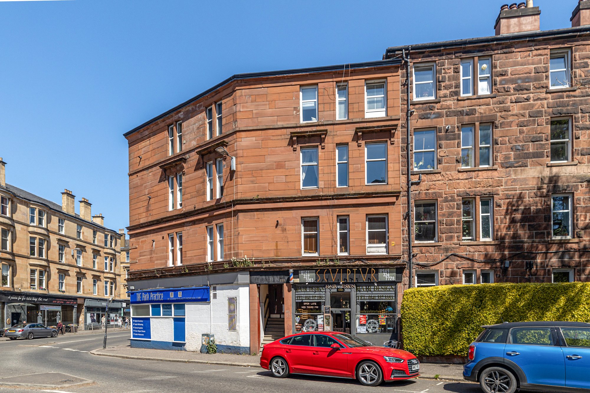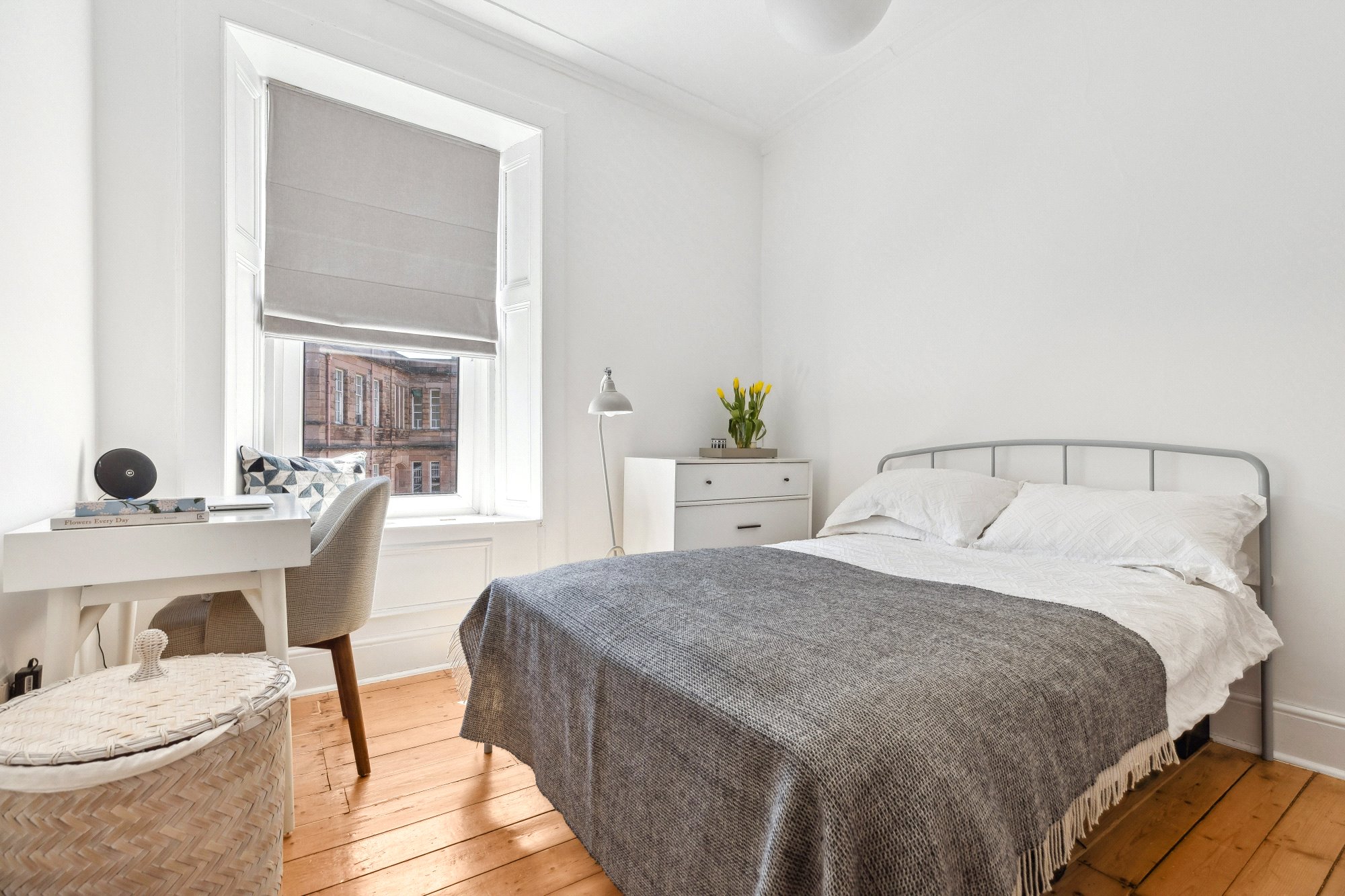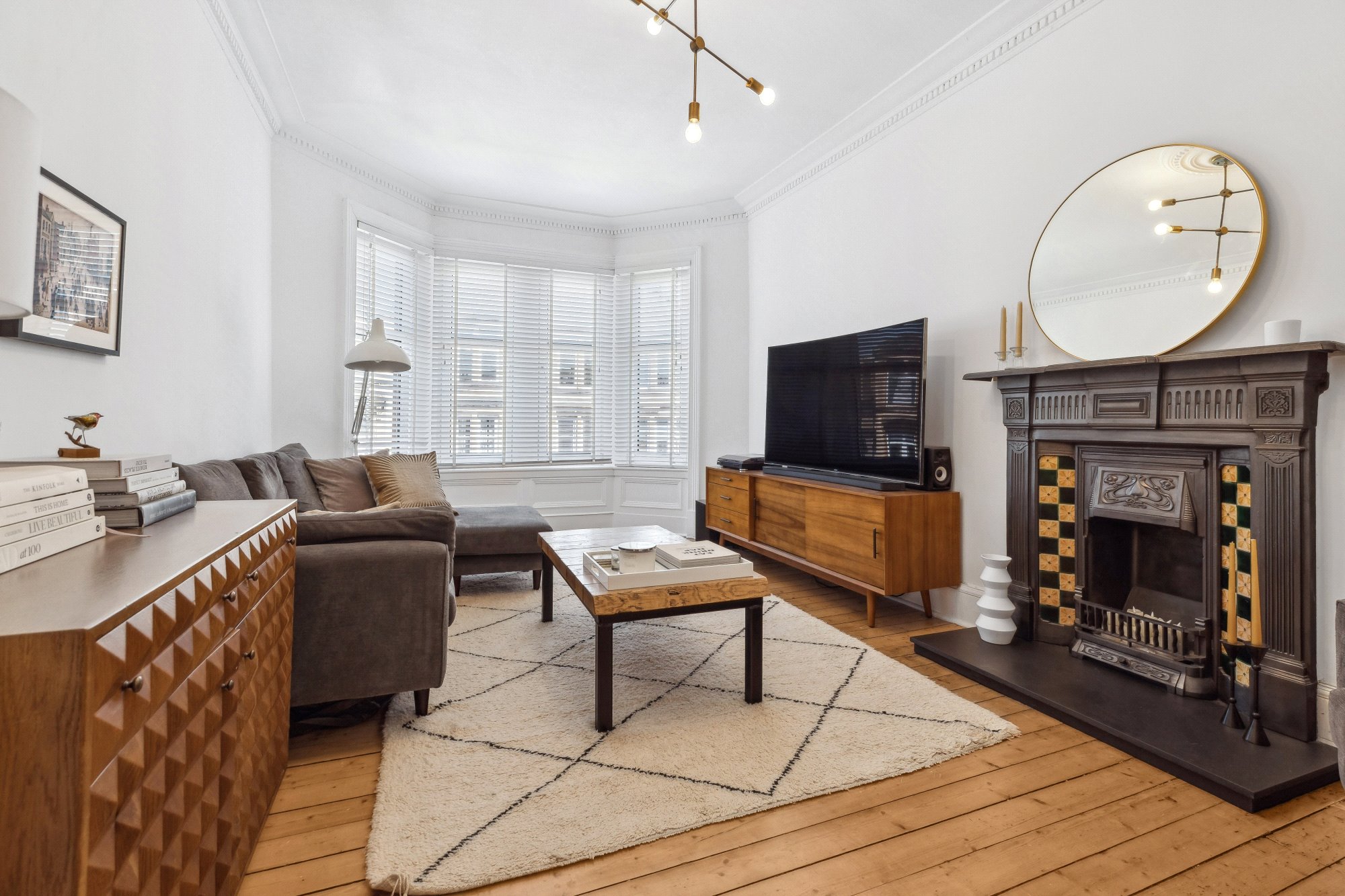 Occupying a prominent third floor position within a traditional red sandstone tenement building this is a beautifully presented and generously proportioned two-bedroom flat. Offering naturally bright and spacious accommodation this immediately impressive home has been comprehensively upgraded by the present owners and is presented in turnkey condition throughout. The interior includes a fabulous bay windowed lounge, a separate dining kitchen, two double bedrooms and a contemporary three-piece bathroom. Additional features include a useful storage cupboard off the reception hall, fitted wardrobes in bedroom two, wooden flooring in the lounge and both bedrooms, a focal point fireplace, natural wooden finishes and ceiling cornice.