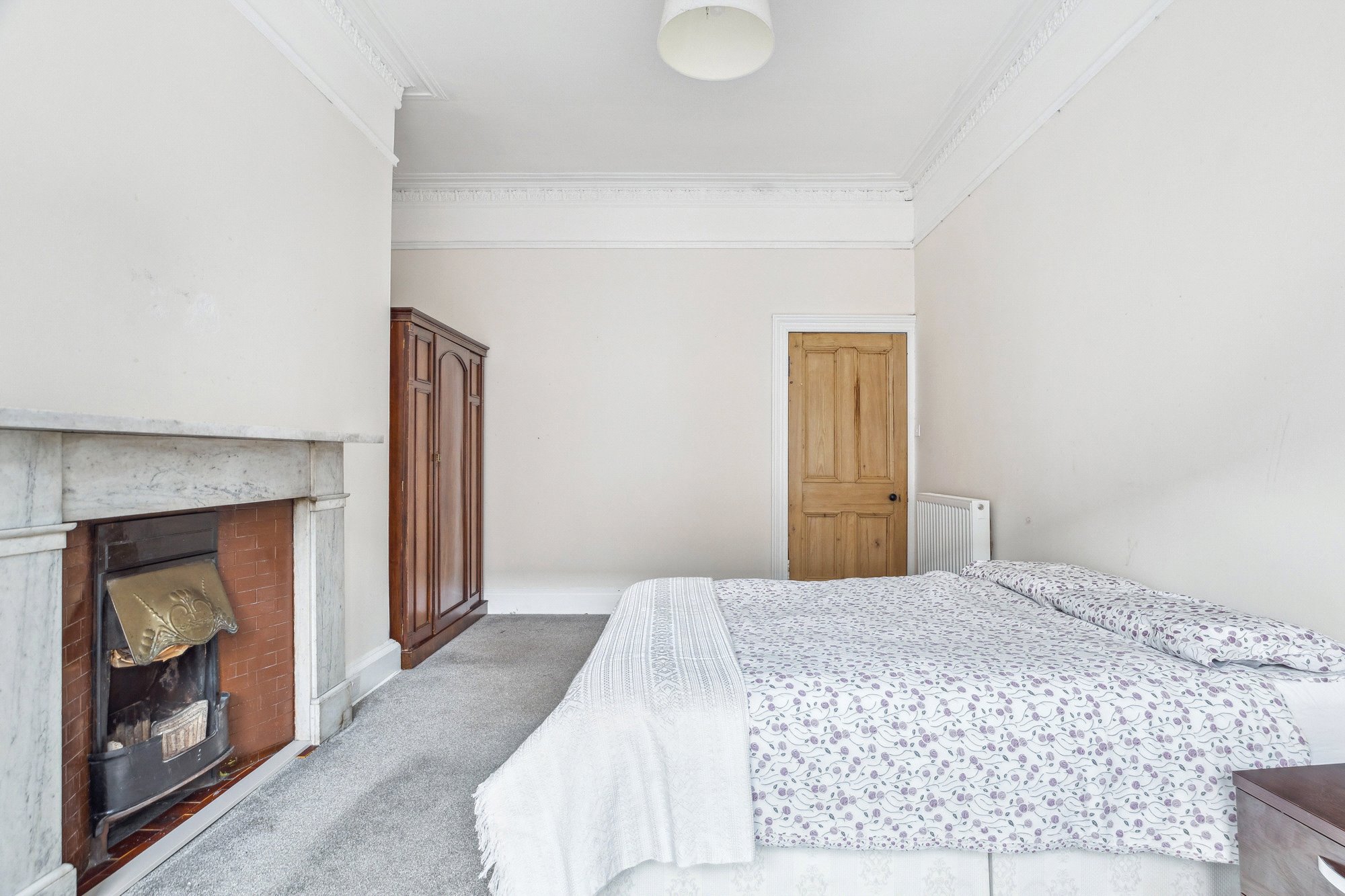 - Bedroom one with two section window to the front, ceiling cornice, shelved press and focal point fireplace