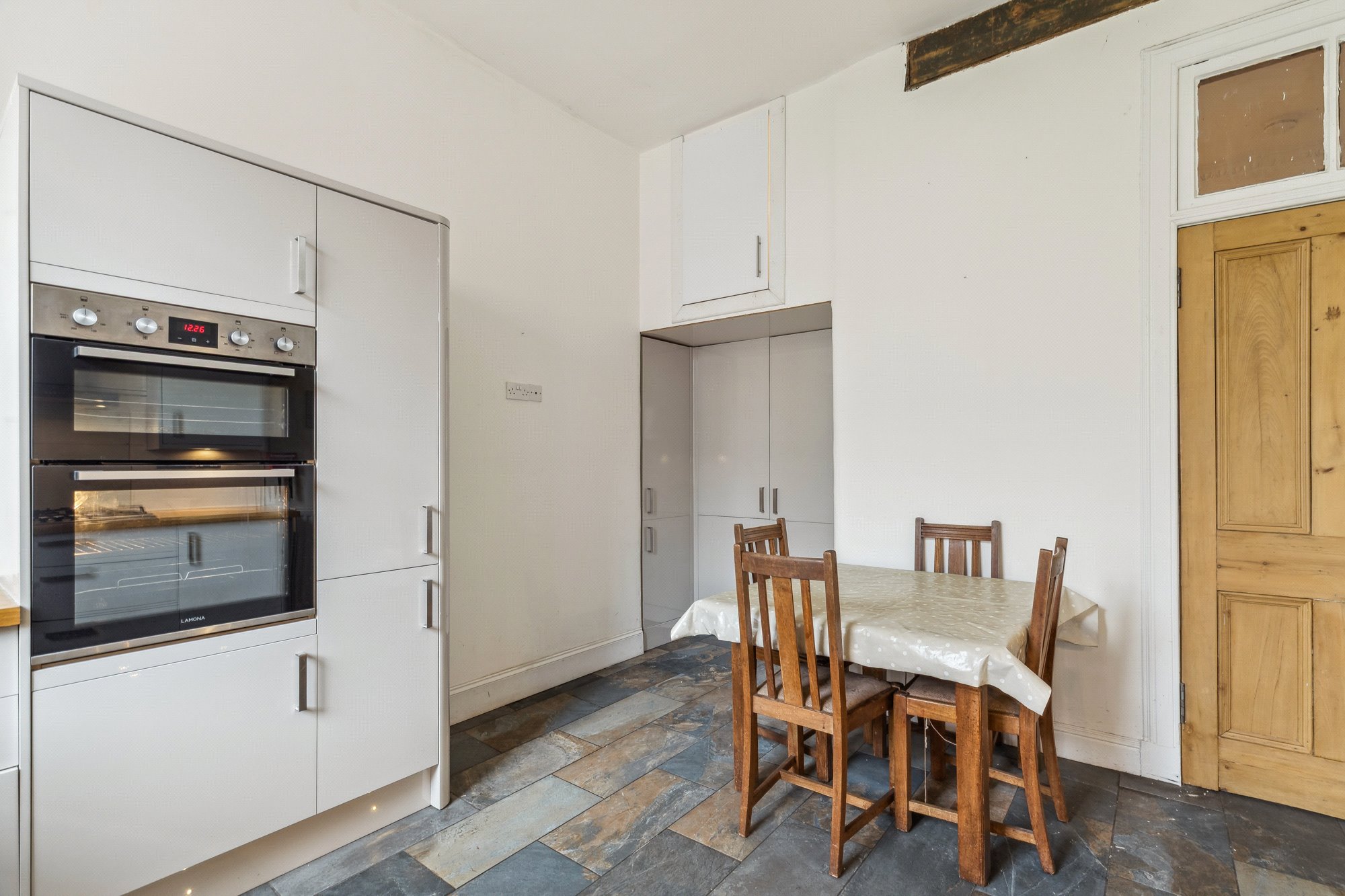- Dining kitchen complete with a range of base and wall units, integrated appliances, overhead storage and window to the rear