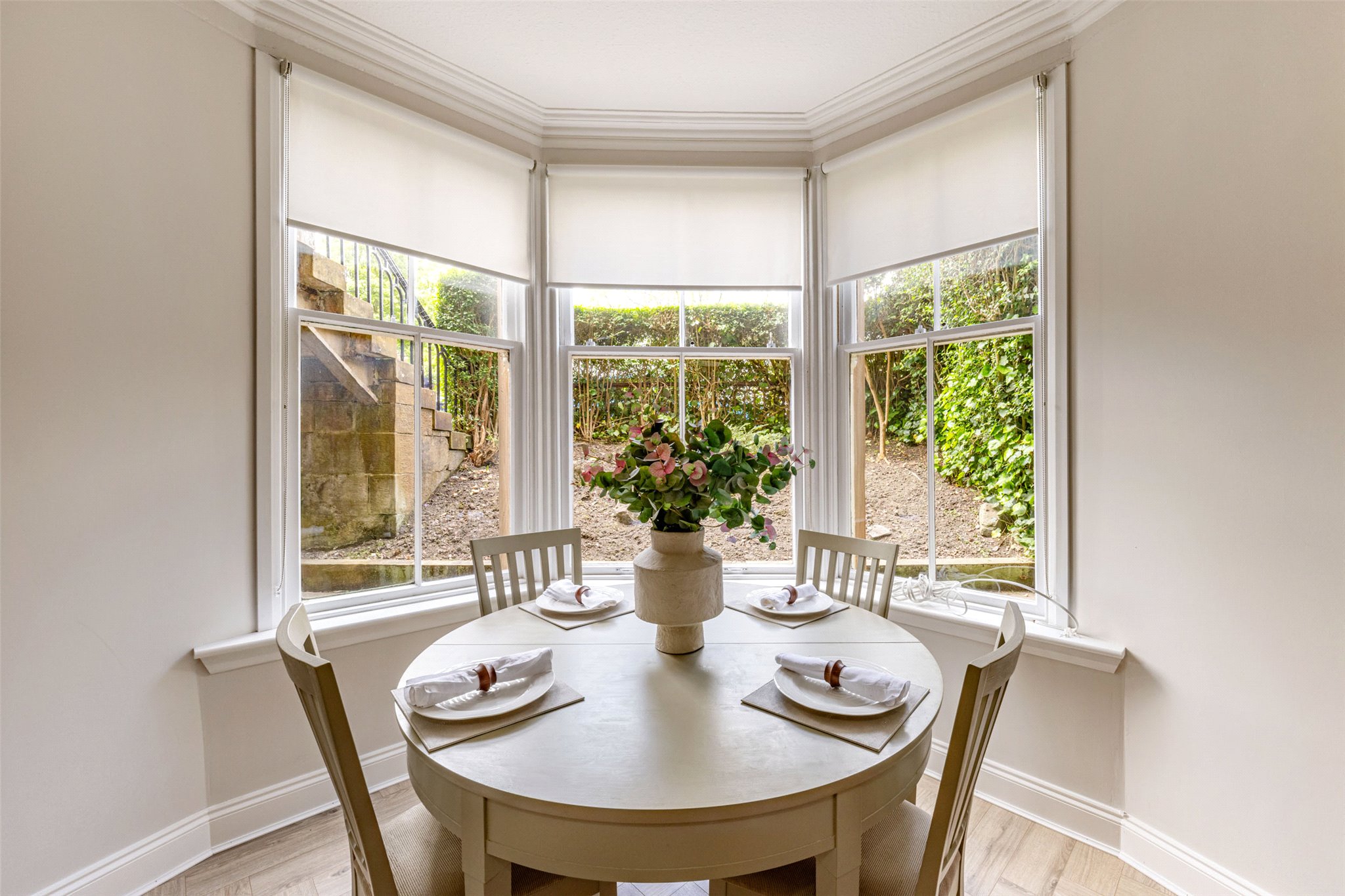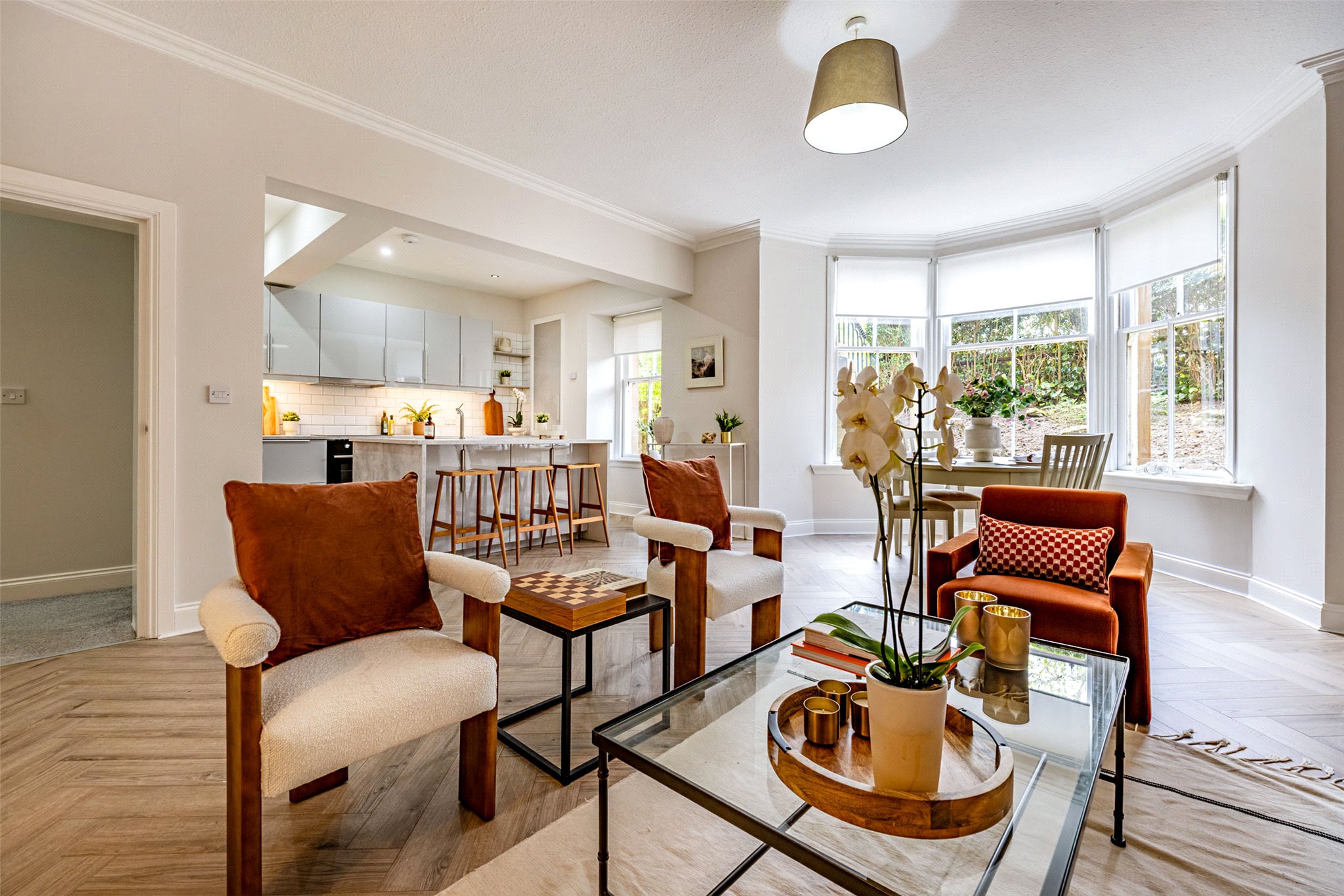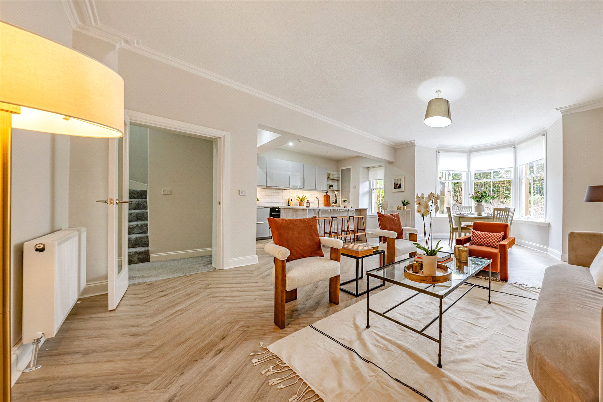 - Bright front facing living/dining room with delicate ceiling cornice, three section bay window and open Plan kitchen
