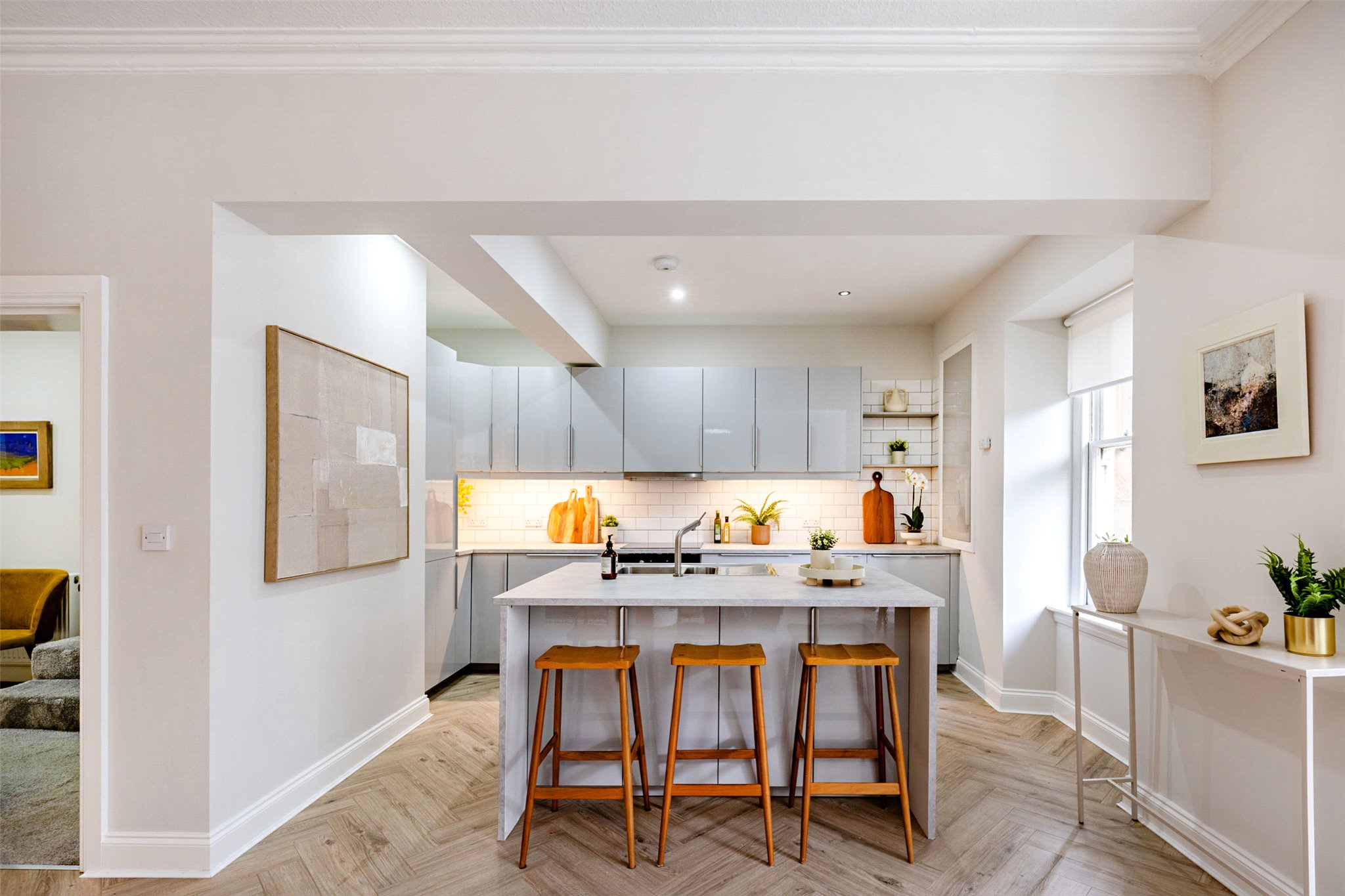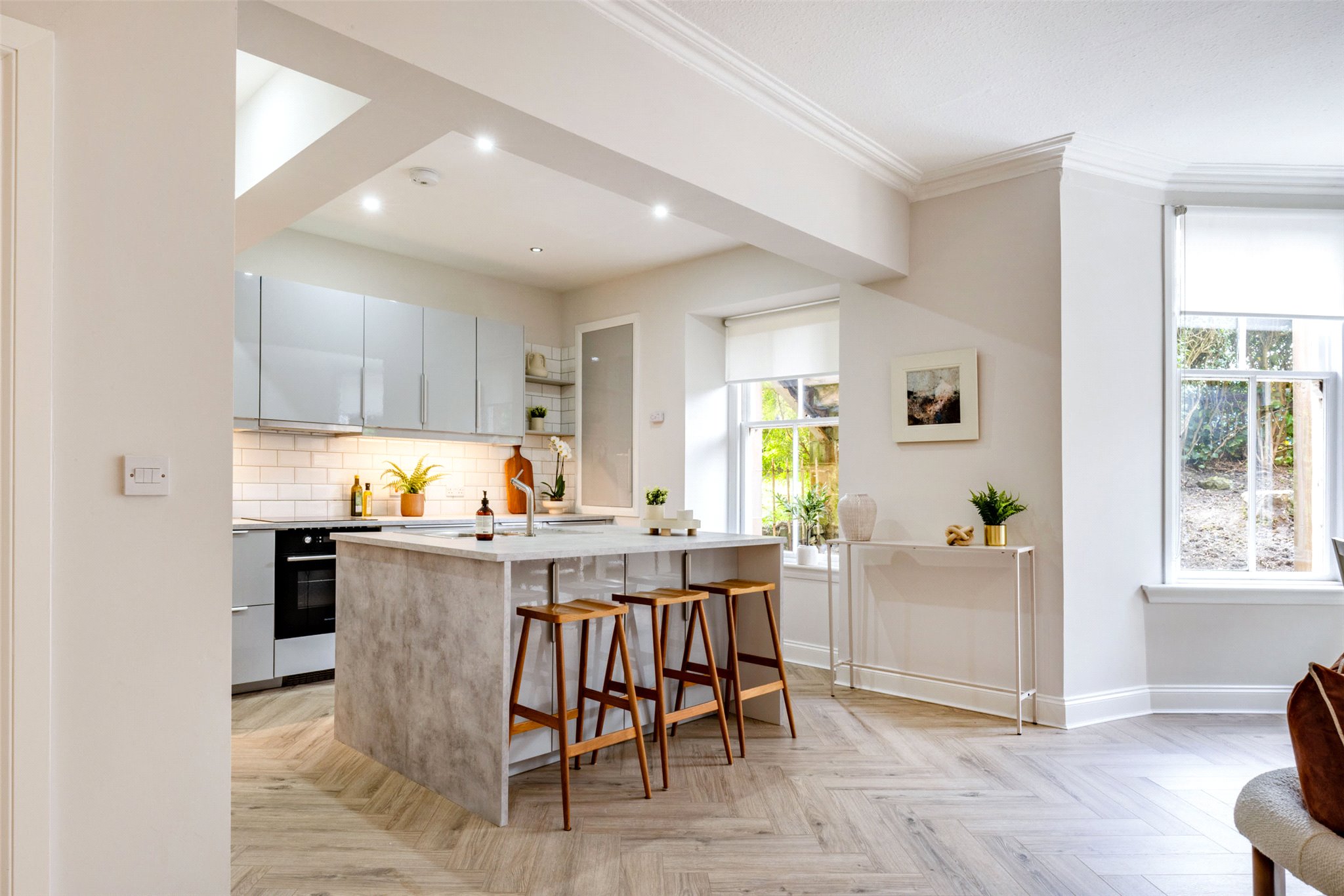 - The kitchen is complete with a contemporary range of base and wall units, contrasting surfaces, tiled back splash, and there is an island incorporation a section for barstools
