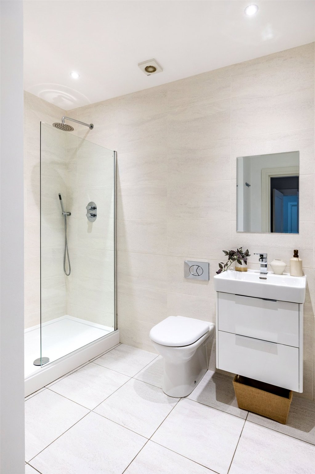 - Contemporary three-piece ensuite shower room include WC, floating wash and basin with double drawer vanity storage, large walk-in shower with rainwater and handheld fittings, all complimented with partially tiled wall coverings, tiled floor coverings, and a chrome heated towel rail