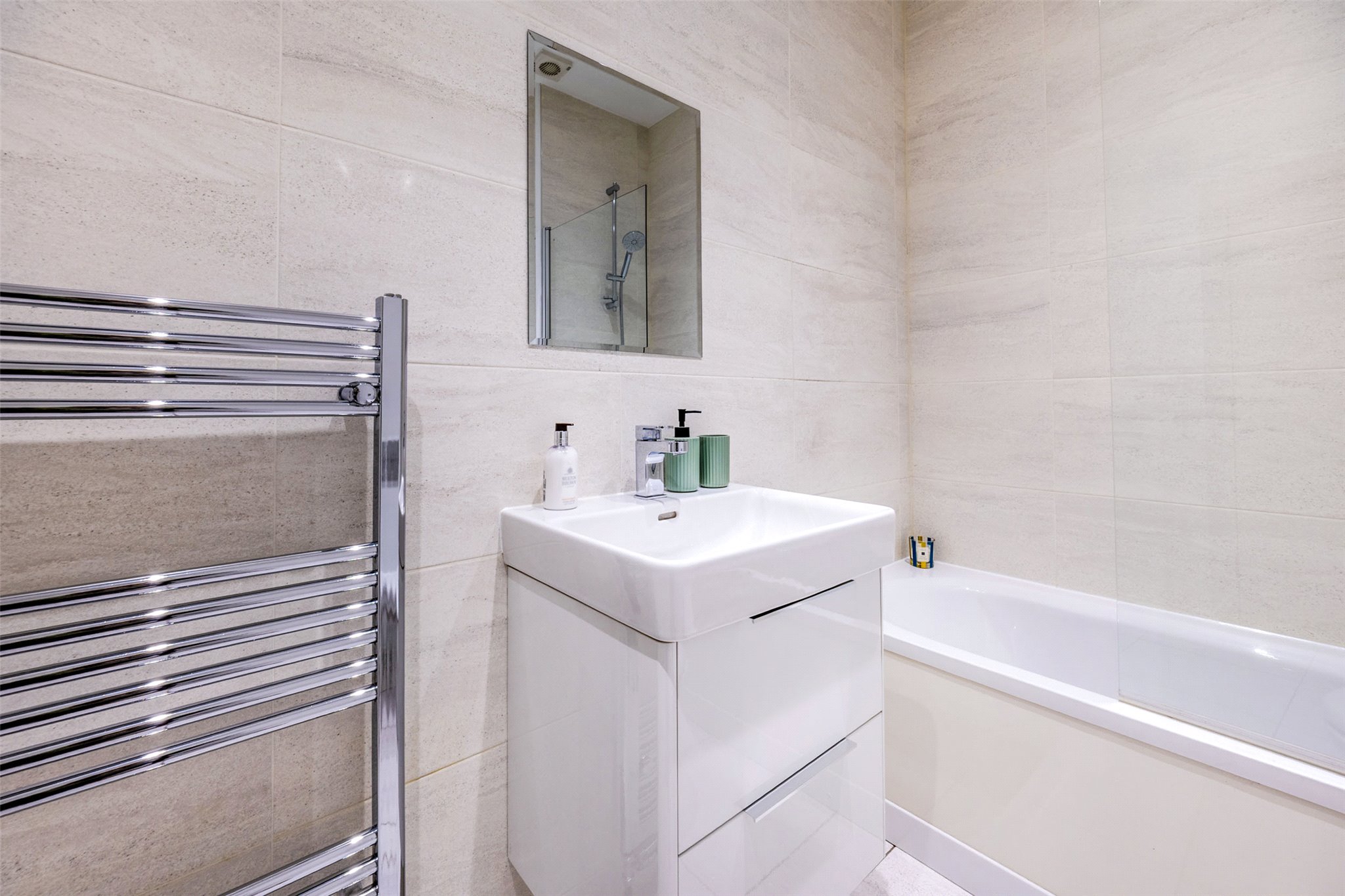 - Bathroom complete with a stylish white three piece suite to include WC, wash hand basin with double drawer storage, and bath with shower attachment over, all complimentary with partially tiled wall coverings, tiled floor coverings, and a chrome heated towel rail