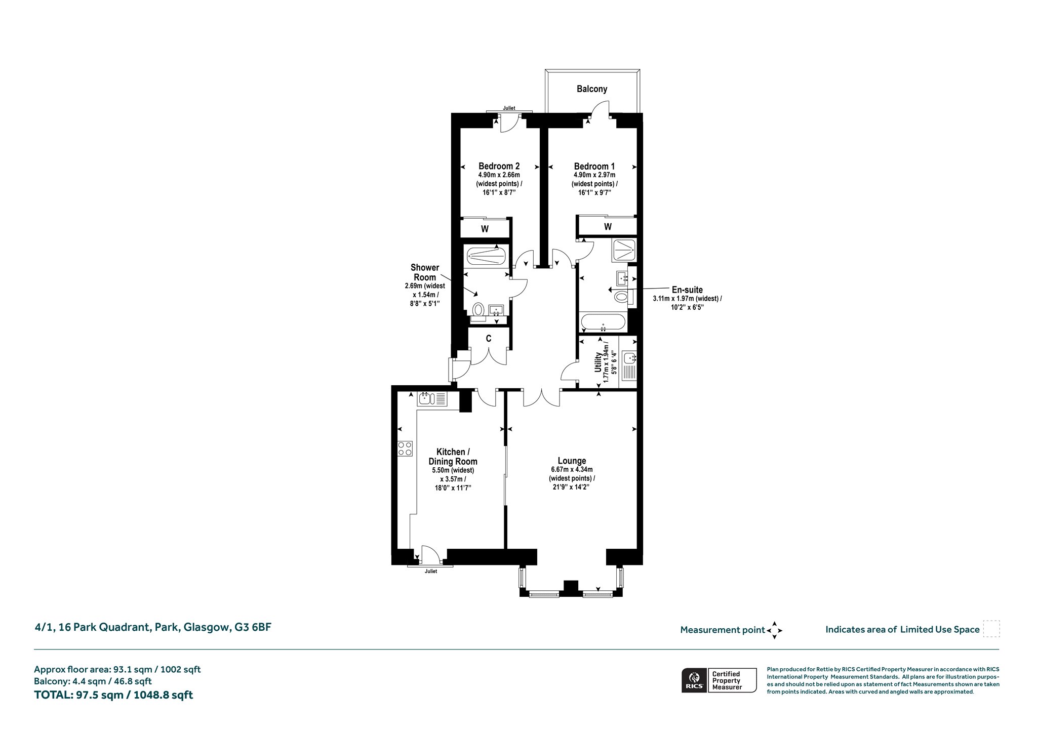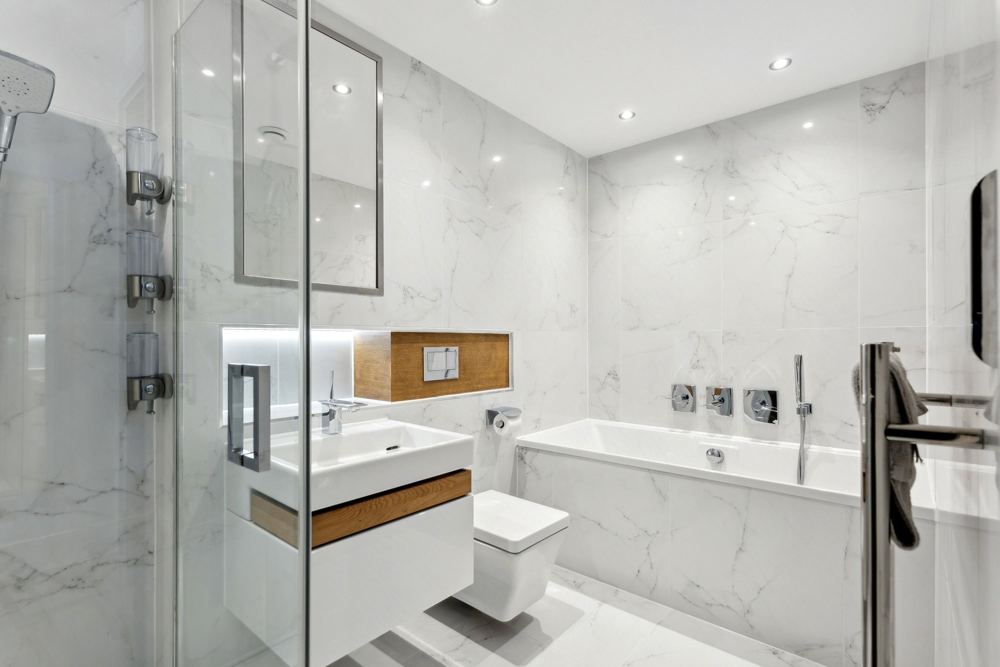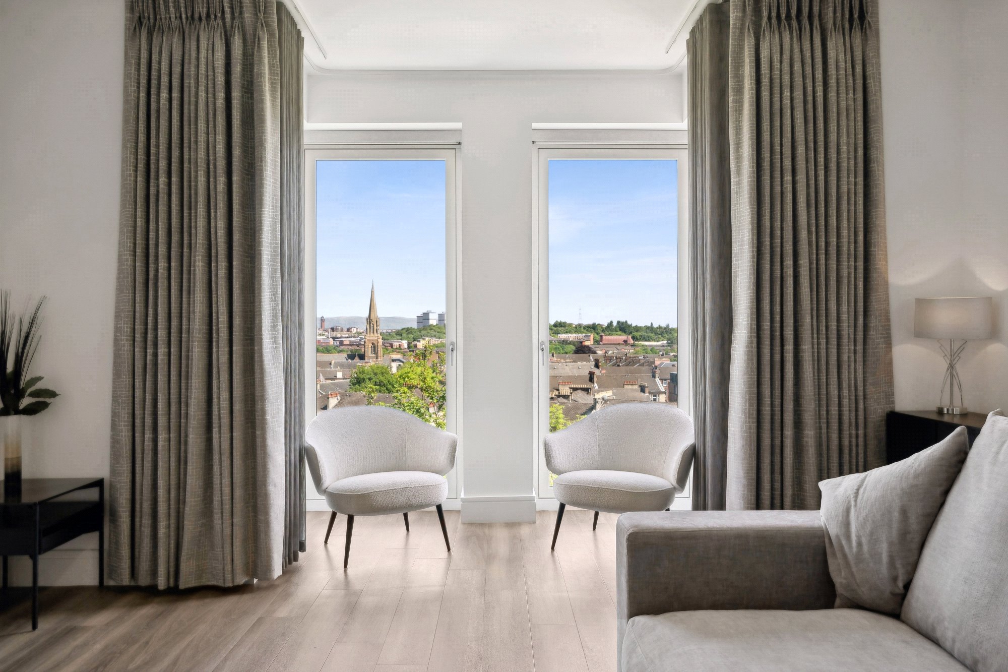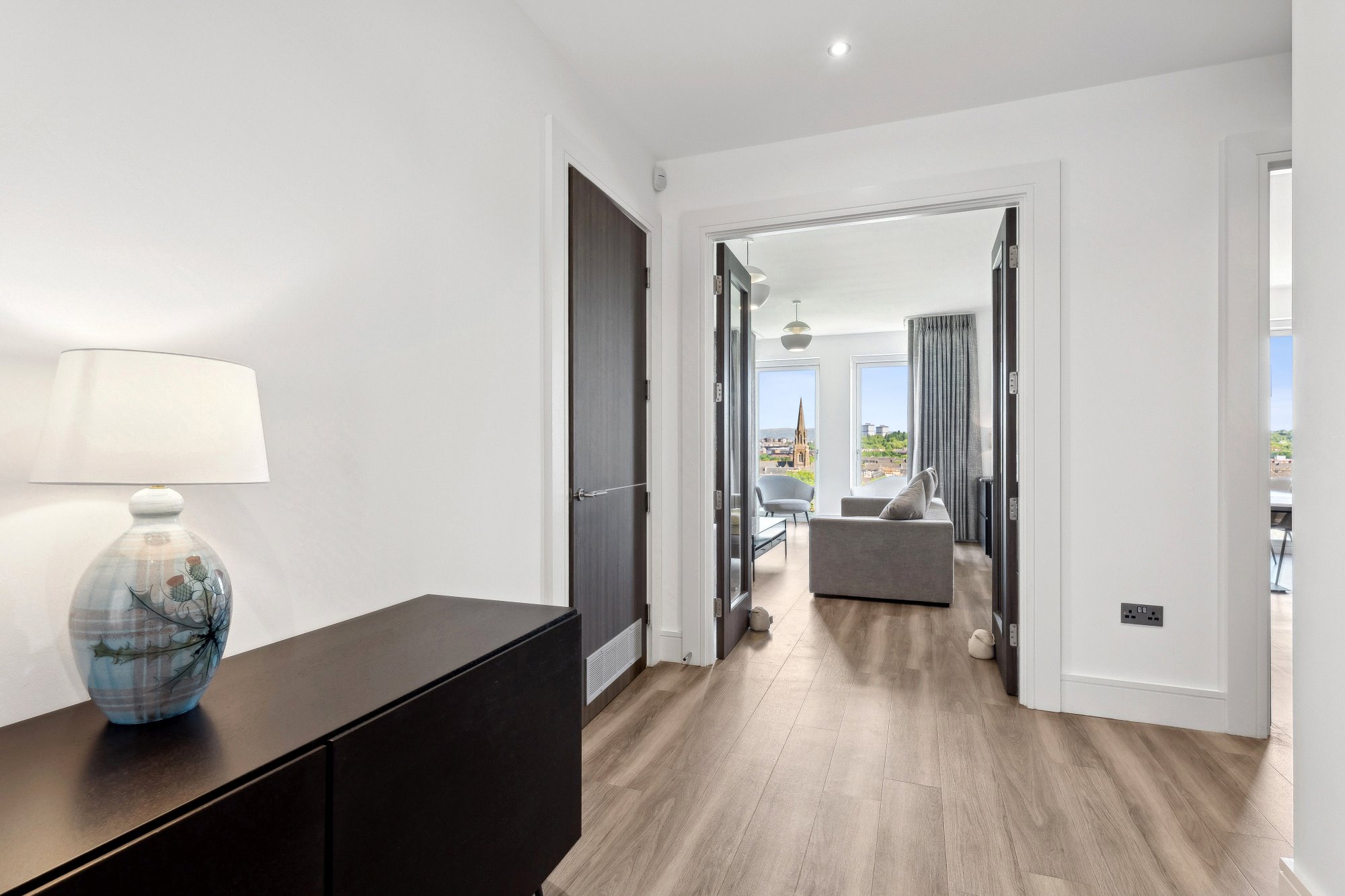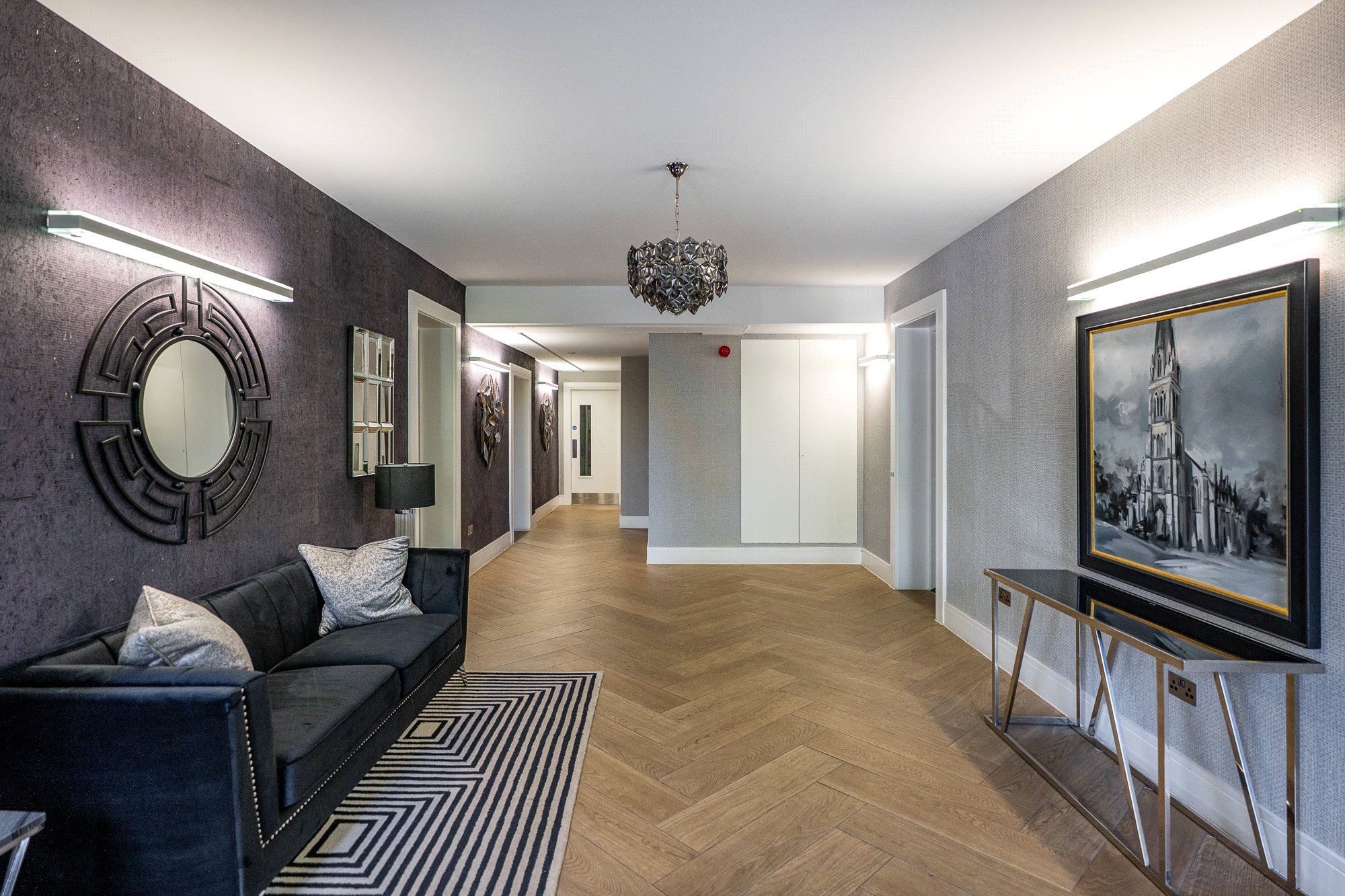 The accommodation which is immaculately presented still looks and feels brand new property includes a secure entry system to a boutique hotel style foyer with lift and stair access to each level. The apartment is entered via a broad and spacious reception hall with invaluable utility/cloak room and additional storage cupboard off. There is a magnificent front facing lounge with a four-section box bay window and fabulous sliding pocket doors leading into a beautiful dining kitchen with units by Leicht, a full range of Gaggenau appliances and high-quality white arabesque quartz worktops. There are two bright and spacious double bedrooms, bedroom one benefits from a contemporary four-piece en suite bathroom and there is a particularly stylish three-piece shower room off the reception hall. We would also highlight the ample fitted wardrobes off both bedrooms together with a private balcony off bedroom one. Both the en suite bathroom and shower room boast Kohler suites with Carrera Marble wall and floor tiling in the shower room while the bathroom is completed with upgraded Porcelanosa tiling. Additional features include underfloor heating throughout, Amtico flooring throughout a hardwired security system, hardwired electric blinds, warming drawer in the kitchen, Quooker hot water tap, electric towel rails, anti-fog mirrored integrated cabinets, an allocated parking space within the secure residents’ car park complete with dedicated electric charging port and a beautifully maintained shared garden/courtyard to the rear of the building.