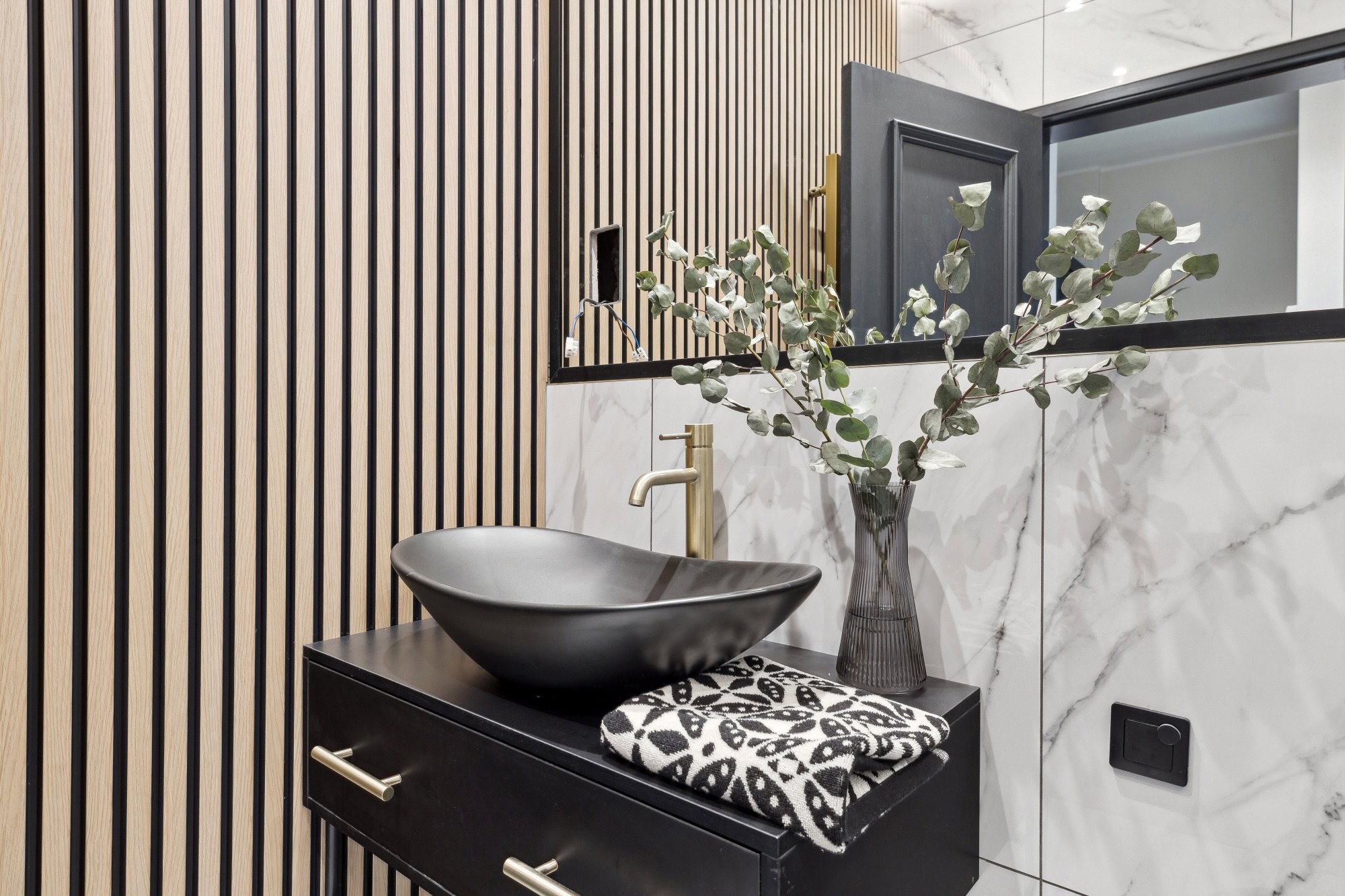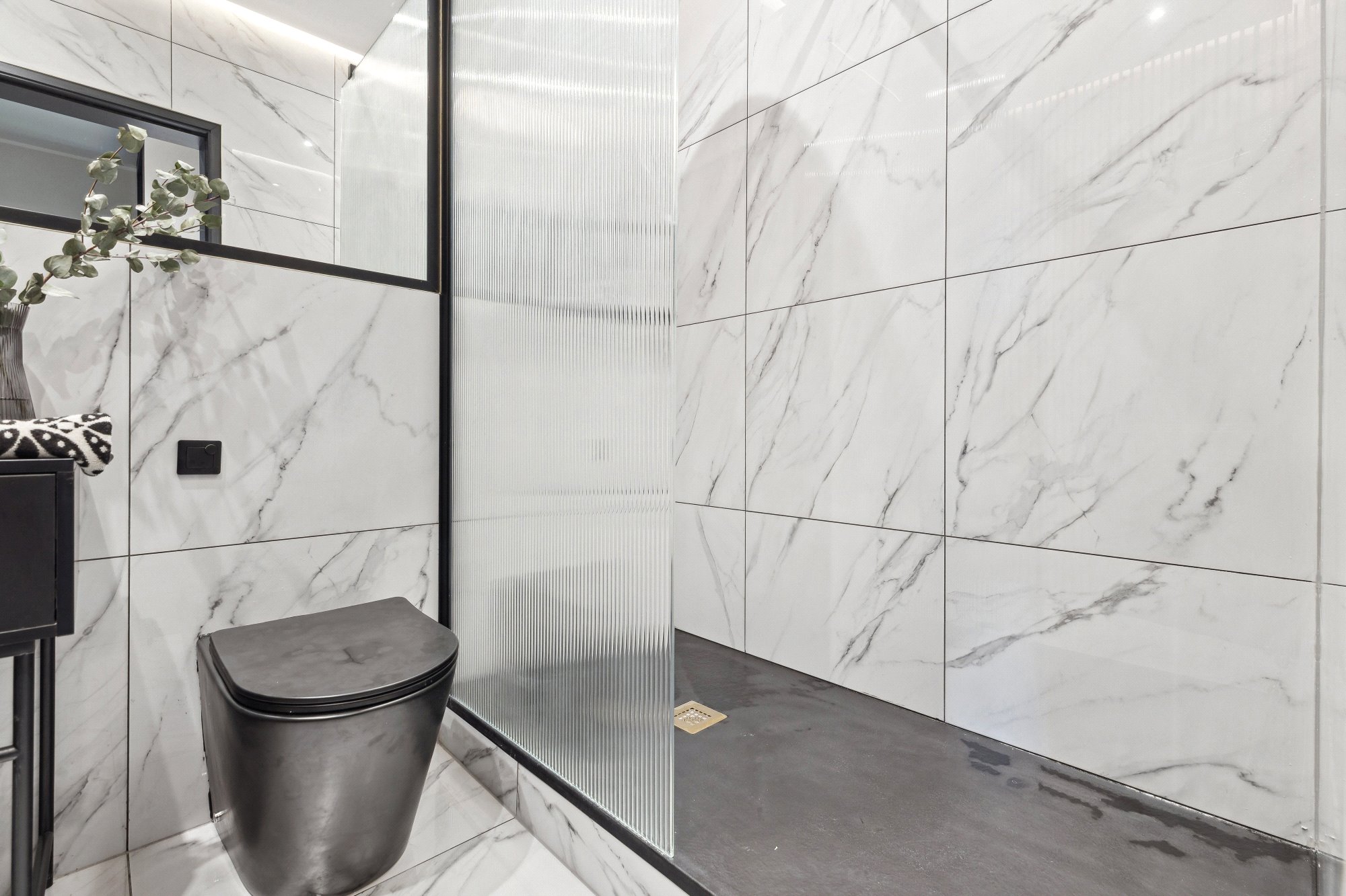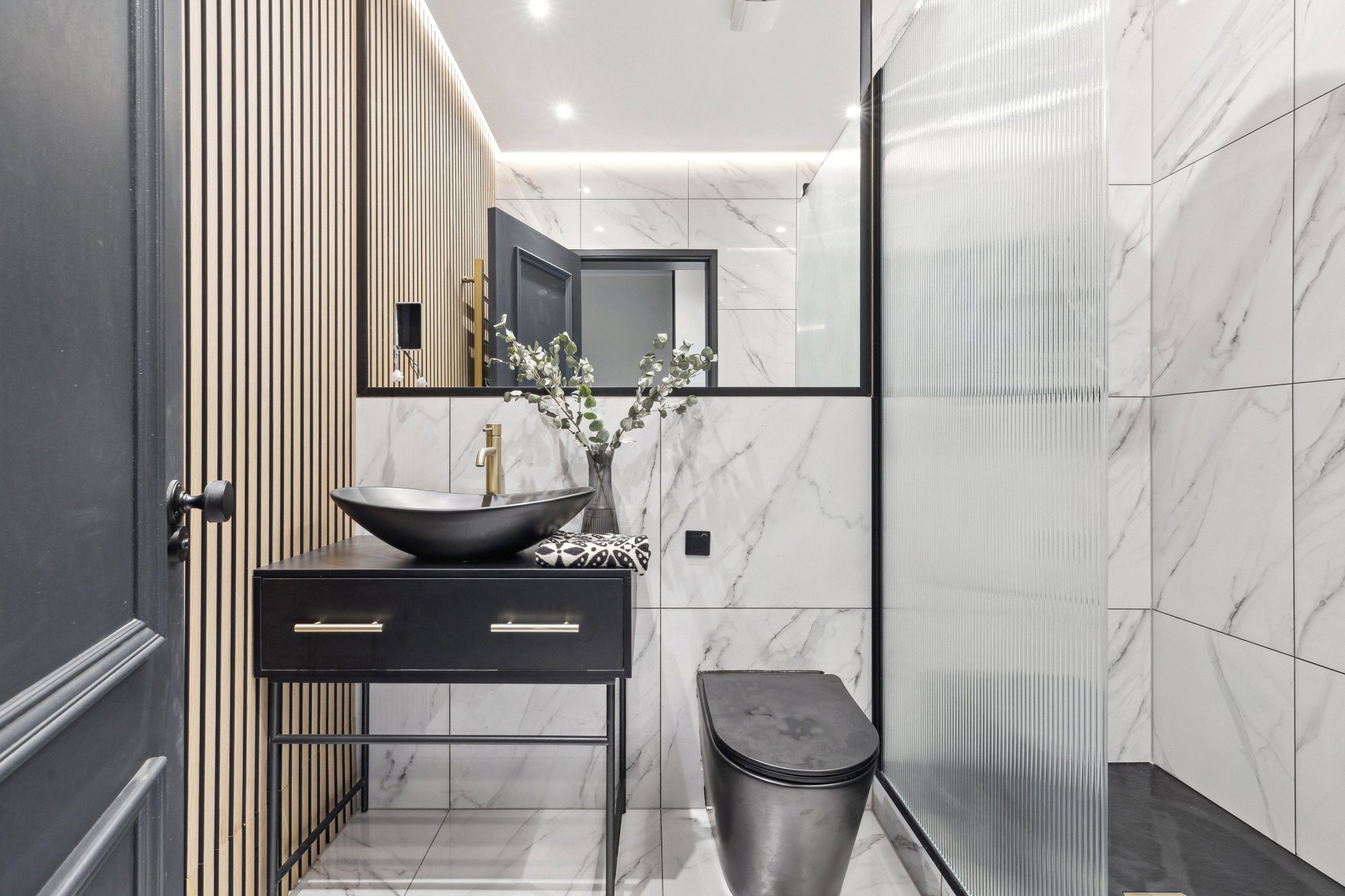 - Stunning contemporary three-piece shower room comprising three-piece suite