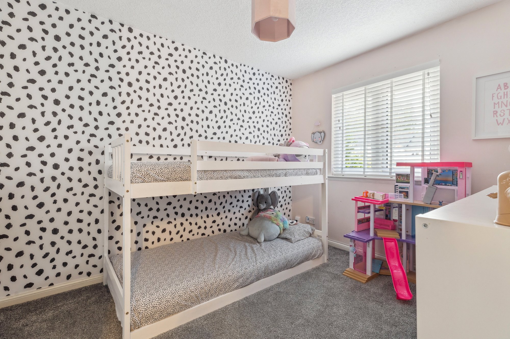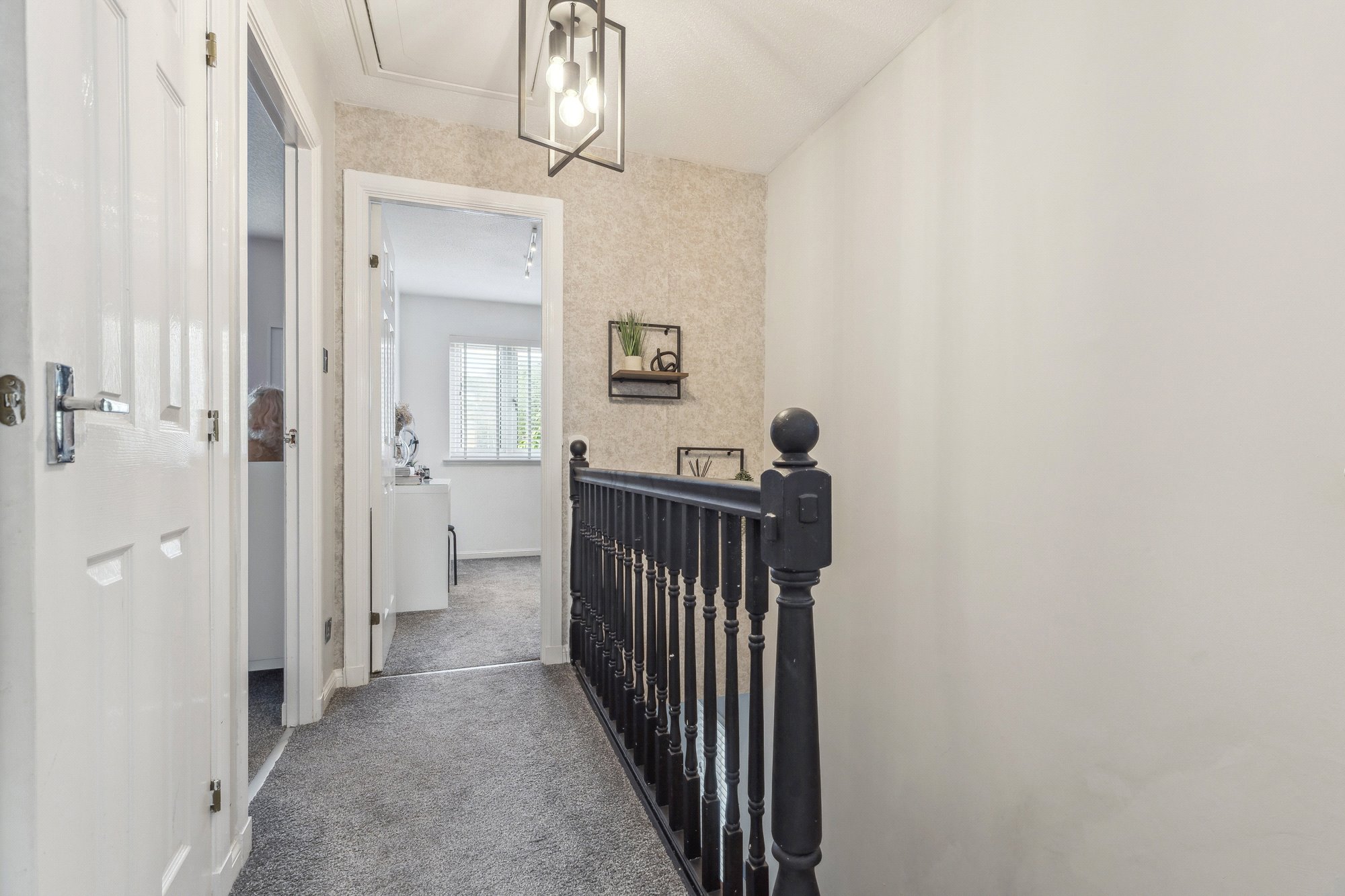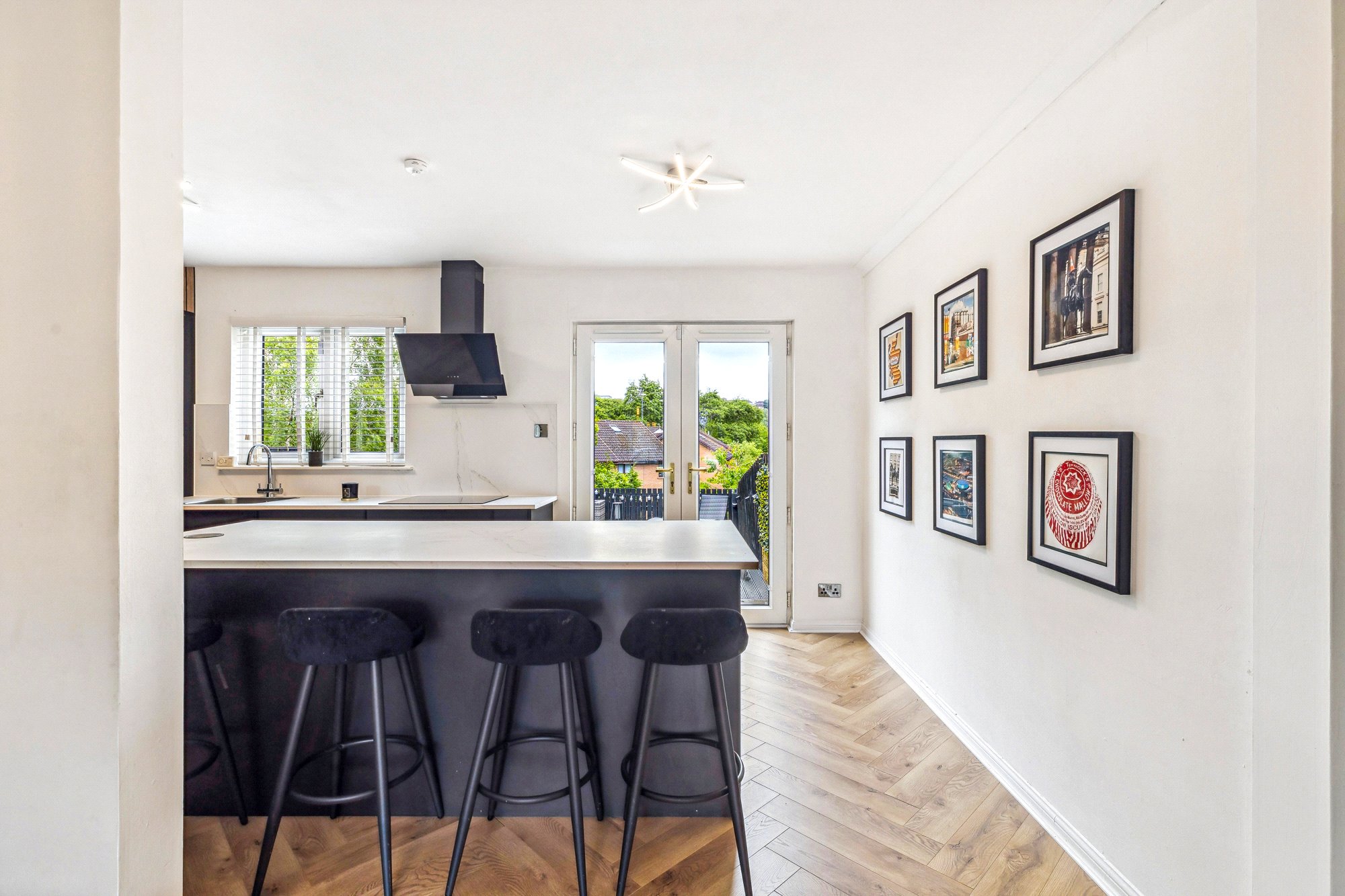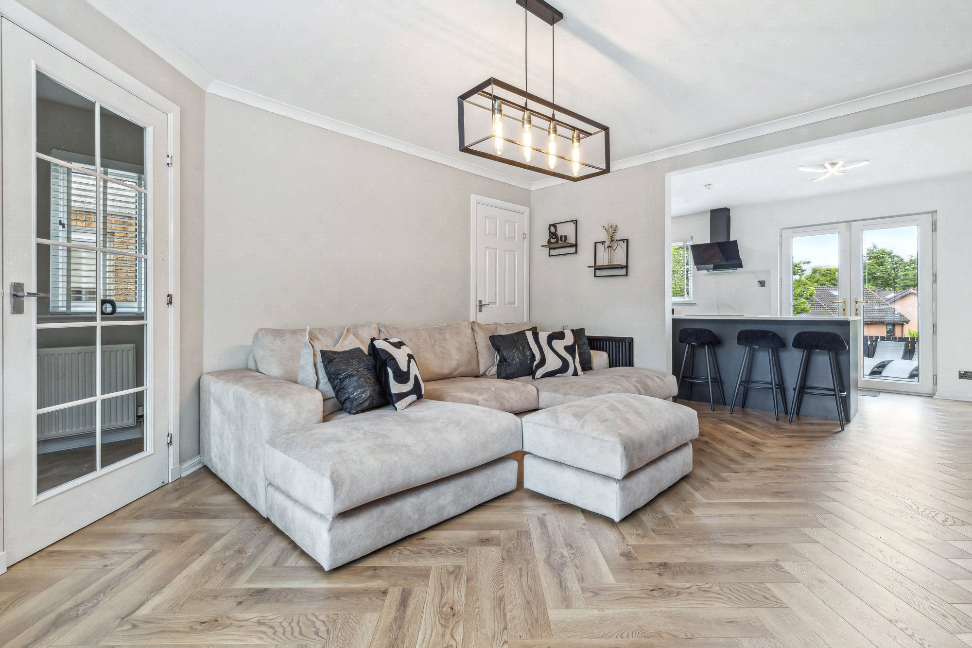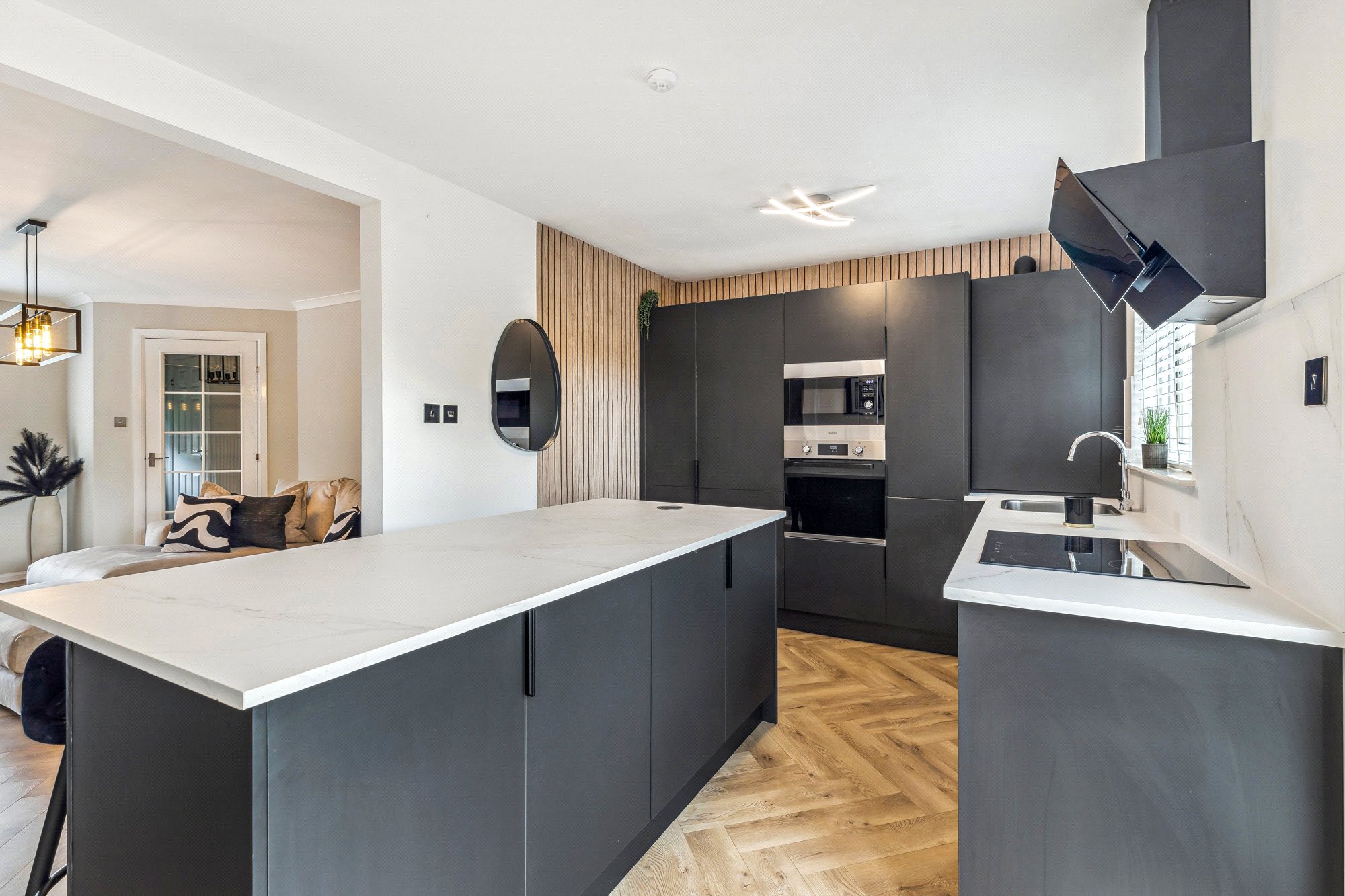 This stylish house provides comfortable living over two levels, with the downstairs area opened up to create a bright, flowing space that connects the lounge, dining area and contemporary kitchen. Beautiful parquet flooring runs throughout the ground floor, adding warmth and character, while pendant lighting and acoustic wood wall panels in the living area bring a modern yet inviting touch. These design details are thoughtfully echoed in the kitchen, creating a sense of cohesion throughout. The kitchen is complete with sleek cabinetry, integrated appliances, central island with dining space and provides direct access to the rear garden via French doors. All bedrooms are tastefully decorated and enjoy excellent natural light. The shower room exudes a timeless style, finished to a high standard with quality tiling, a spacious walk-in shower, and a light-up anti-fog mirror.