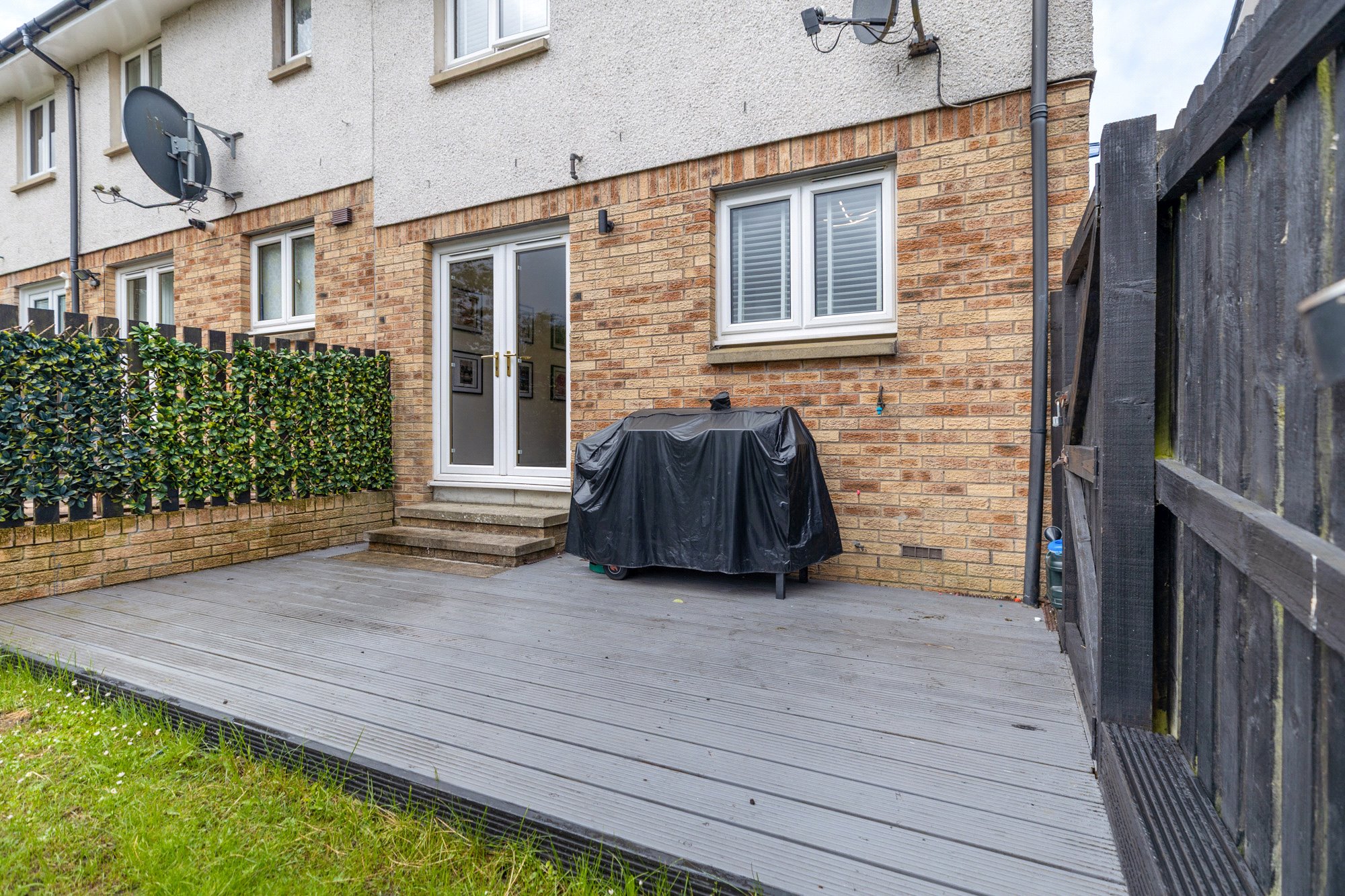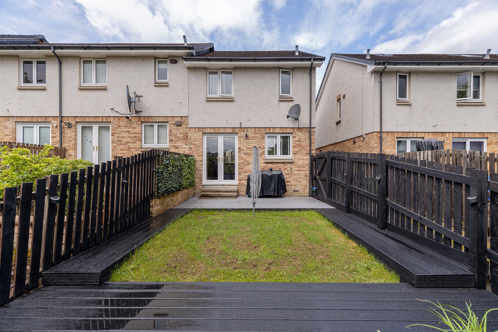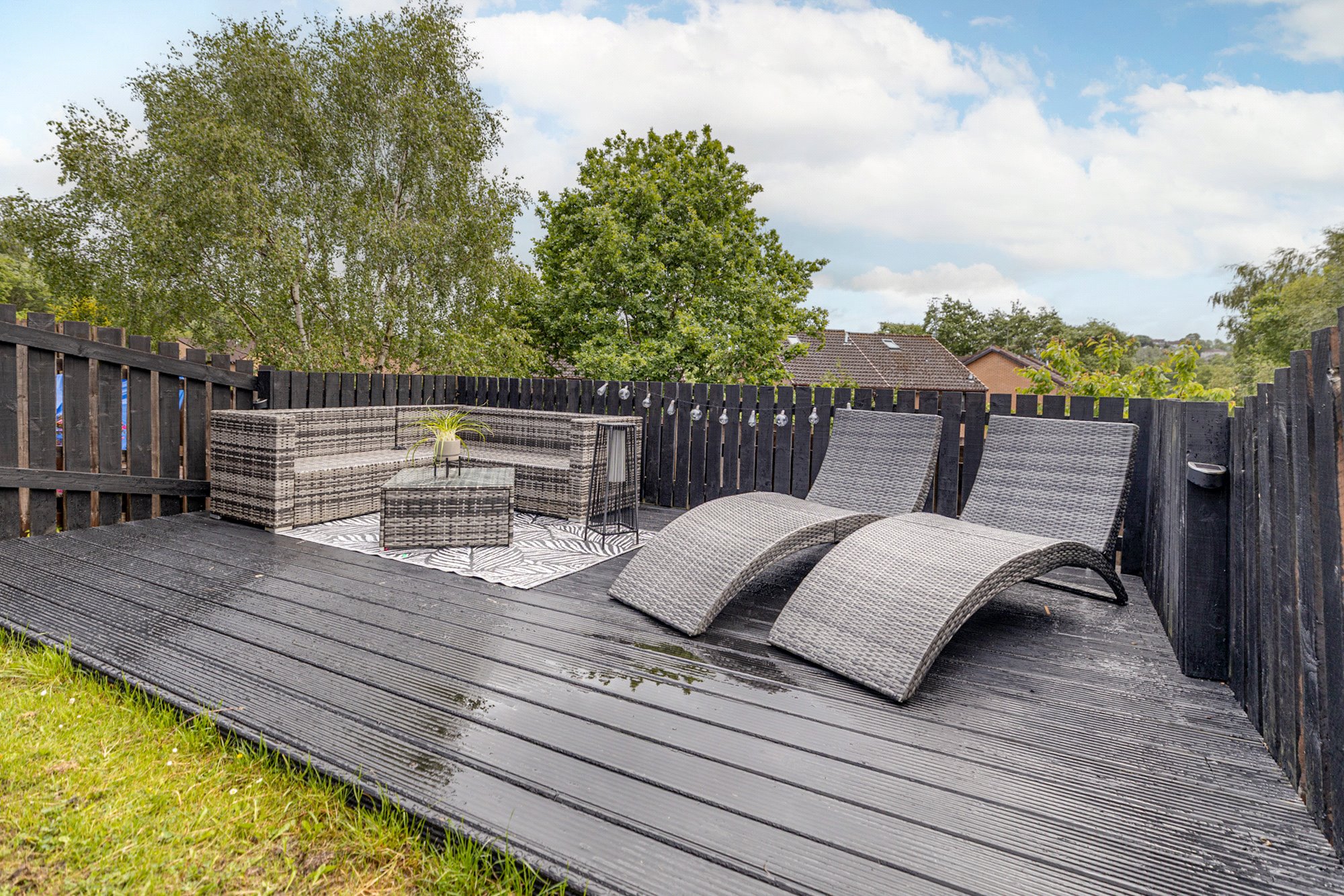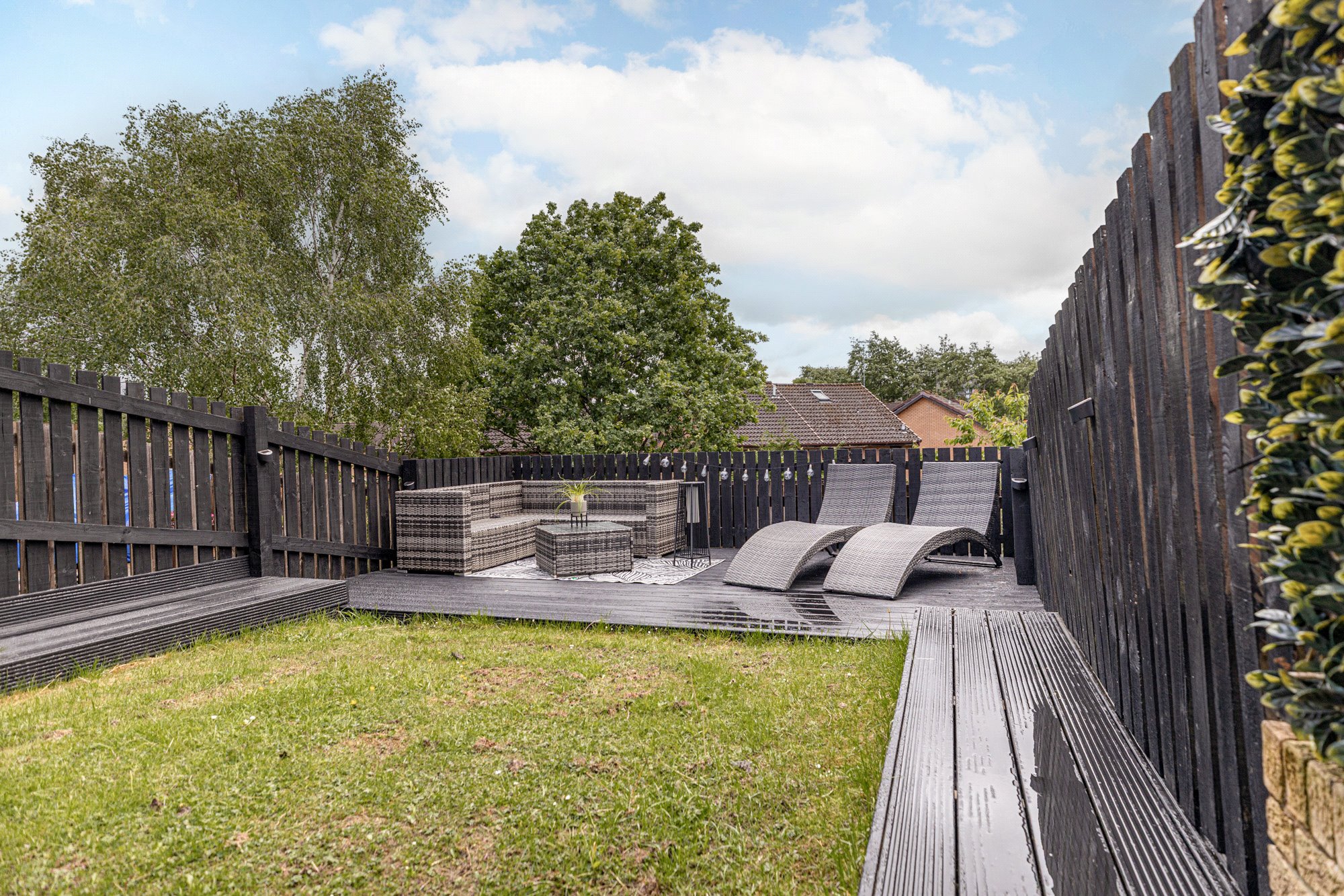 - Back garden enclosed by fencing with grass lawn and decking.
