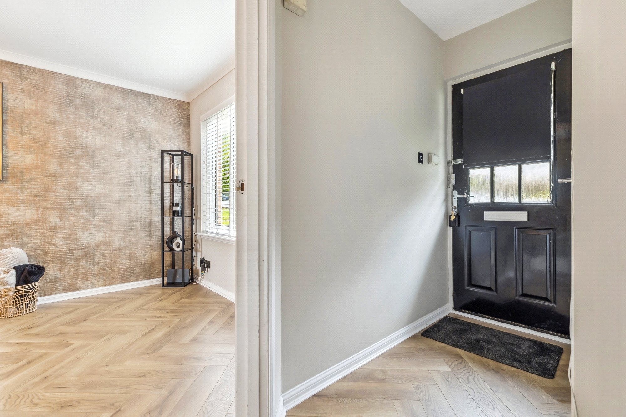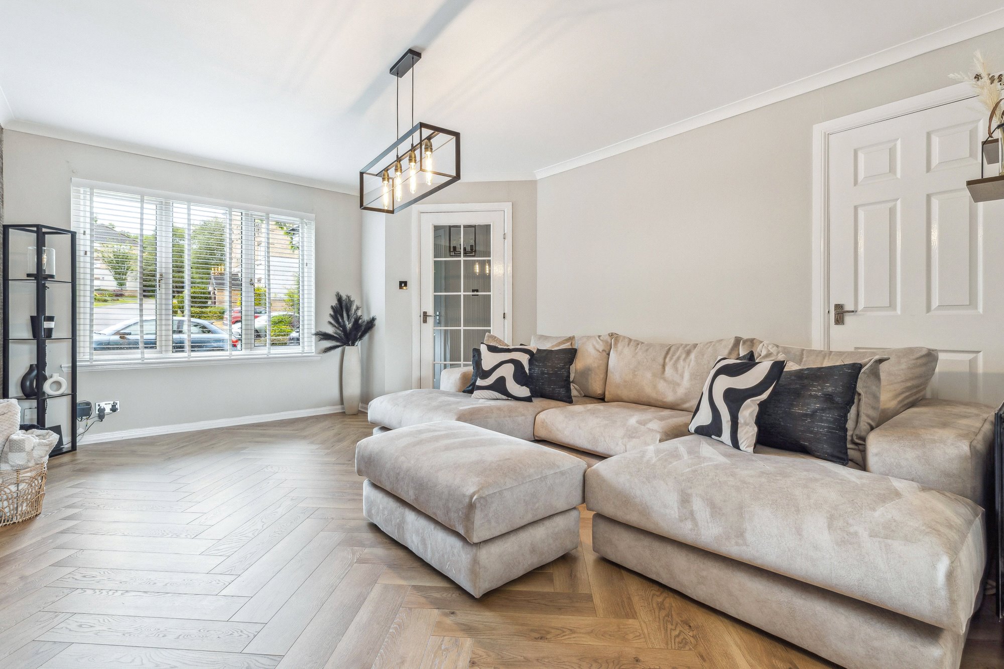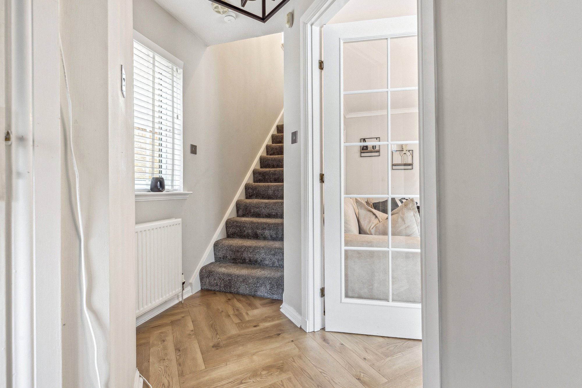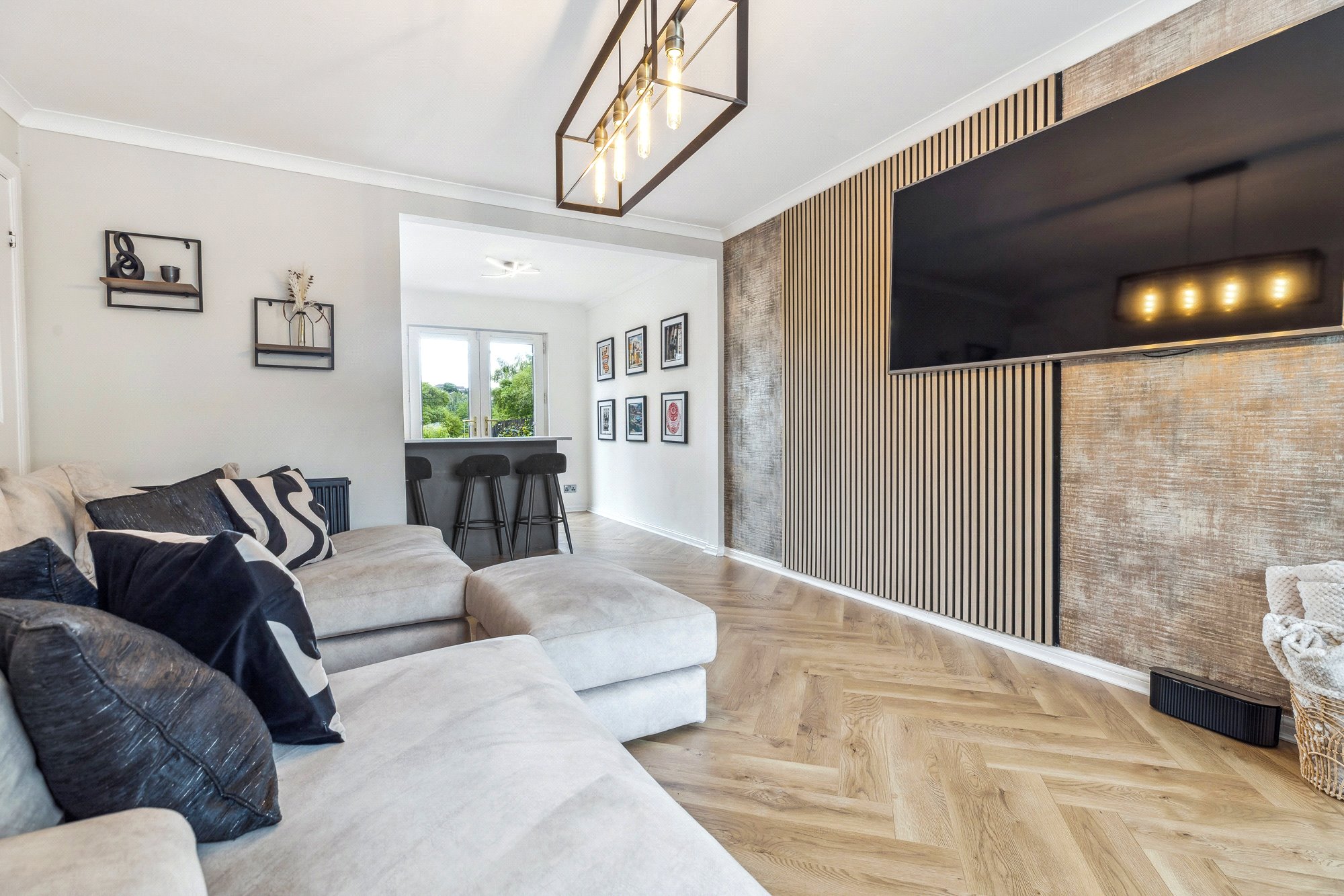 - Spacious living room with window to the front, herringbone pattern flooring, acoustic wooden wall panelling and useful understairs cupboard.