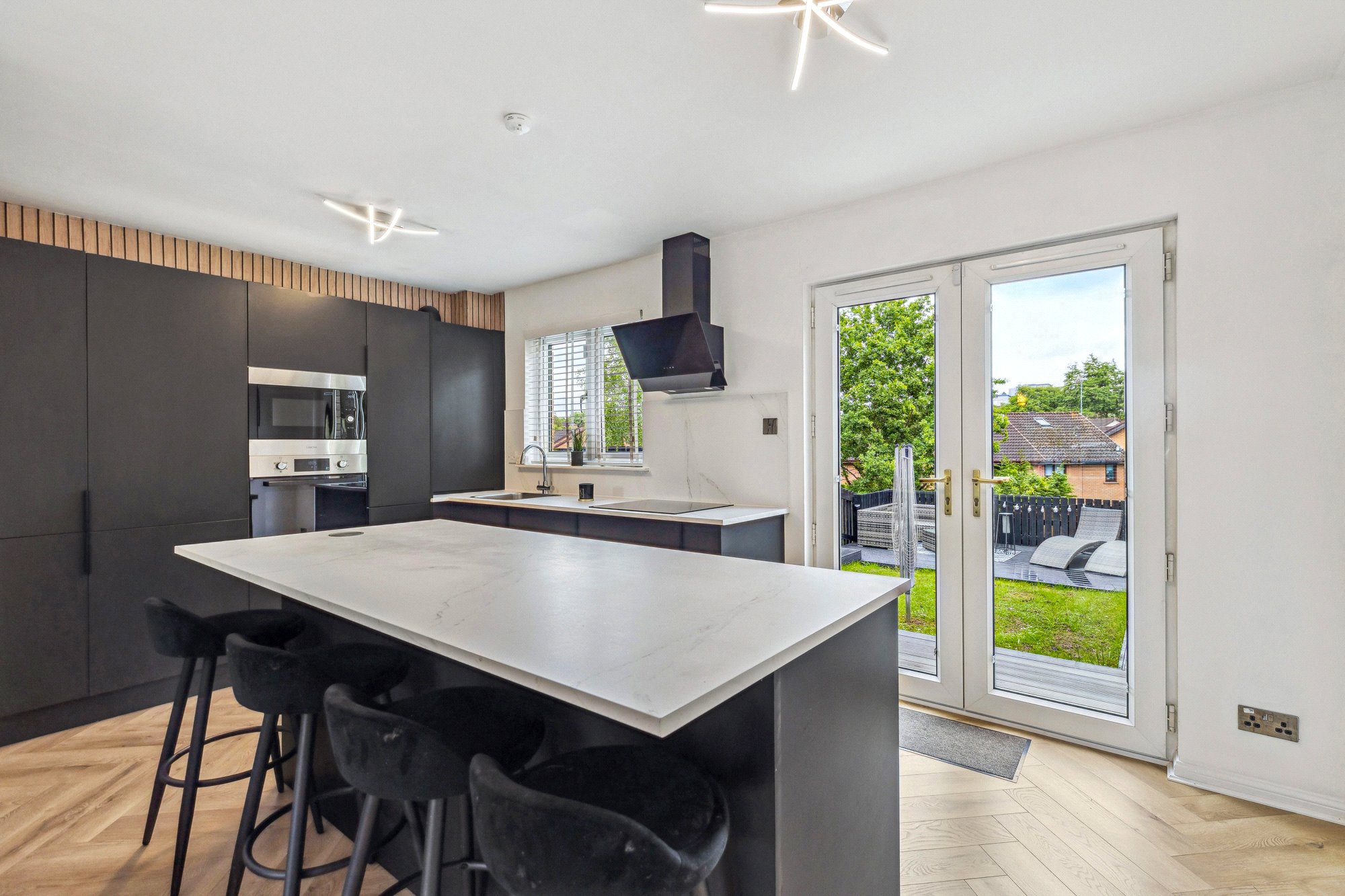 - Gorgeous modern kitchen with integrated appliances, dining island, window to the rear and French doors opening to the garden.