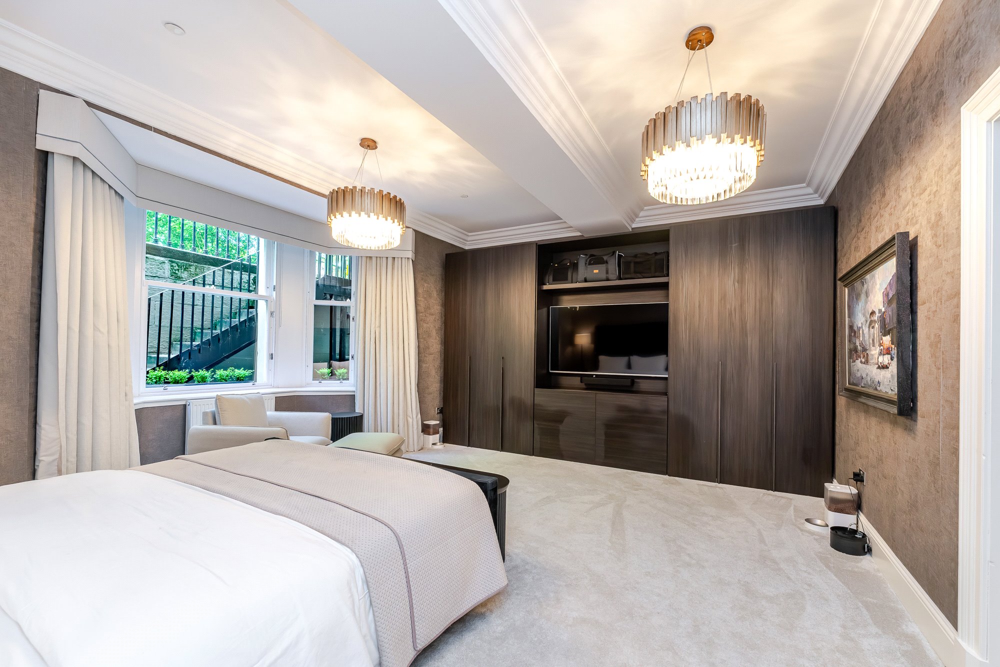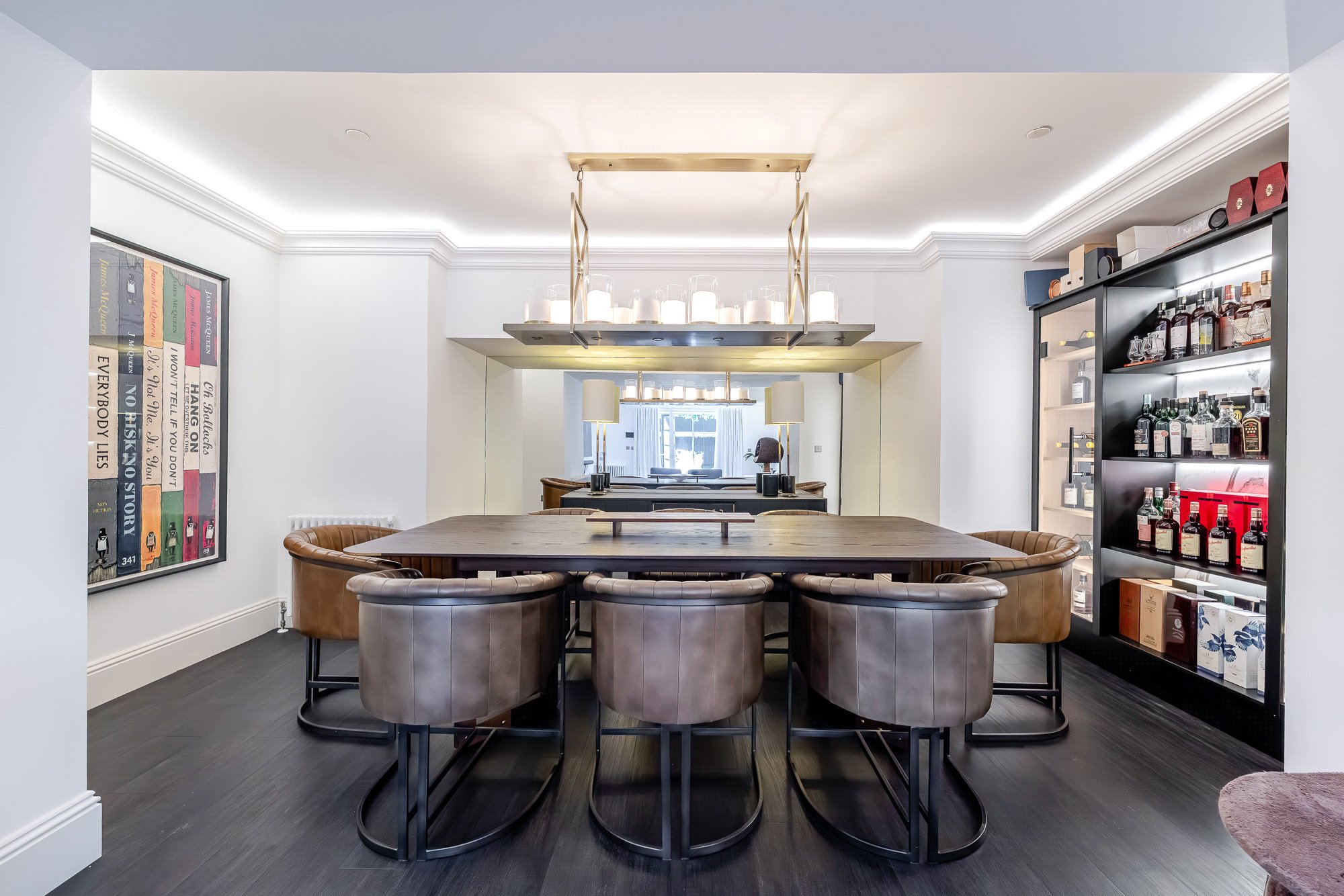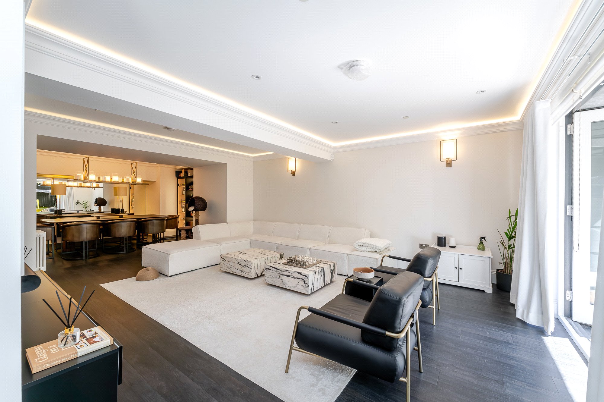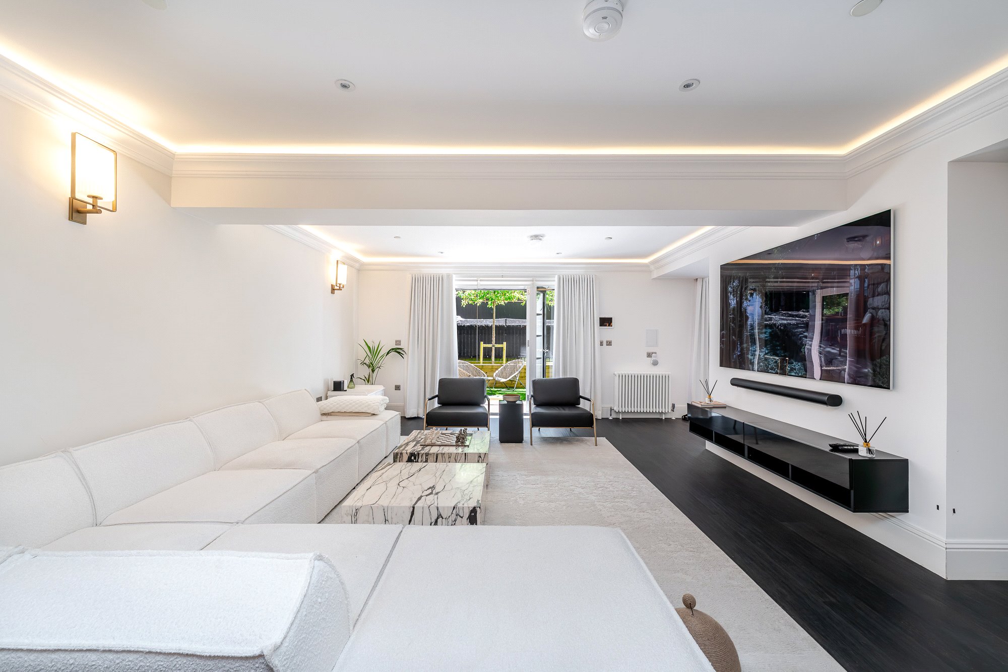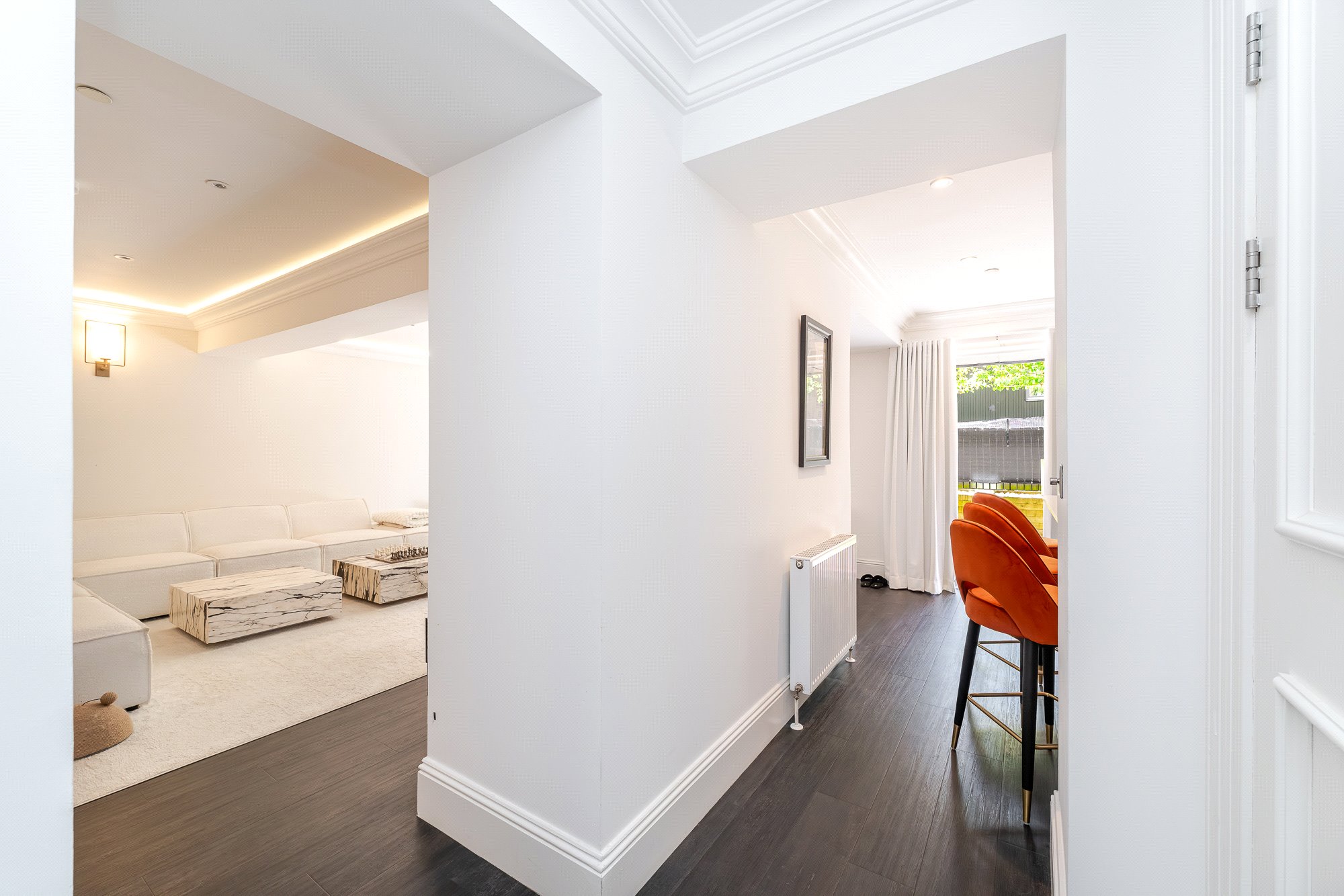 Internally, the property is presented in beautiful condition with an outstanding level of finish throughout, following input from leading London-based interior designers. Access to the extremely private main door entrance is via stone steps that lead to the lower ground level where you are initially greeted by a lovely front courtyard area, laid to flag stones and lit with incandescent courtesy lighting in the evening. This additional, sheltered outdoor space could be utilised for setting out seating and potted plants for year-round use, regardless of weather conditions. Once inside, an entrance vestibule provides access to the fourth bedroom (currently used as a beautiful home office) and gives way to a long reception hallway that provides access to the three king-sized bedrooms with staircase leading downward into the main body of public space. The main living room is exquisite - a generously sized, South-facing and therefore bright public space with elegant, stylish décor and full-height glazed doors that open directly onto the private south-facing garden. The kitchen is equally impressive, with sleek cabinetry, high-end integrated appliances and a peninsula unit with breakfast bar – perfect for casual dining and entertaining. The kitchen too has a full-height door straight into the garden – handy for carrying out drinks and snacks into the oasis-like South-facing Garden.