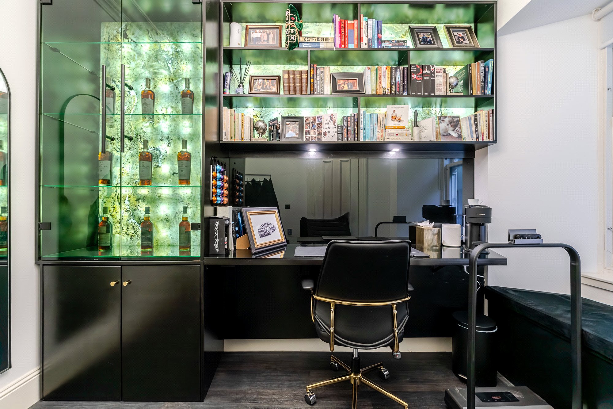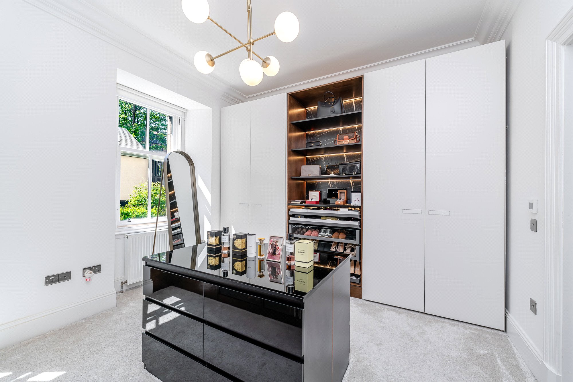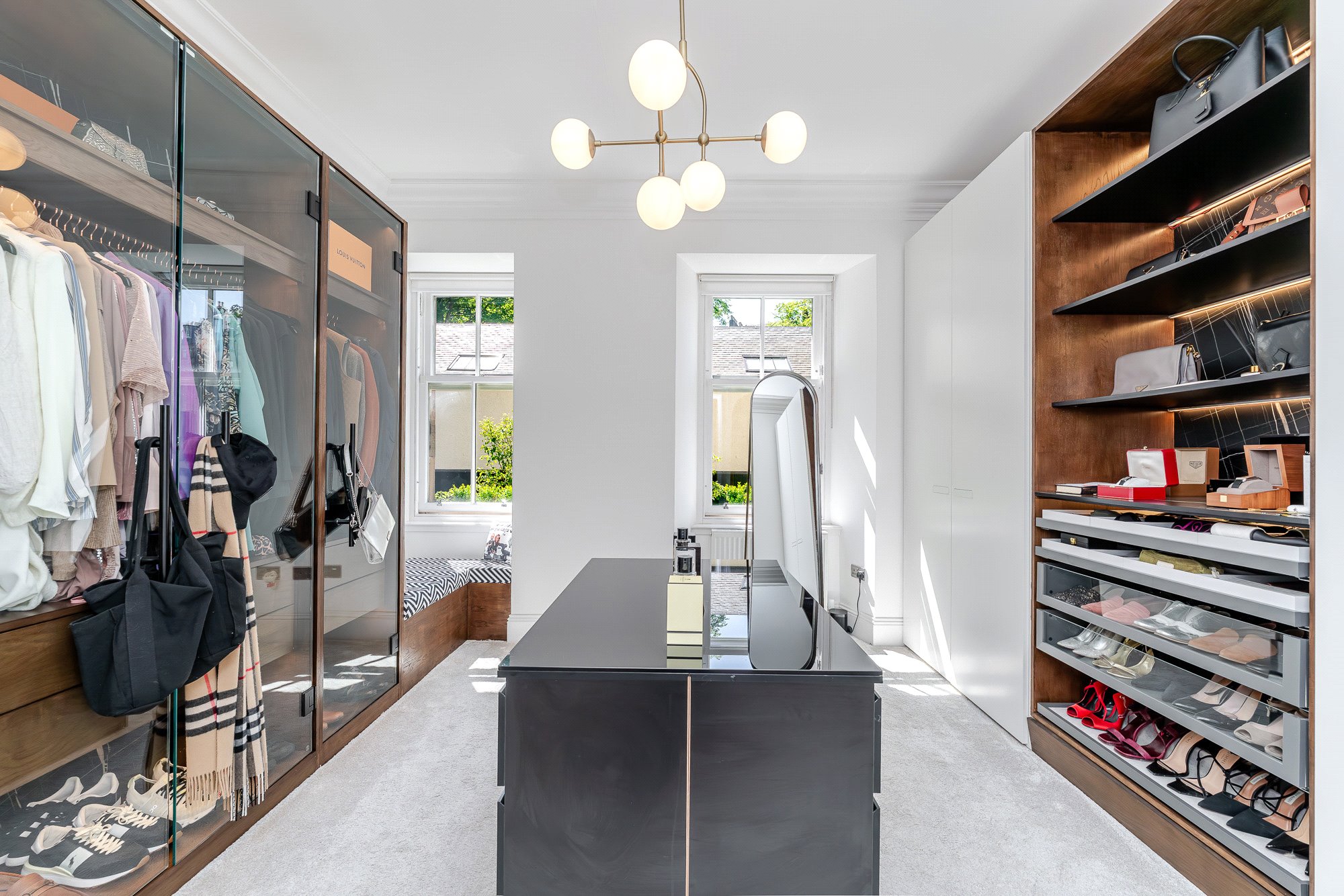 Back on the entrance level there are four bedrooms, three of which are of comfortable king-sized proportions (one currently modelled as a stunning dressing room) and benefit from en-suite facilities and, as mentioned, the fourth bedroom is of single-sized proportions and is currently used as a luxurious home office with large cupboard off. The principal suite is of superb proportions and exudes luxury – with extensive fitted storage, a beautifully tiled en-suite shower room, and a bespoke Scandinavian-style sauna (2–3 person) that creates a true spa-like experience at home.