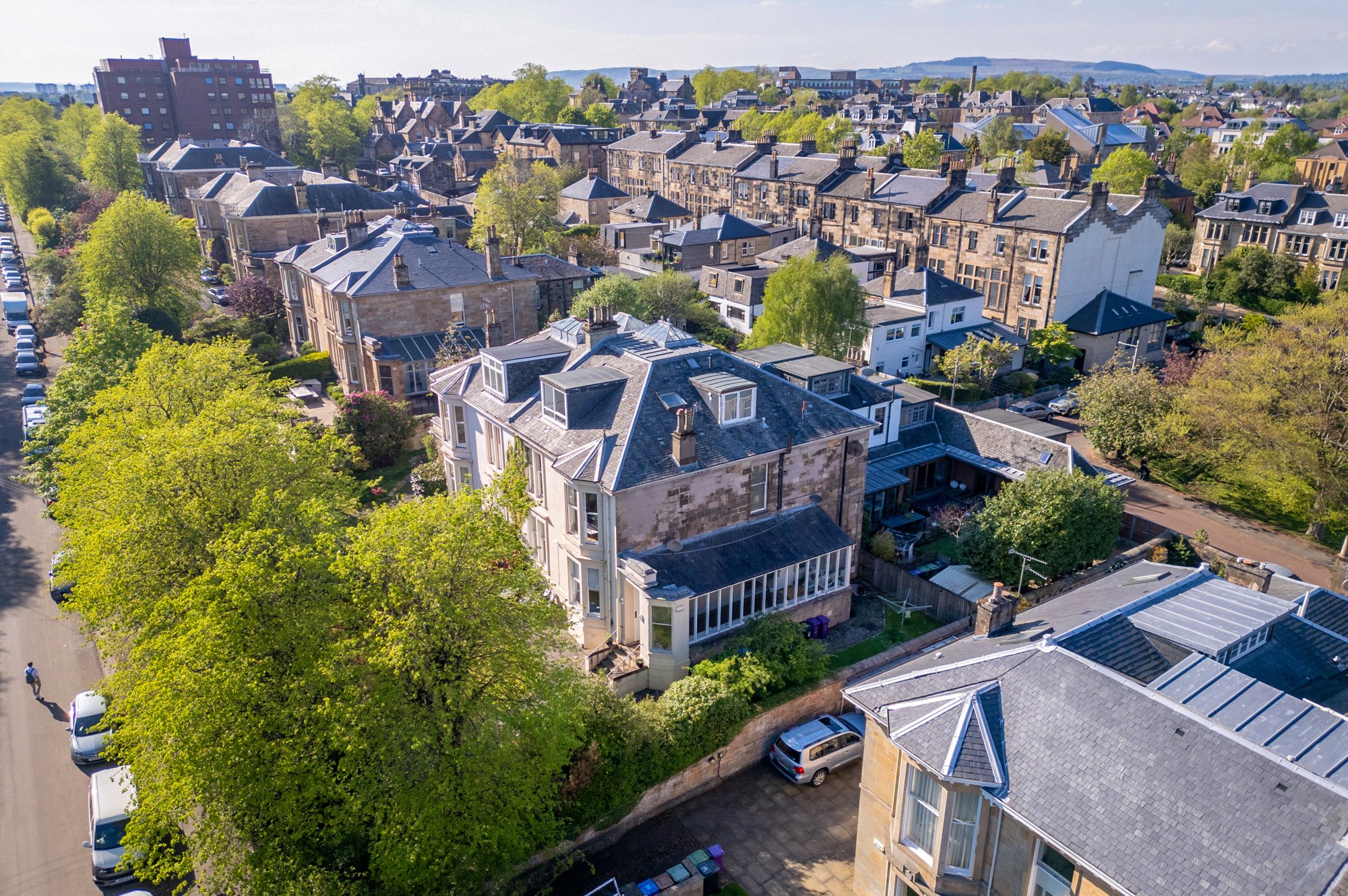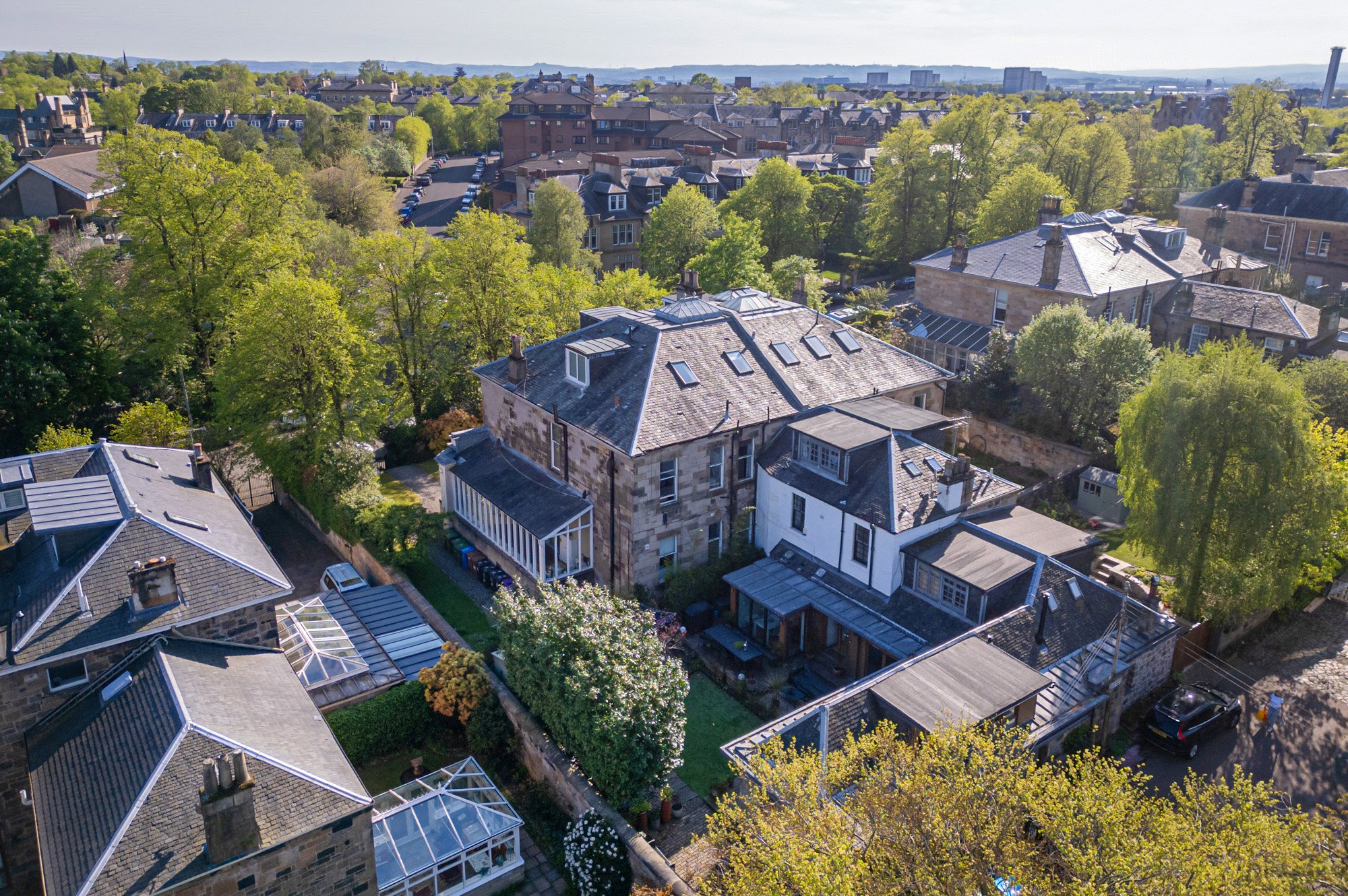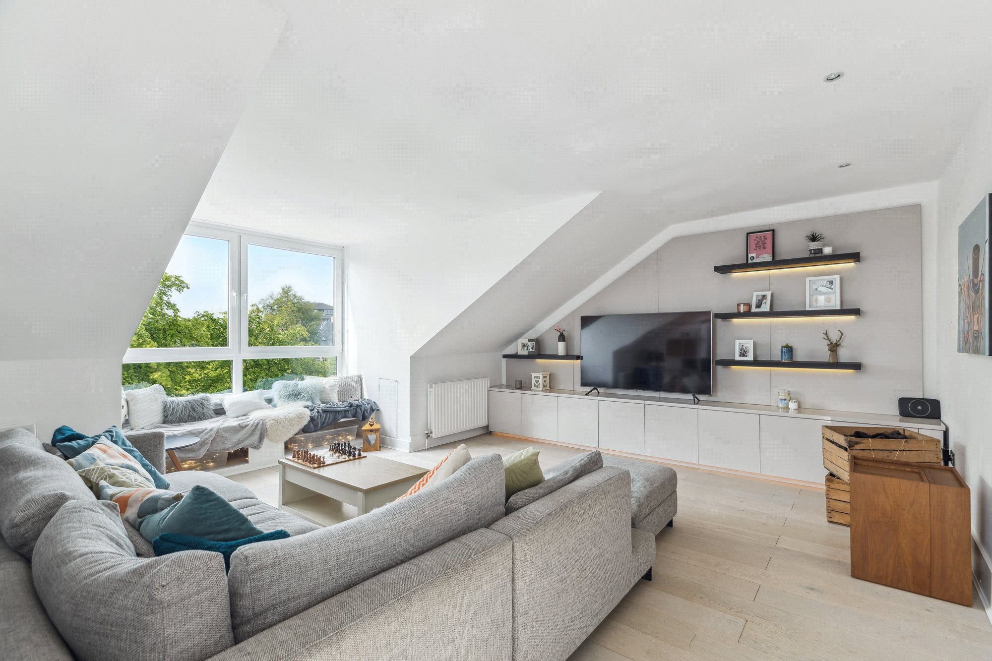 Tucked away in a peaceful, address in Kelvinside - the property for sale is a stunningly bright and beautifully appointed two-bedroom attic level conversion, held within a particularly elegant semi-detached sandstone villa. Number 13 Cleveden Drive is set within an elevated and highly private plot surrounded by stunning, healthy trees and bushes – creating a rare sense of seclusion for such a centrally located home.