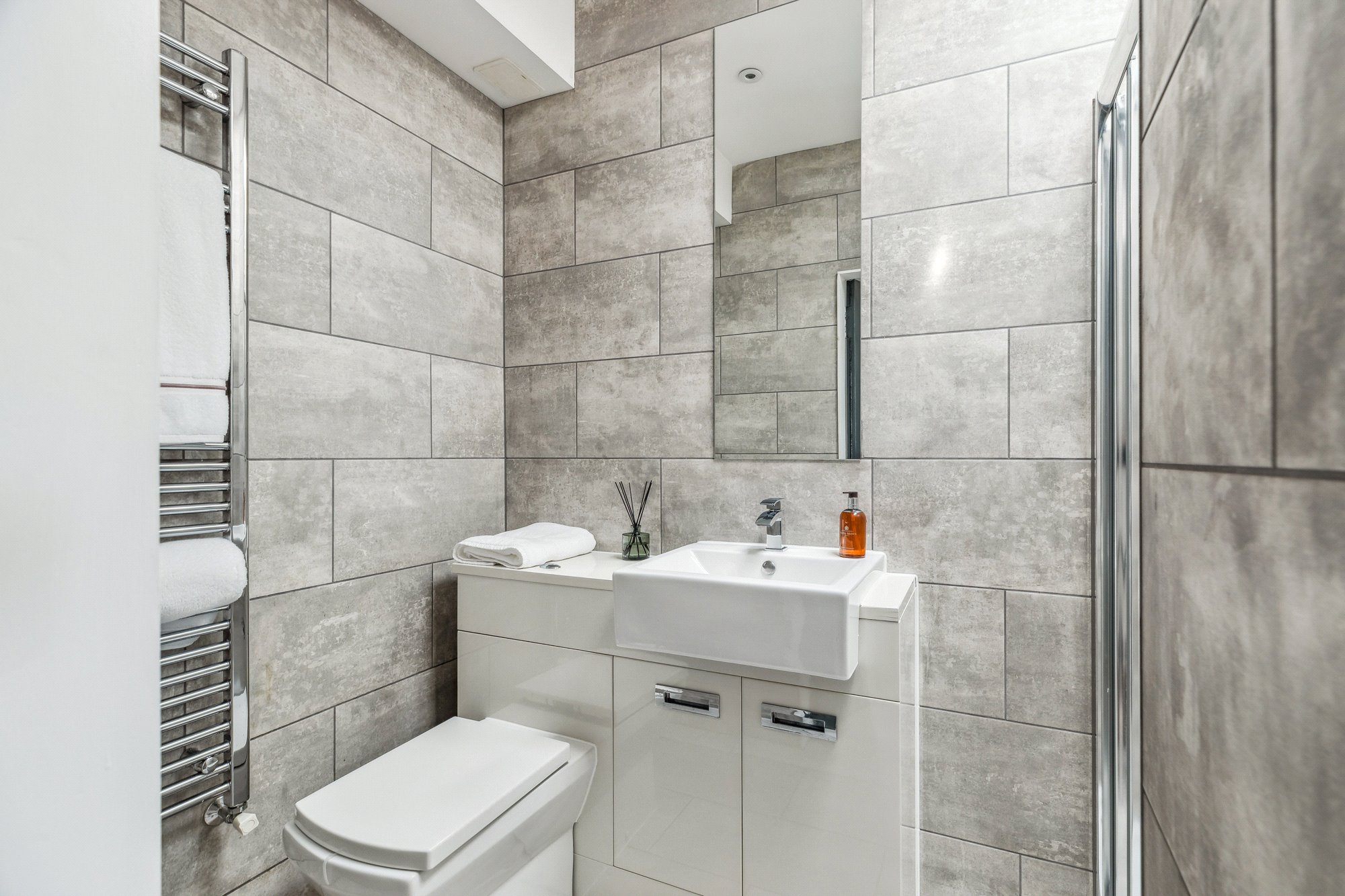 • Contemporary Bathrooms: Principal bedroom with en-suite shower room; main shower room styled in a similar fashion, both featuring attractive tiling and white suites.