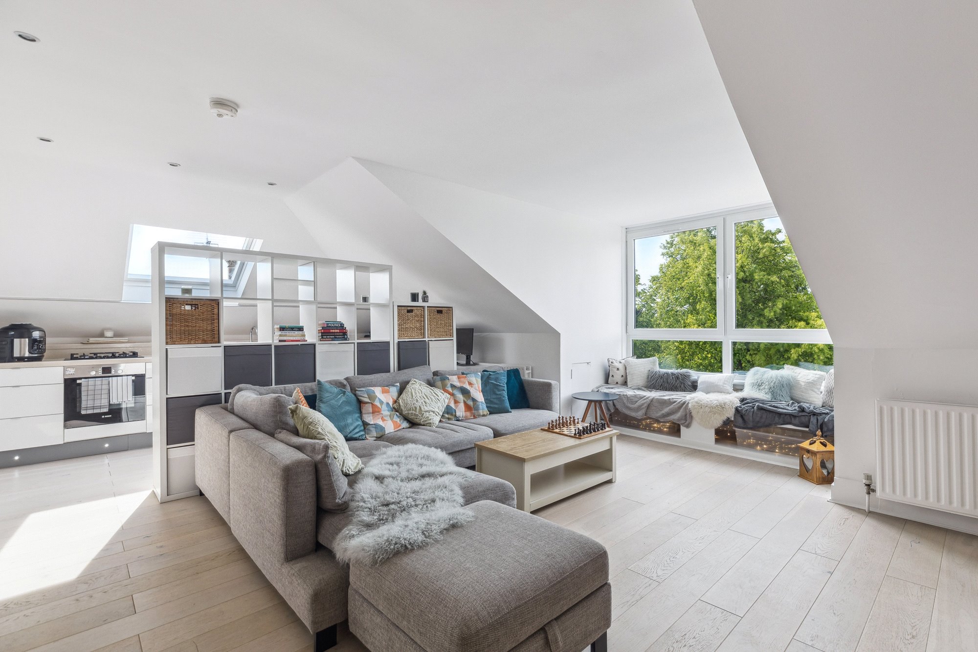 • Open-Plan Layout: South-facing living, kitchen, and dining area with wide aperture windows and a charming window seat.