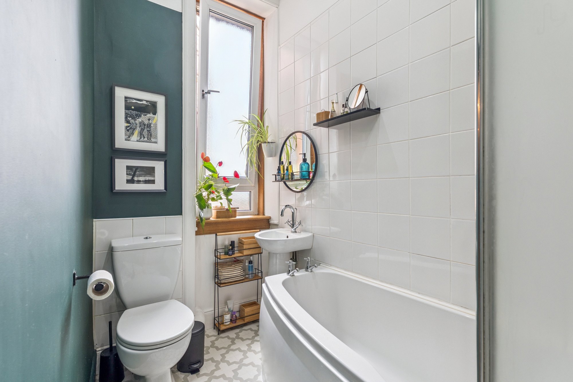 - Three-piece bathroom comprising bath, over bath shower, toilet and was hand basin. Window to the rear