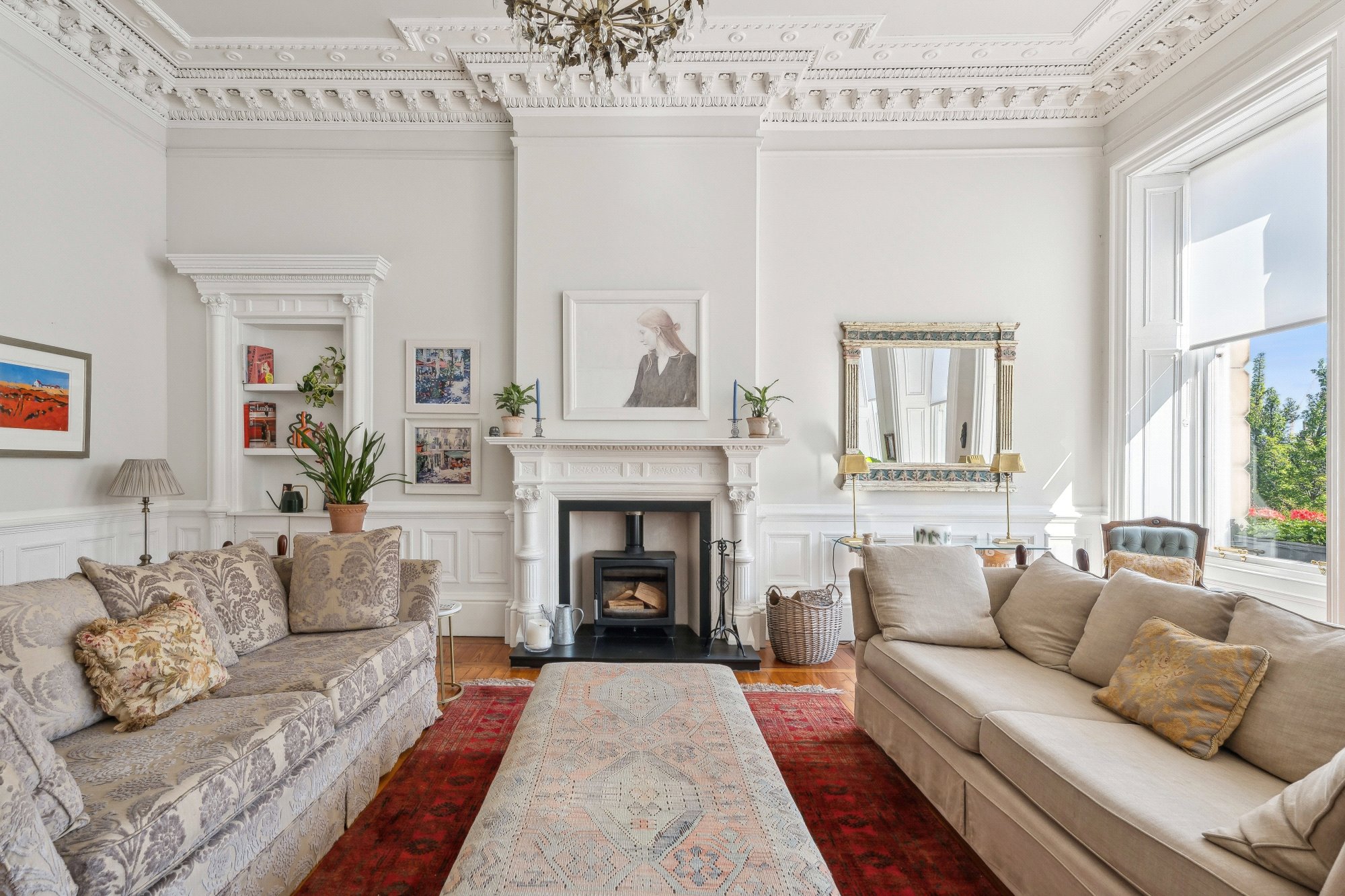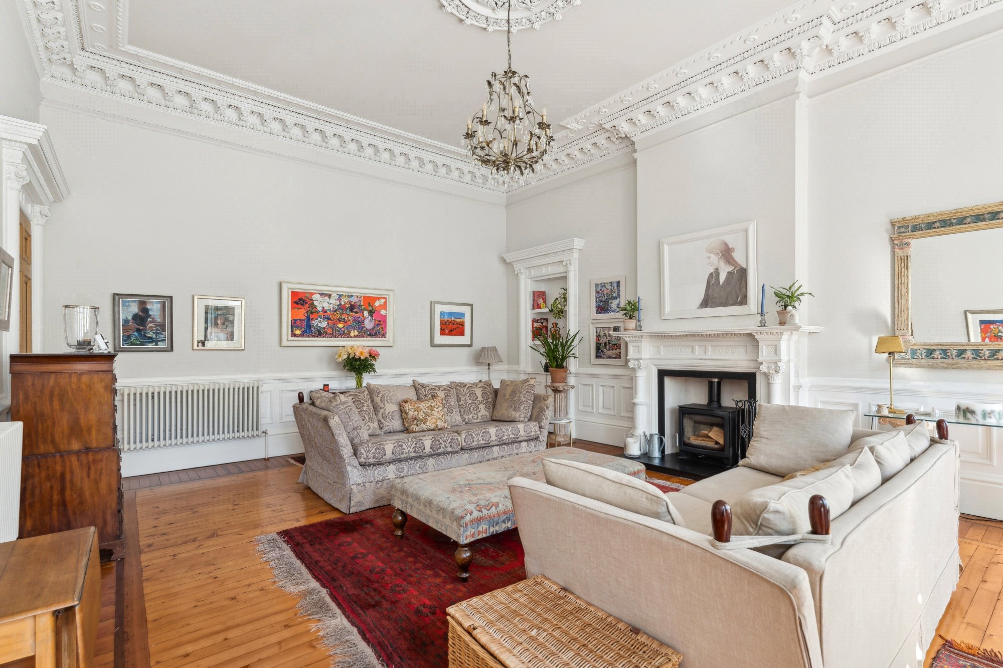 - Magnificent formal lounge with three windows to the front, wooden flooring, wood burning stove, corner press and ornate ceiling cornice