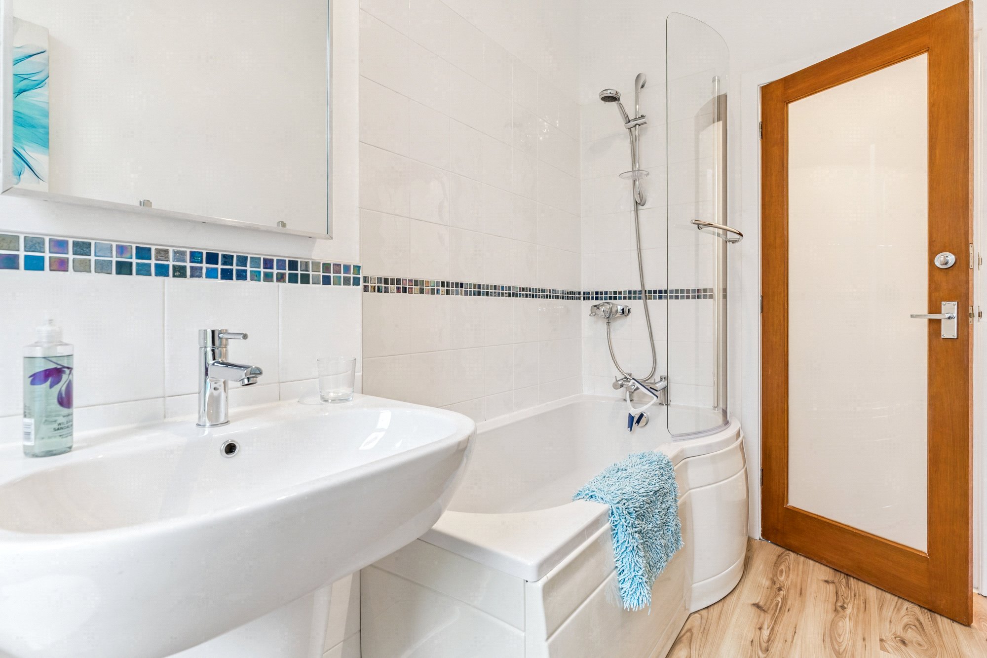 - Three-piece bathroom comprising bath, over bath shower, toilet and wash hand basin. Window to the rear