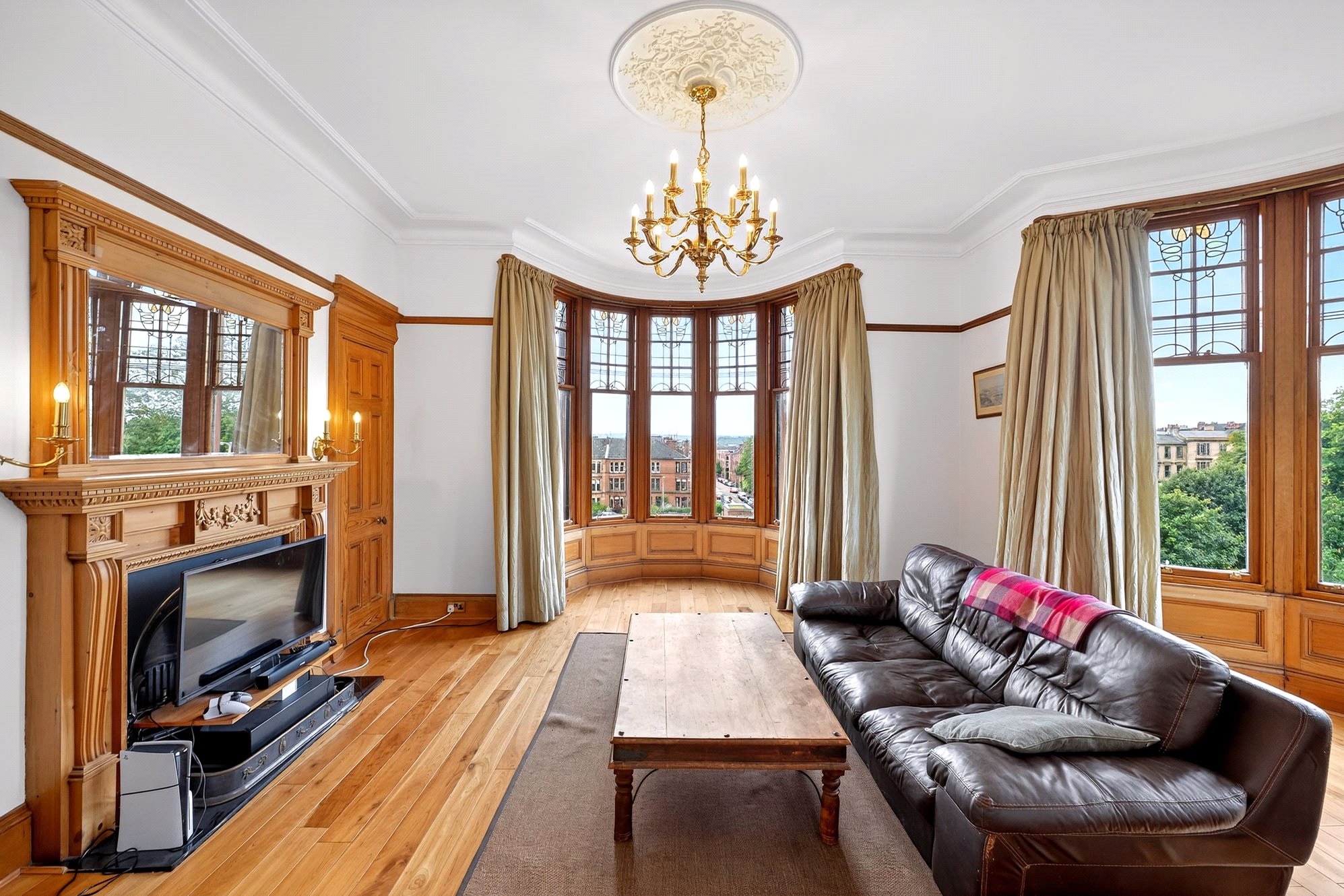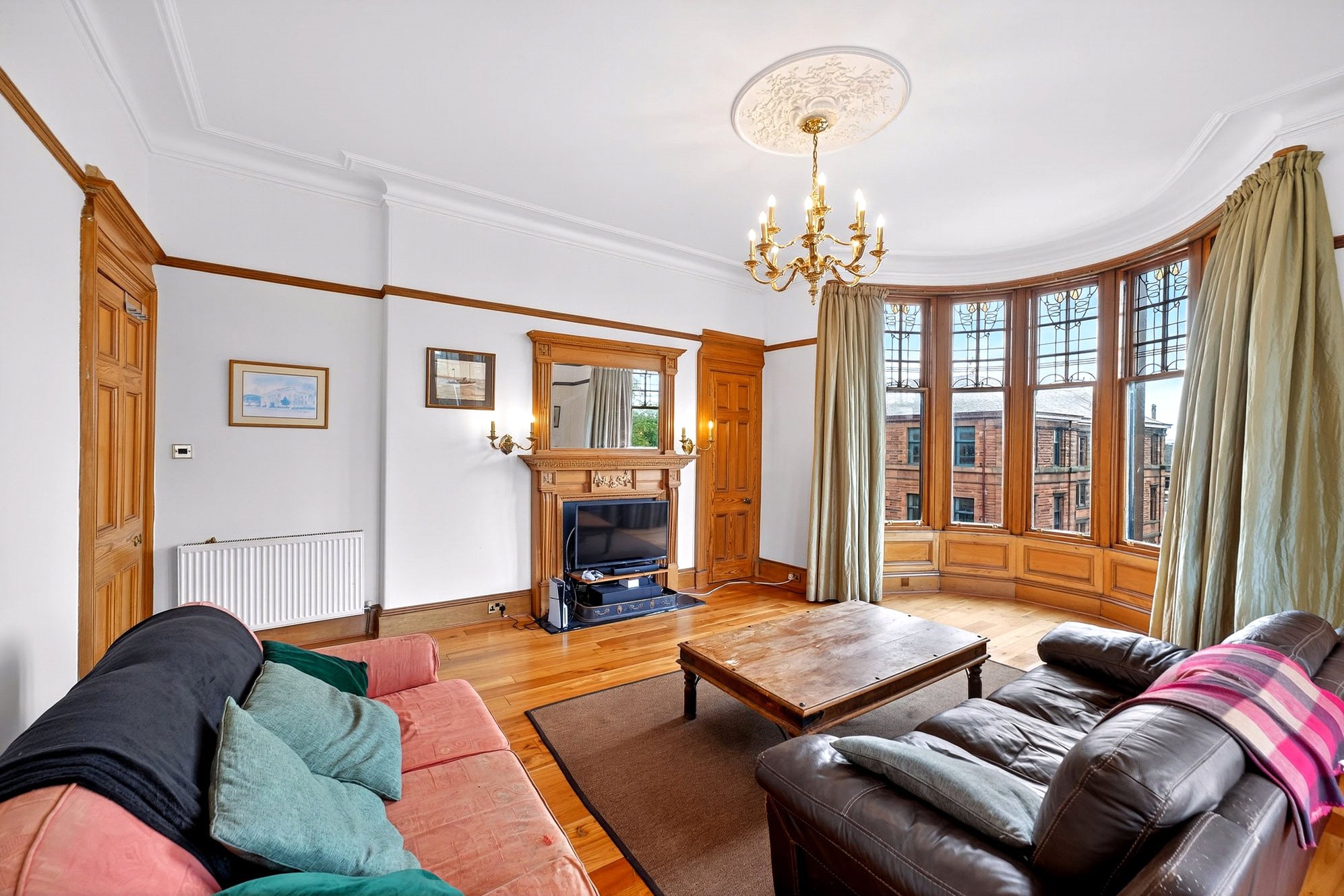 Internally, this is an exceptionally spacious, family-sized apartment filled with original features that have been lovingly maintained, resulting in a charming and versatile living space. Upon entering the accommodation through a beautiful front door with intricate stained glass, you arrive in a spectacular L-shaped grand reception hall that retains original hardwood decorative panelling, contrasting tartan carpeting, and in-keeping brass light fittings. This magnificent entrance area instantly hints at the property’s extensive floor area of 2,364 square feet and provides access to each of the principal rooms.