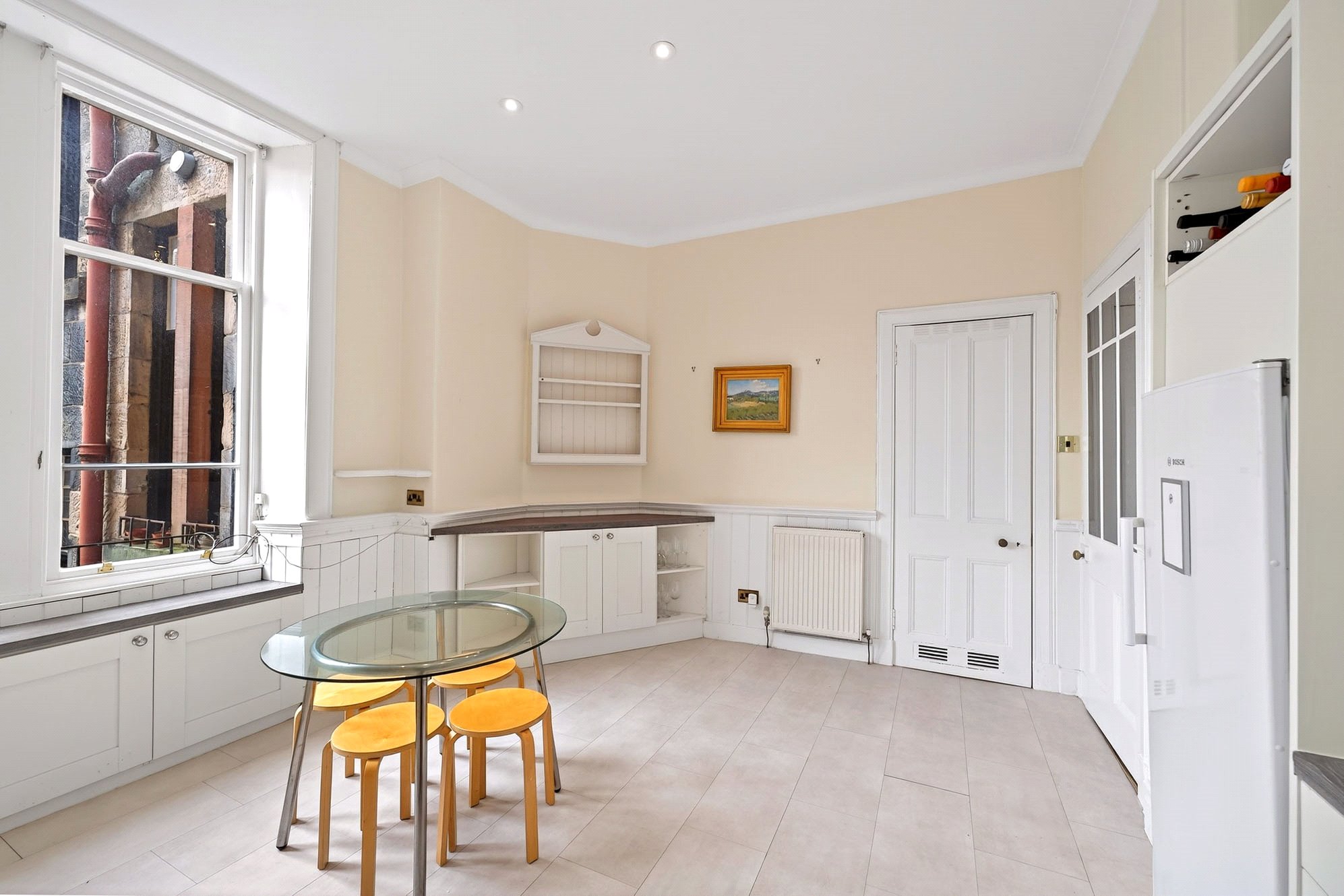 Many viewers will find the living room to be one of the most impressive elements of this property, with twin bow windows that flood the space with light, and a beautiful fireplace with a broad over-mantel mirror and a cast iron insert. The living room also enjoys some of the loveliest outlooks in the property, with wonderful views over the treetops of Dowanhill Park. The dining kitchen is of generous proportions, offering extensive wall and base-mounted units for storage, as well as a large pantry cupboard. The kitchen provides plenty of space for a six-seater dining table and is an ideal space for families to relax in for mid-week meals or weekend breakfasts. As you leave the kitchen, there is a plumbed utility cupboard to the right, complete with appliances.