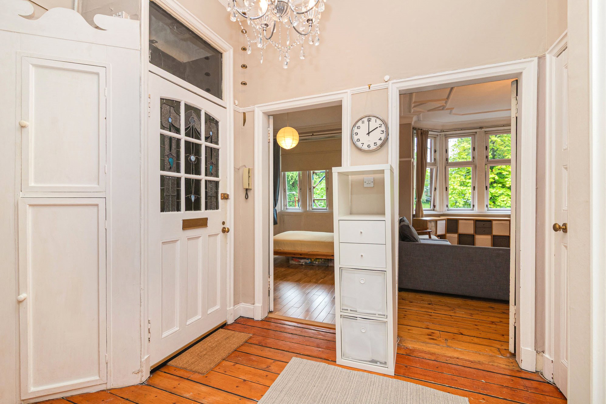 - Storm door entrance vestibule leading into broad and welcoming reception hall with wooden flooring and useful storage cupboard off